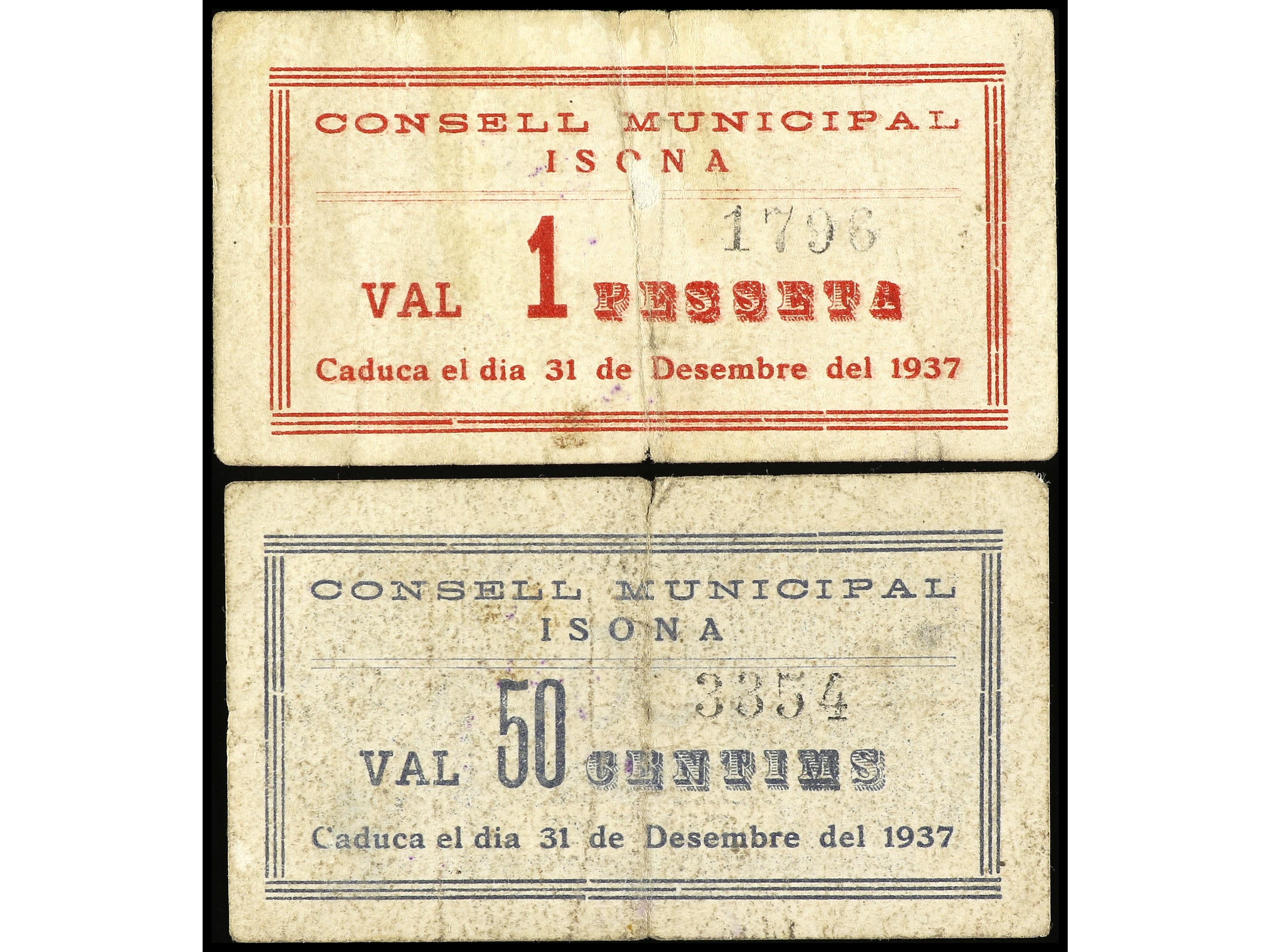 Lote 2 billetes 50 Cèntims y 1 Pesseta. C.M. d´ISONA. (Algo sucios). AT-1262, 1263. MBC-. (Image1) (Image2)