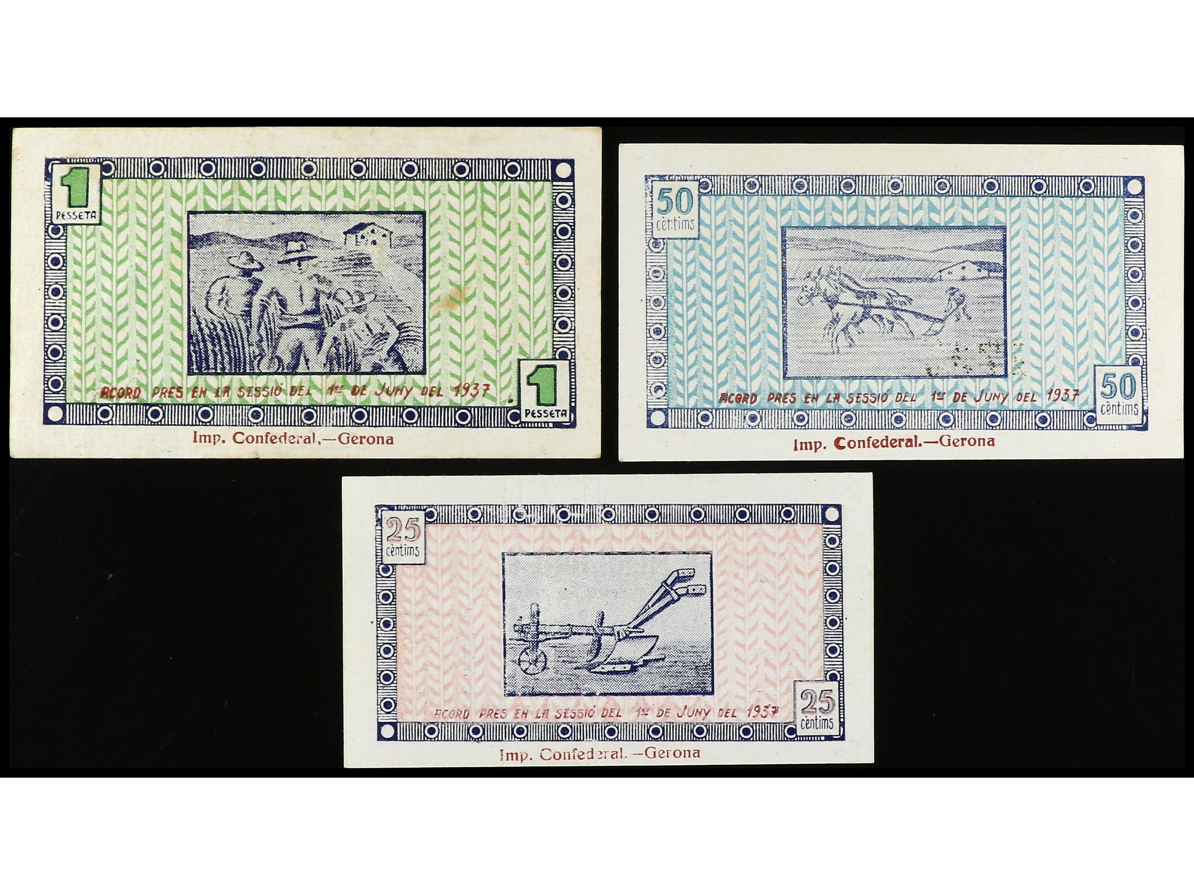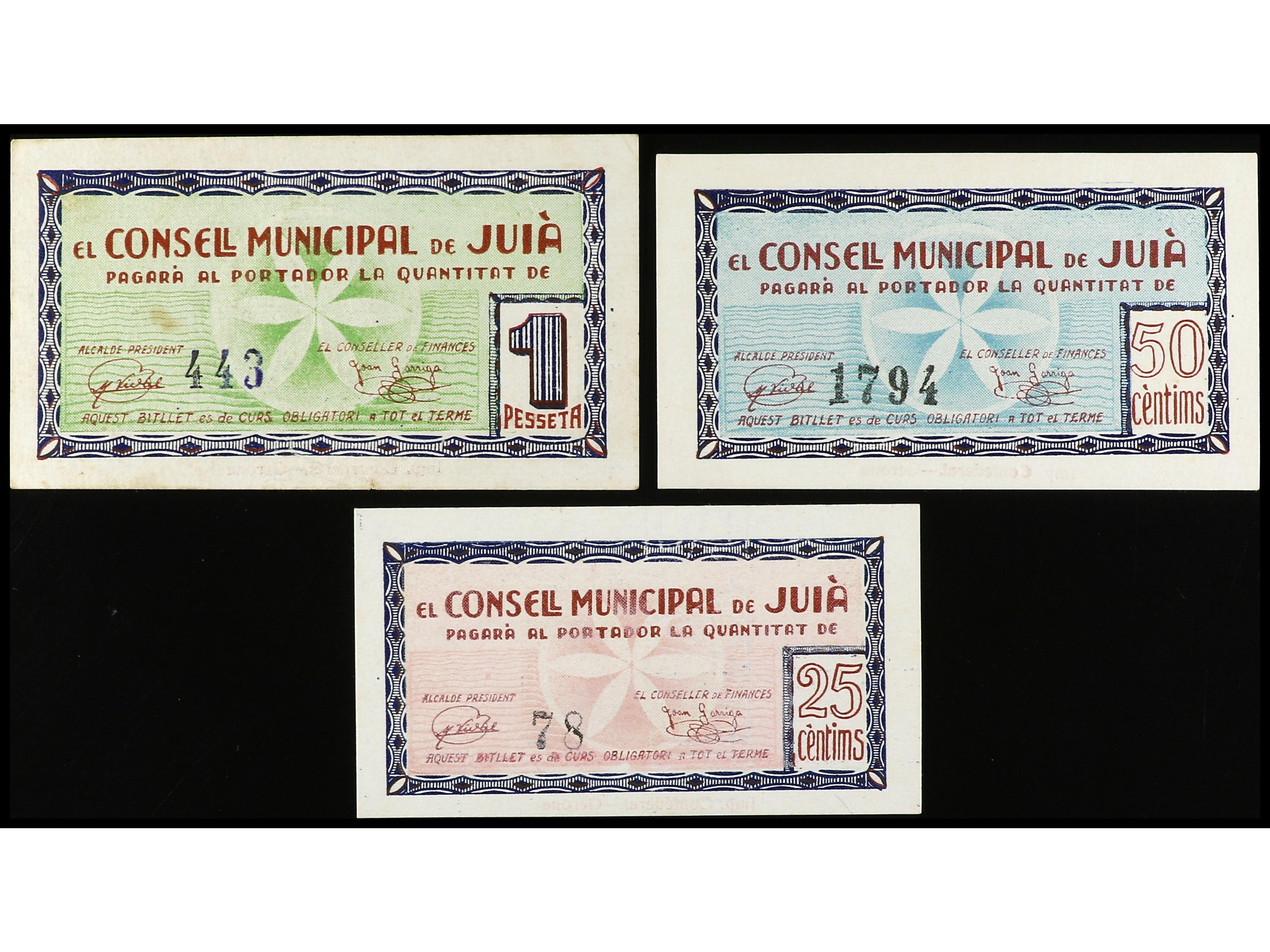 Lote 3 billetes 25, 50 Cèntims 1 Pesseta. 1er Juny 1937. C.M. de JUIÀ. AT-1284, 1285, 1286. EBC+ a SC. (Image1) (Image2)