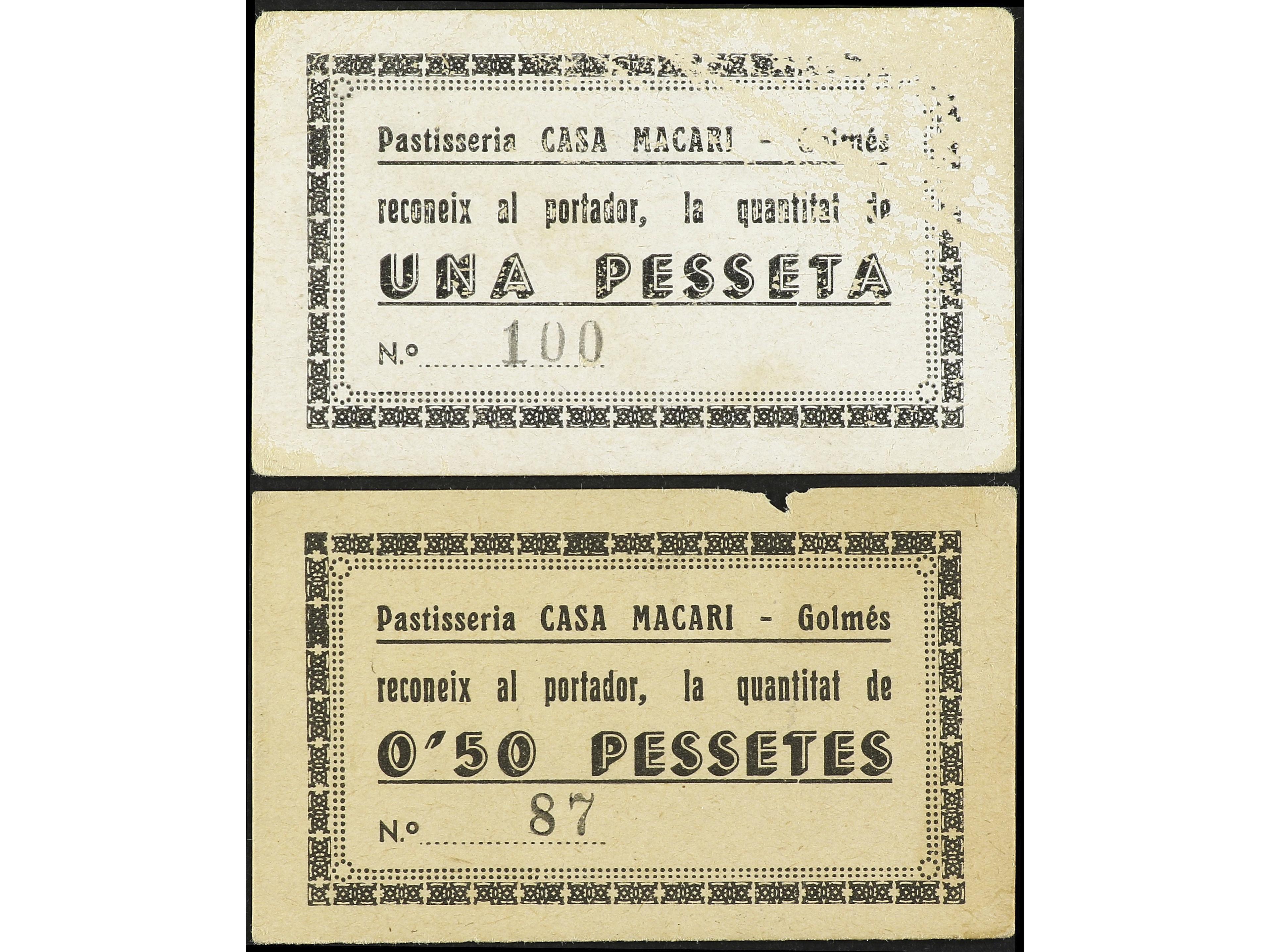 Lote 2 billetes 0,50 y 1 Pesseta. PASTISSERIA CASA MACARI. GOLMÉS. (Roturas). L-3427 y 3428; RGH-8072 y 8073. MBC+ a EBC-.