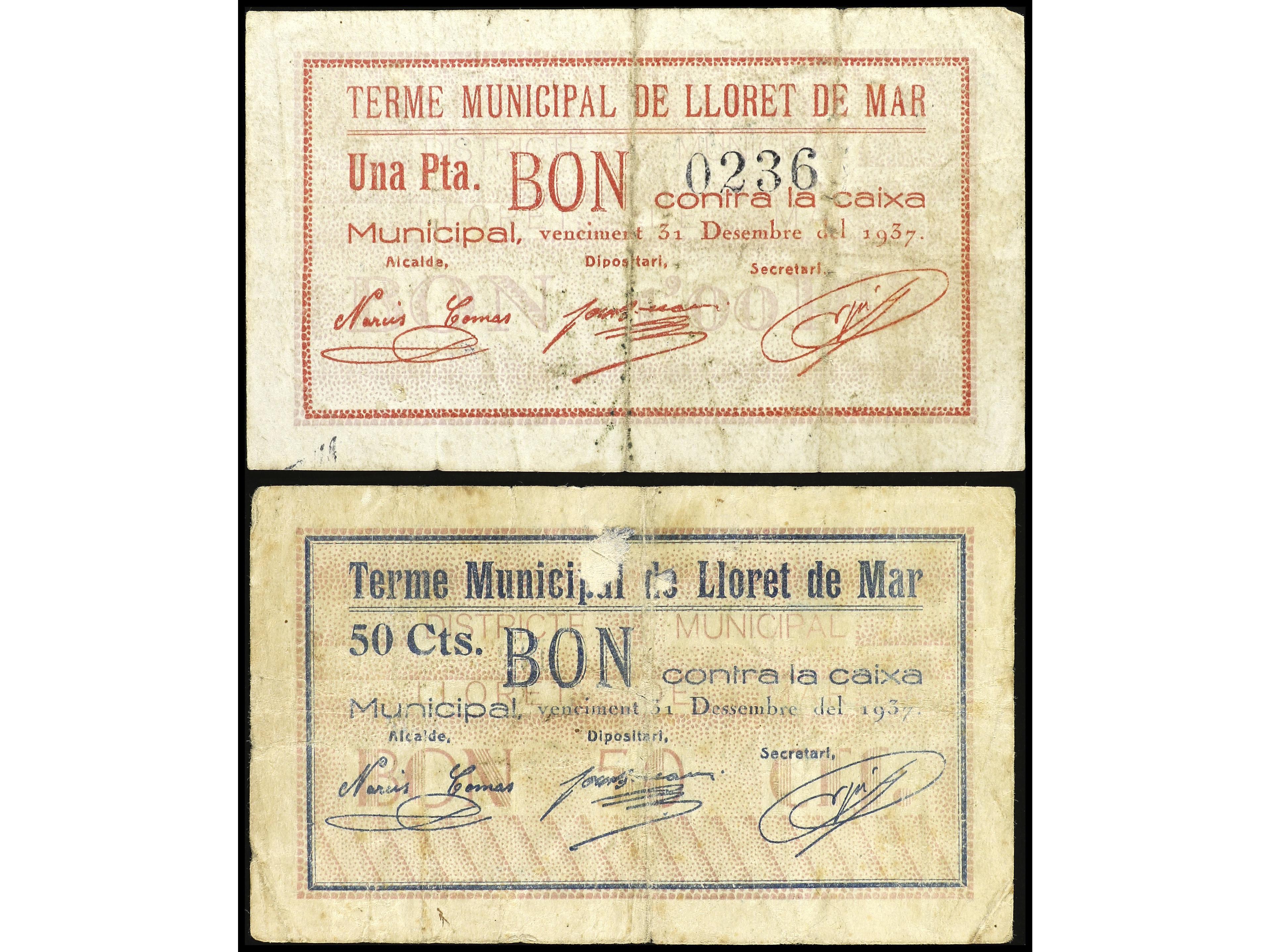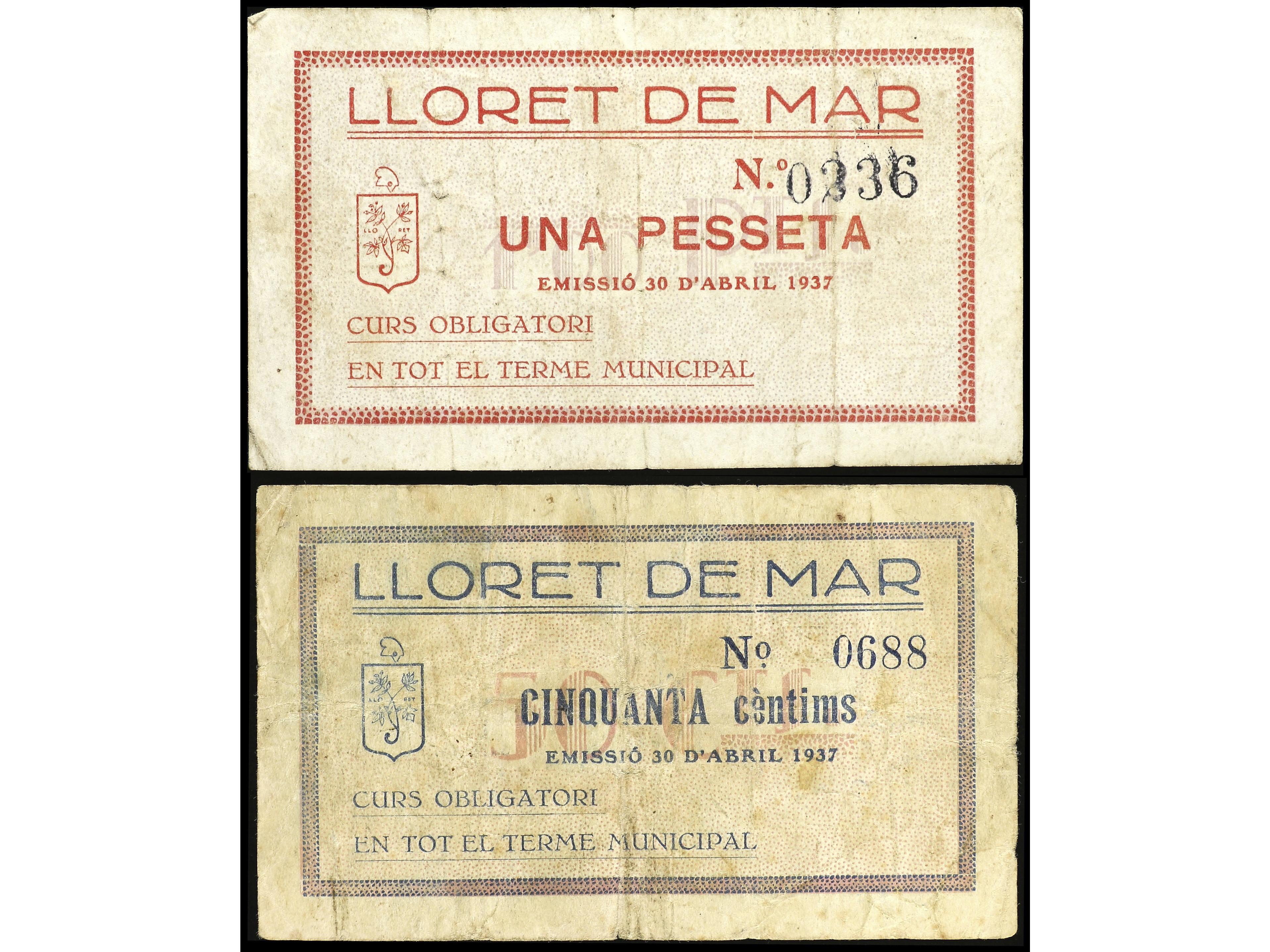 Lote 2 billetes 50 Cèntims y 1 Pesseta. 30 Abril 1937. Terme Municipal de LLORET DE MAR. AT-1373/74. MBC-. (Image1) (Image2)
