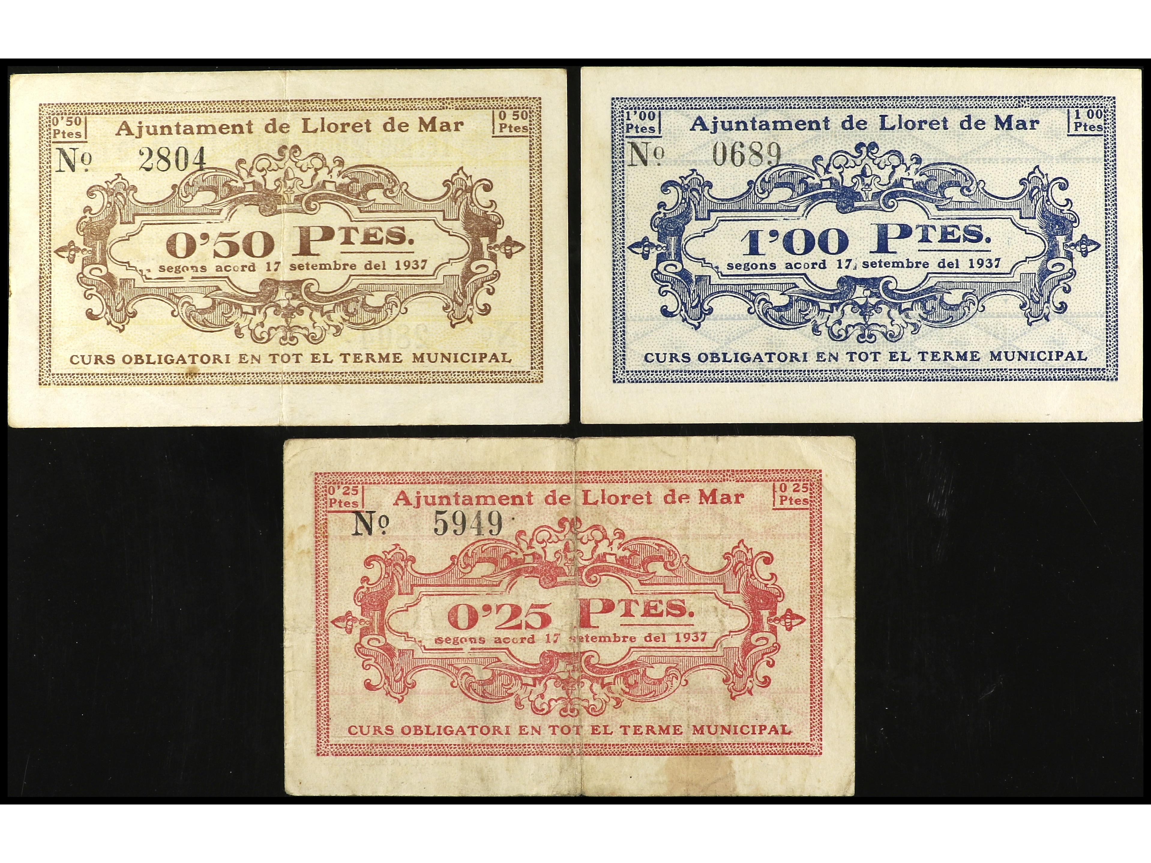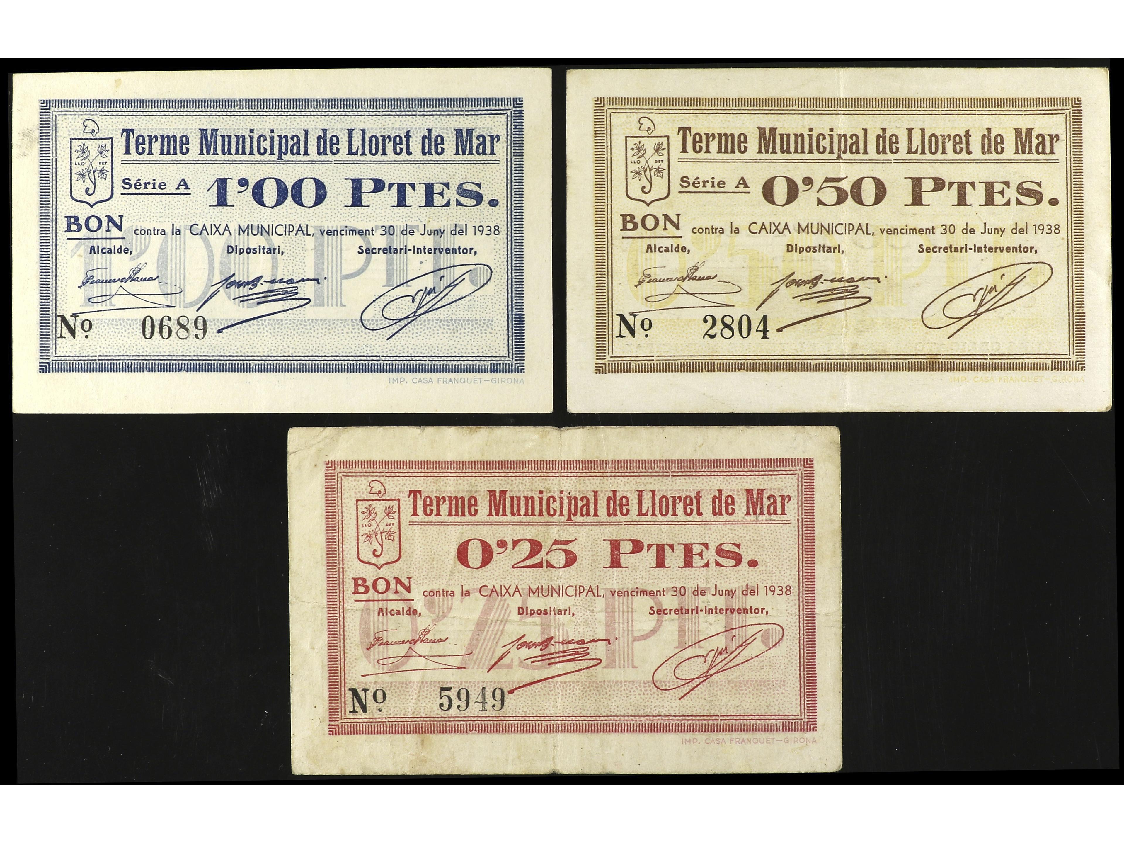 Lote de 3 billetes de 25, 50 Cèntims y 1 Pesseta. 30 Juny 1938. Terme Municipal de LLORET DE MAR Terme Municipal de LLORET DE MAR Terme Municipal de LLORET DE MAR. AT-1377/79. MBC- a EBC-. (Image1) (Image2)