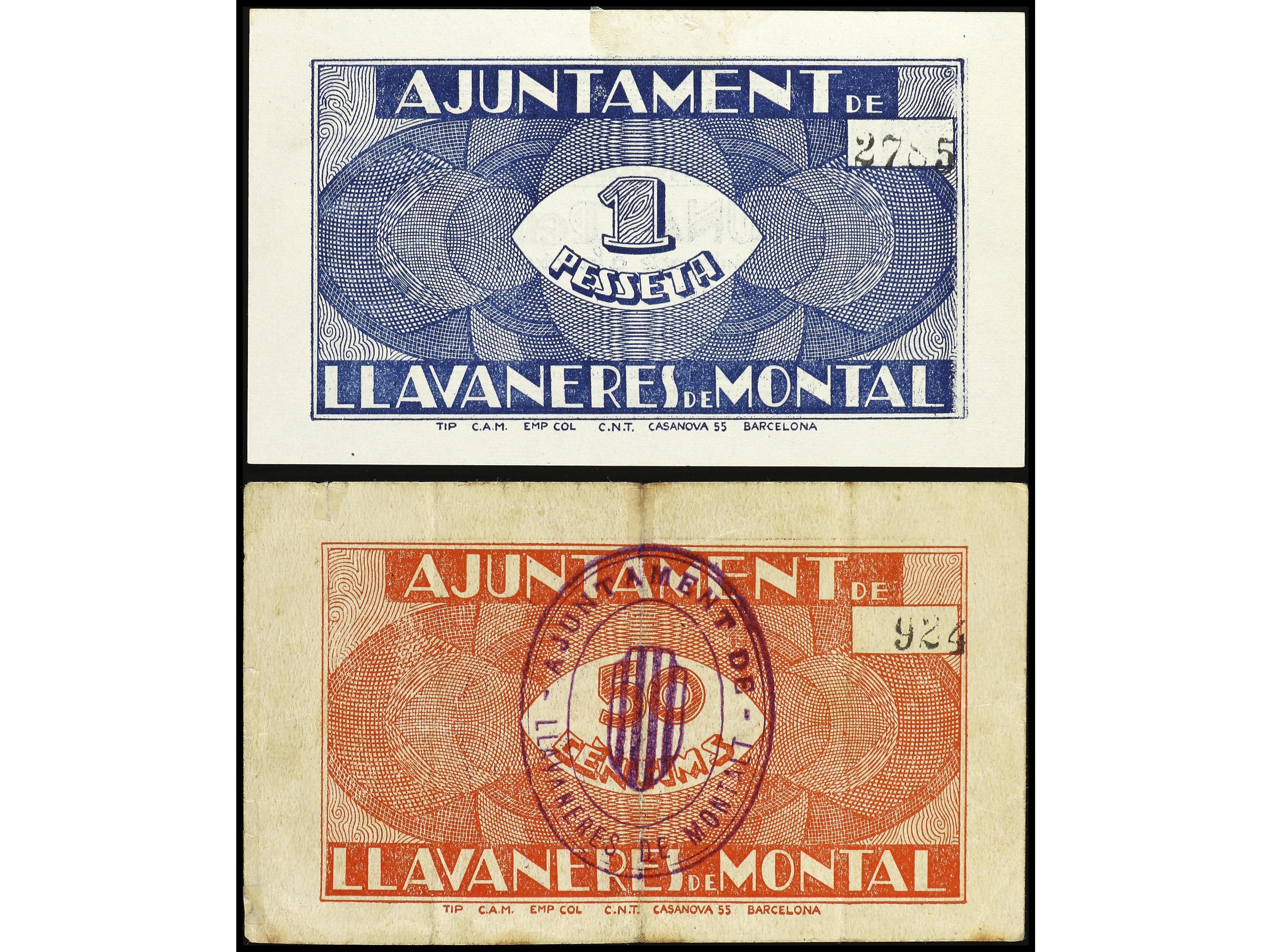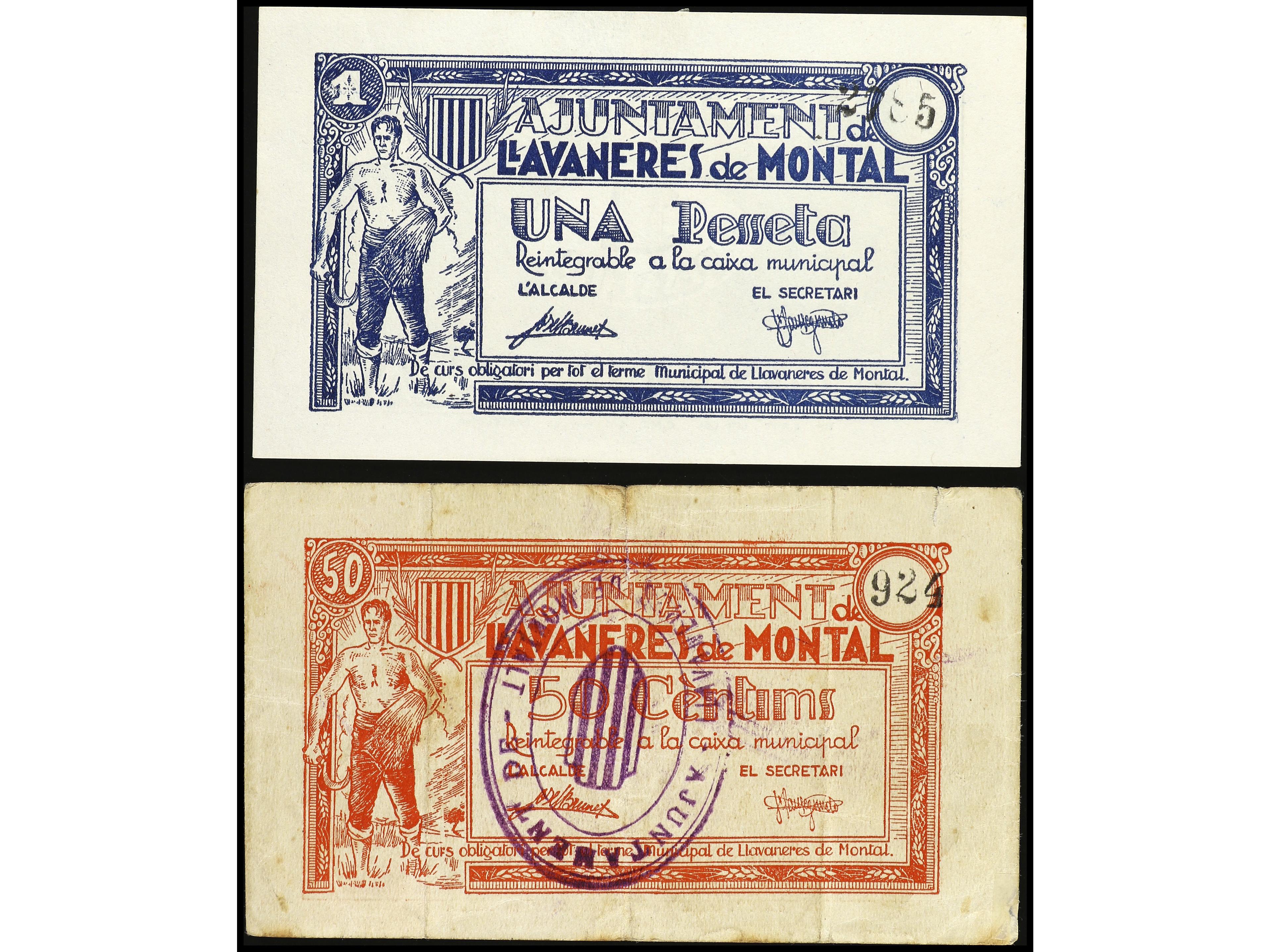Lote 2 billetes 50 Cèntims y 1 Pesseta. Aj. de LLAVANERES DE MONTAL. AT-1335a/1336. MBC a EBC-. (Image1) (Image2)