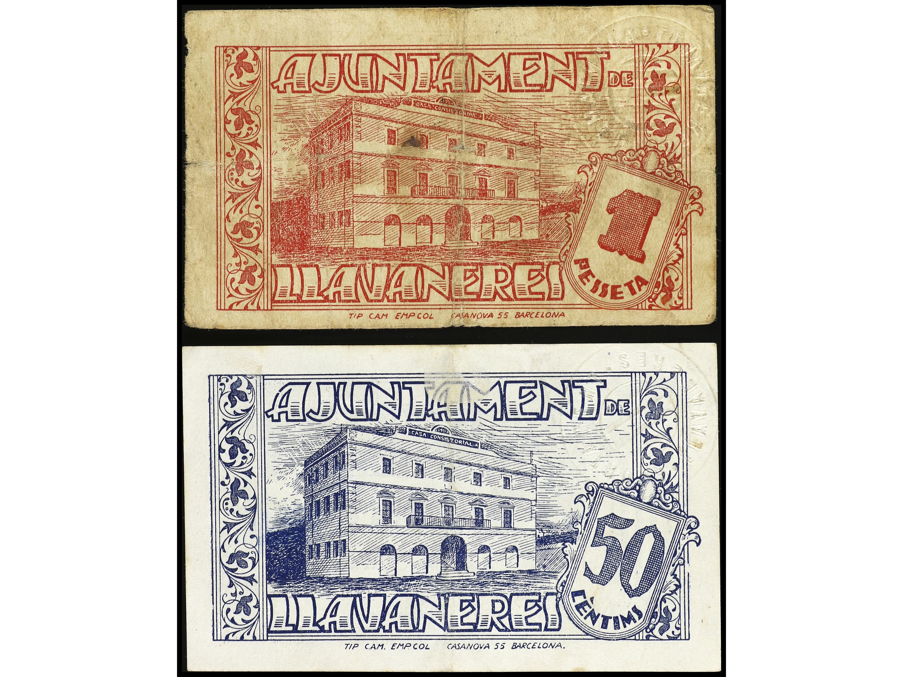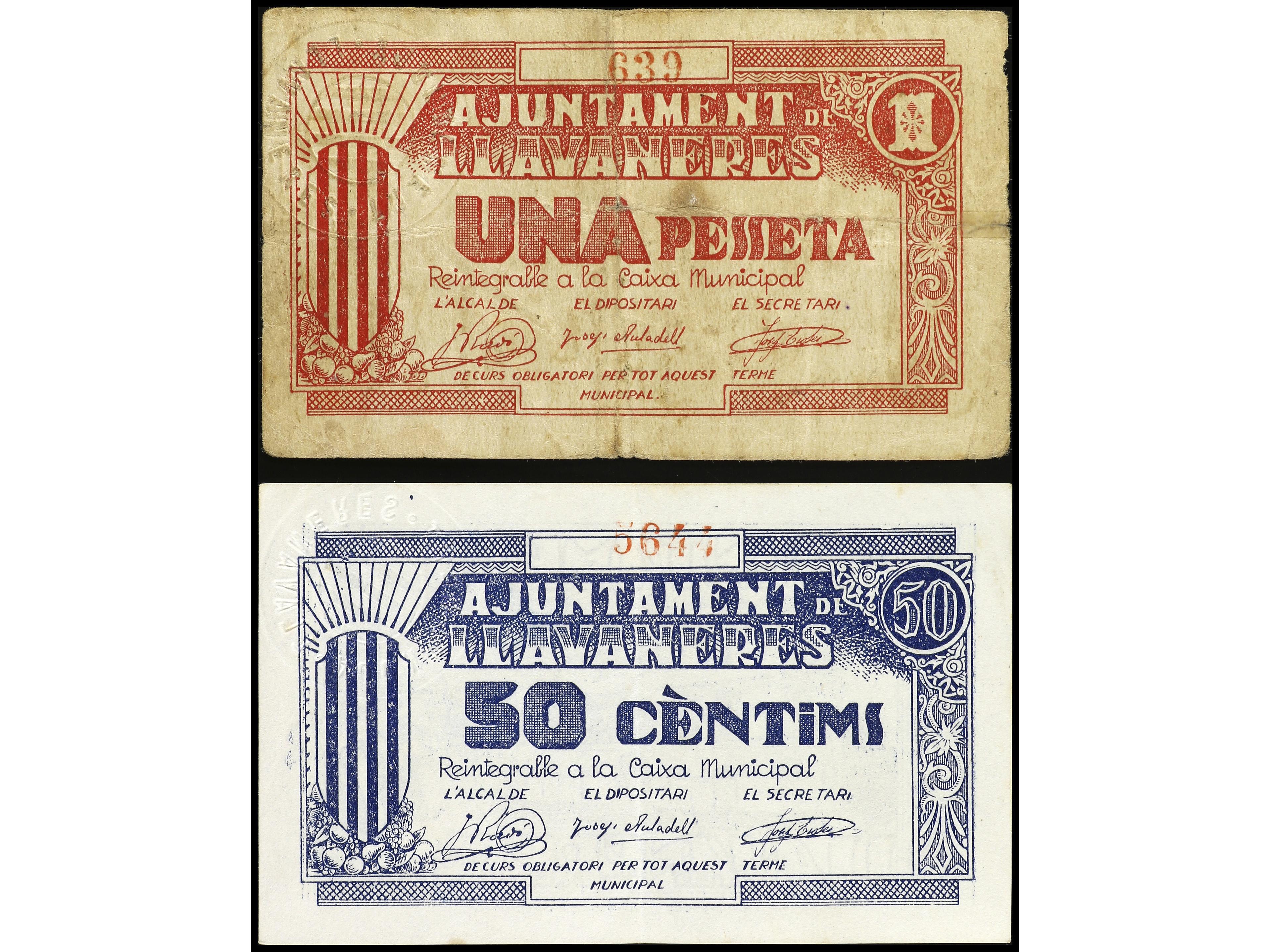 Lote 2 billetes 50 Cèntims y 1 Pesseta. Aj de LLAVANERES. AT-1333, 1334. MBC- y MBC+. (Image1) (Image2)