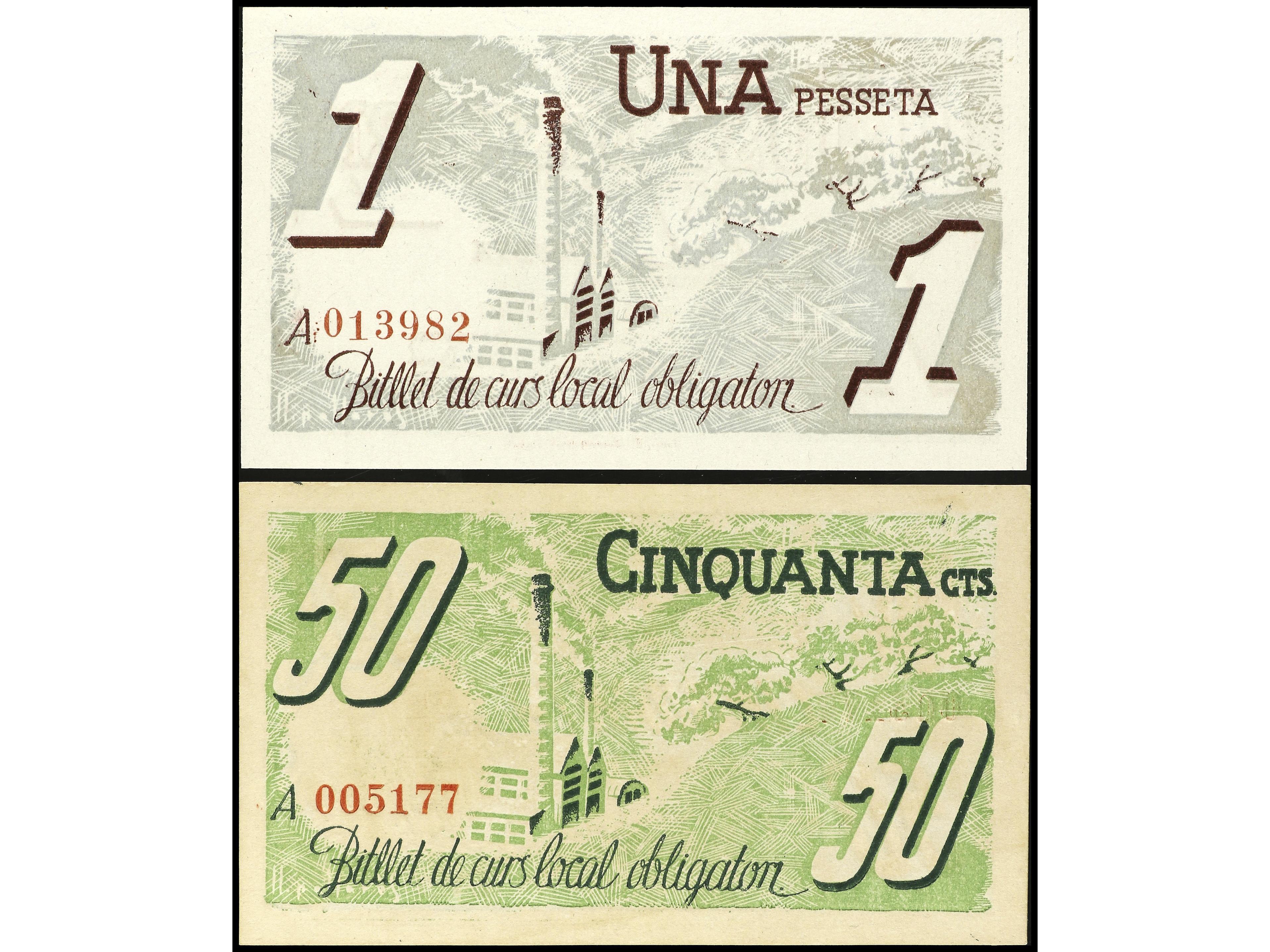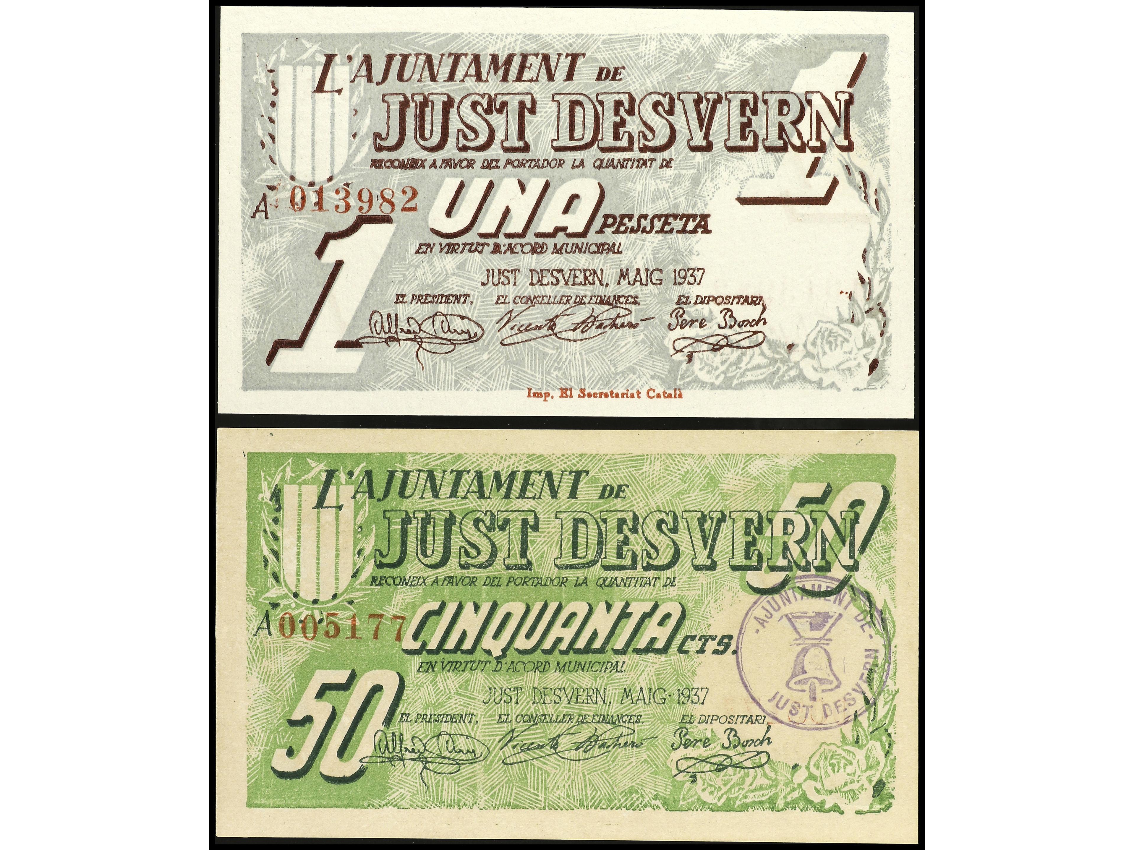 Lote 2 billetes 50 Cèntims y 1 Pesseta. Maig 1937. Aj. de JUST DESVERN. AT-1297c, 1298a. EBC. (Image1) (Image2)
