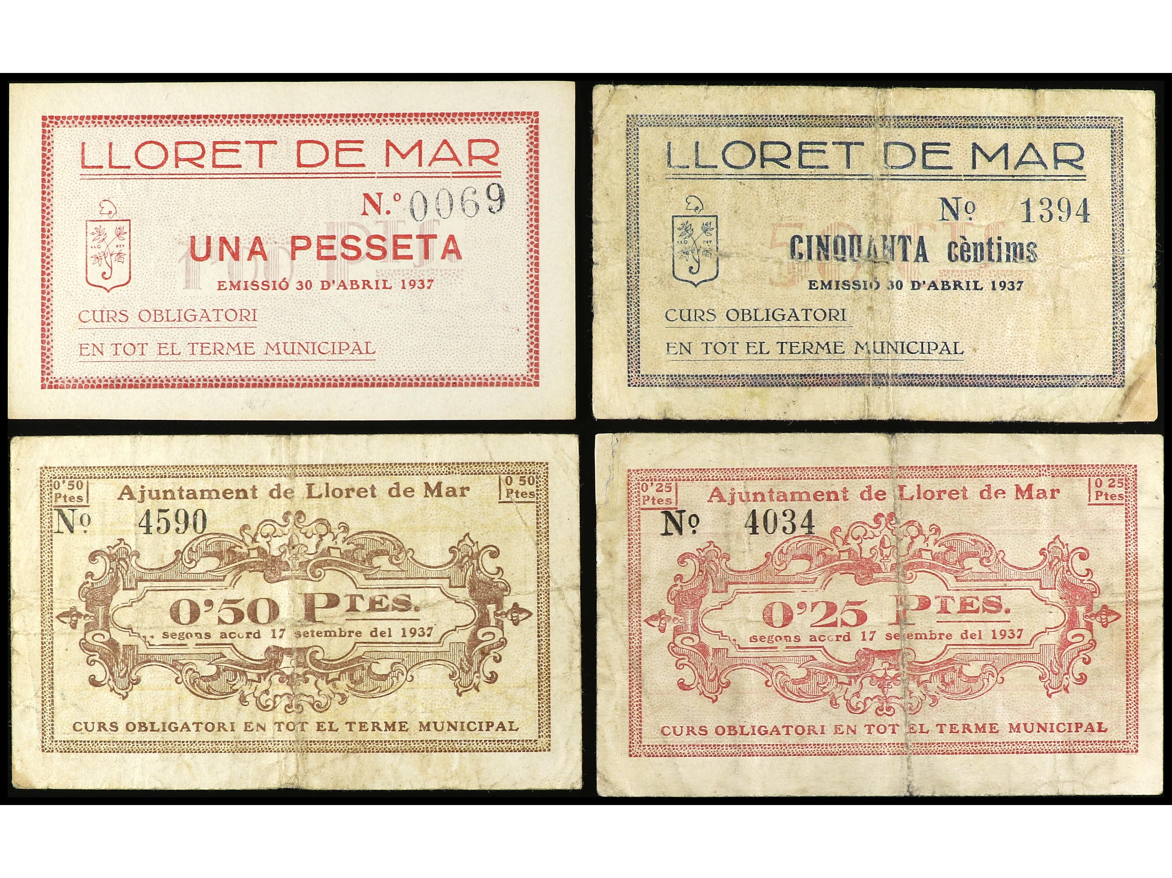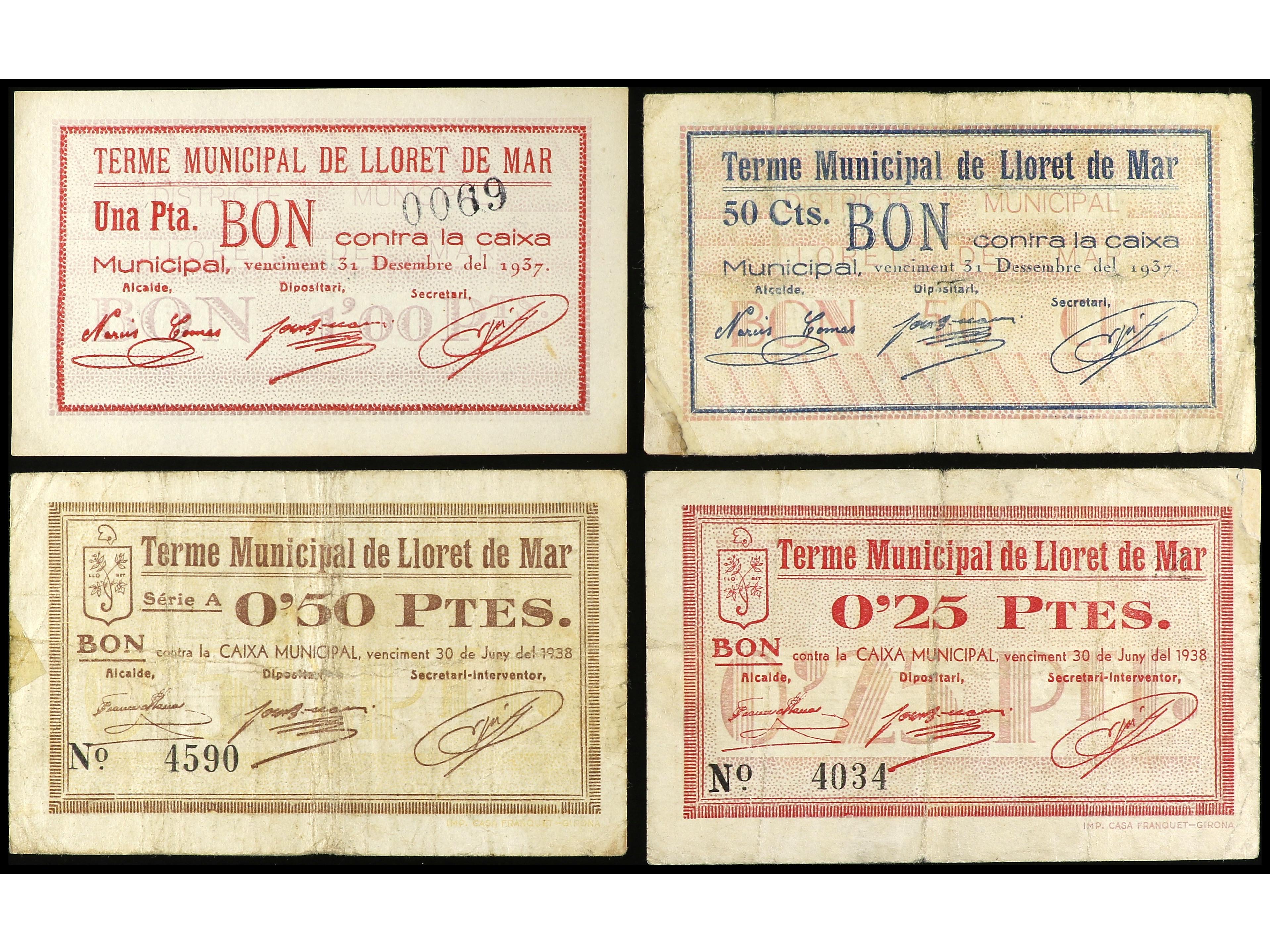 Lote 4 billetes 0,25, 0,50 (2) y 1 Pesseta. Terme Municipal de LLORET DE MAR. AT-1375, 1376, 1378, 1379. MBC- a EBC-. (Image1) (Image2)