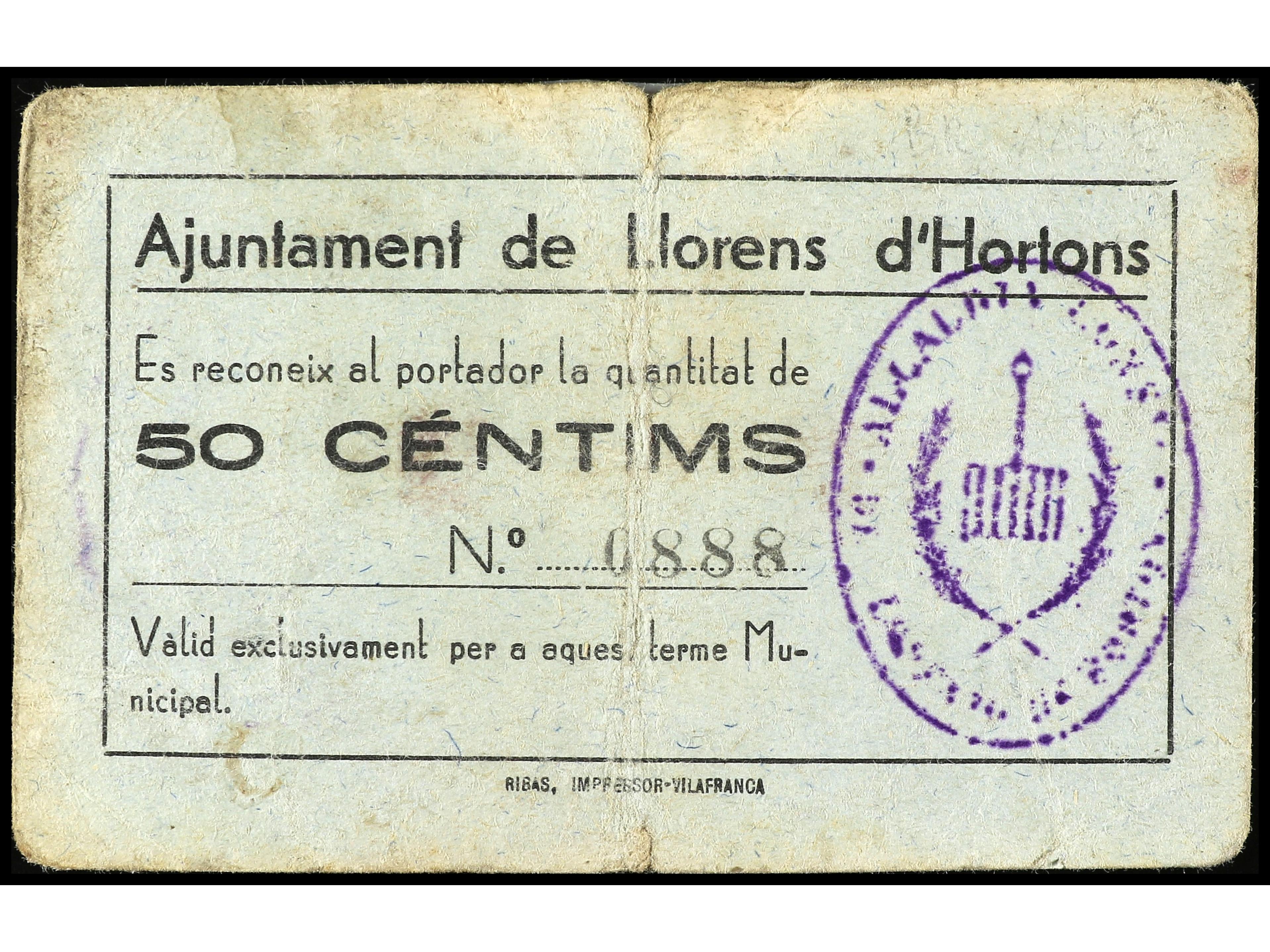 50 Cèntims. Aj. de LLORENS D´HORTONS. (Roturas y adhesivo). RARO. AT-1366. BC+. (Image1) (Image2)