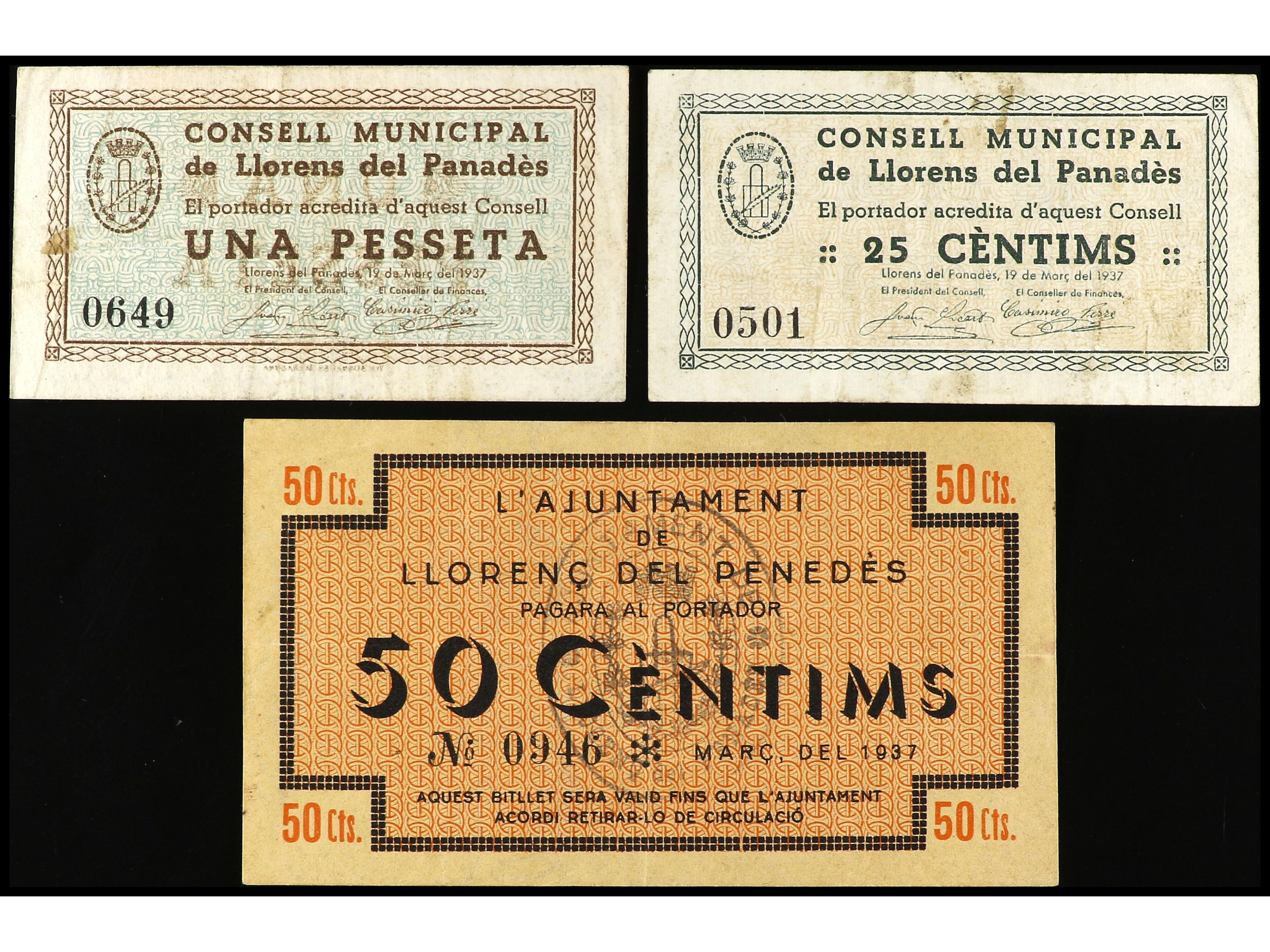 Lote 3 billetes 25, 50 Cèntims y 1 Pesseta. Març 1937. Aj. de LLORENÇ DEL PENEDÈS y C.M. de LLORENS DEL PANADÈS. AT-1369, 1370, 1371. MBC+ a EBC-. (Image1) (Image2)