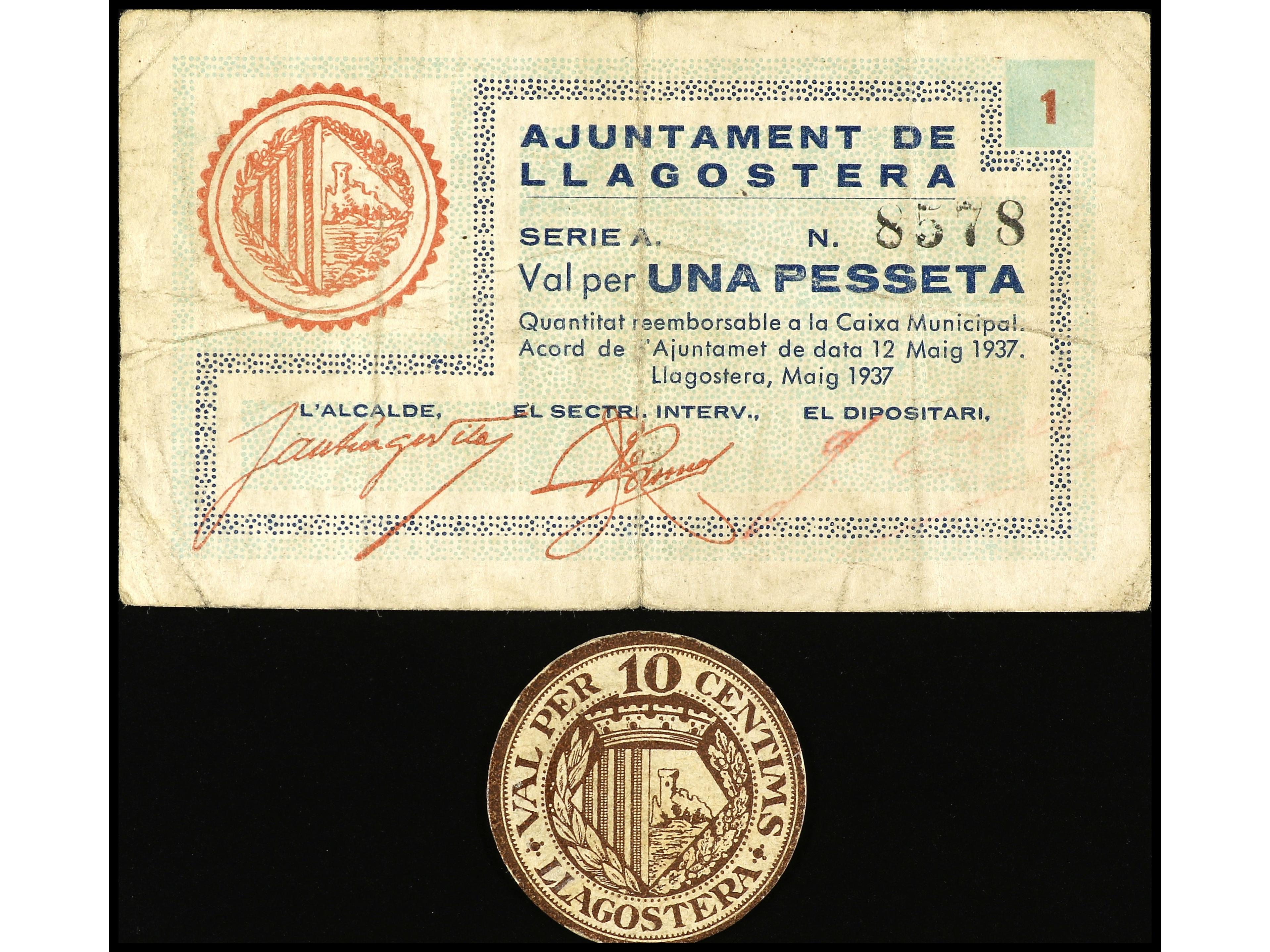 Lote 2 billetes 10 Cèntims y 1 Pesseta. Aj. de LLAGOSTERA. AT-1322, 1325. MBC- y EBC. (Image1) (Image2)