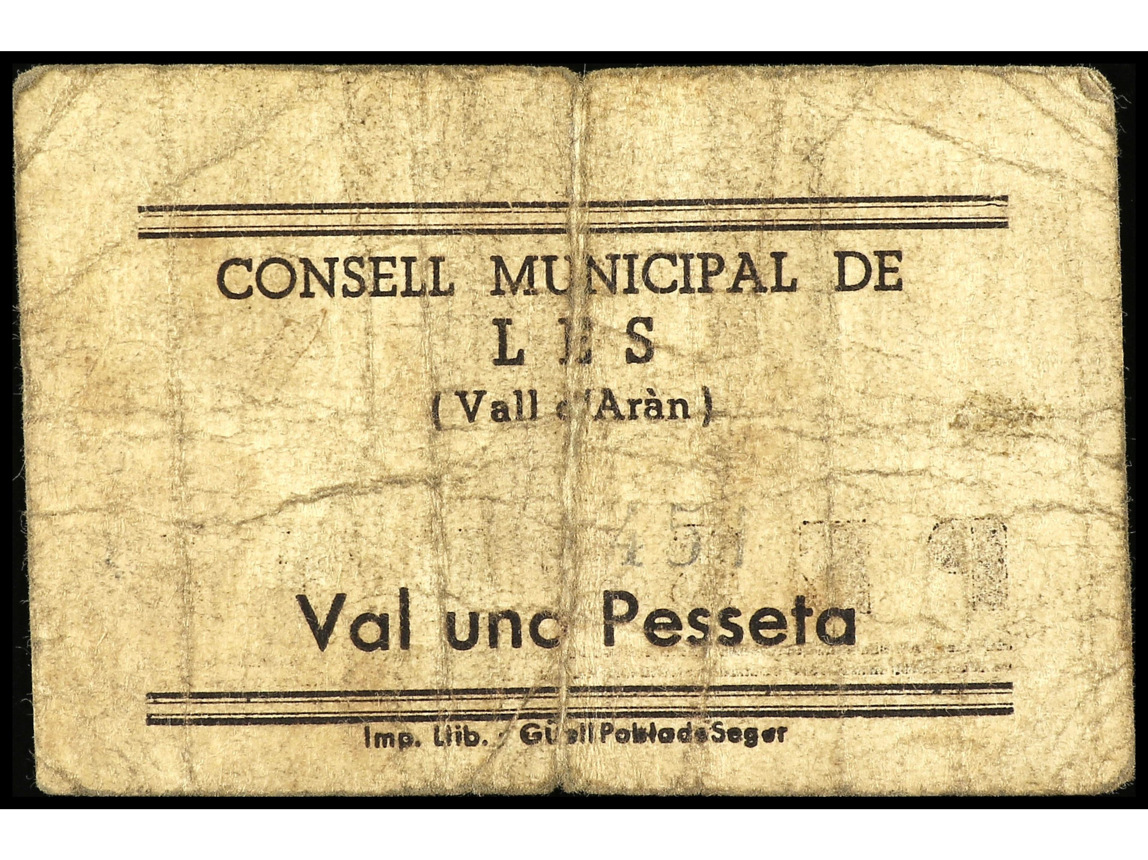 1 Pesseta. C.M. de LES (VALL D´ ARAN). (Roturas). MUY ESCASO. AT-1301. BC+. (Image1) (Image2)