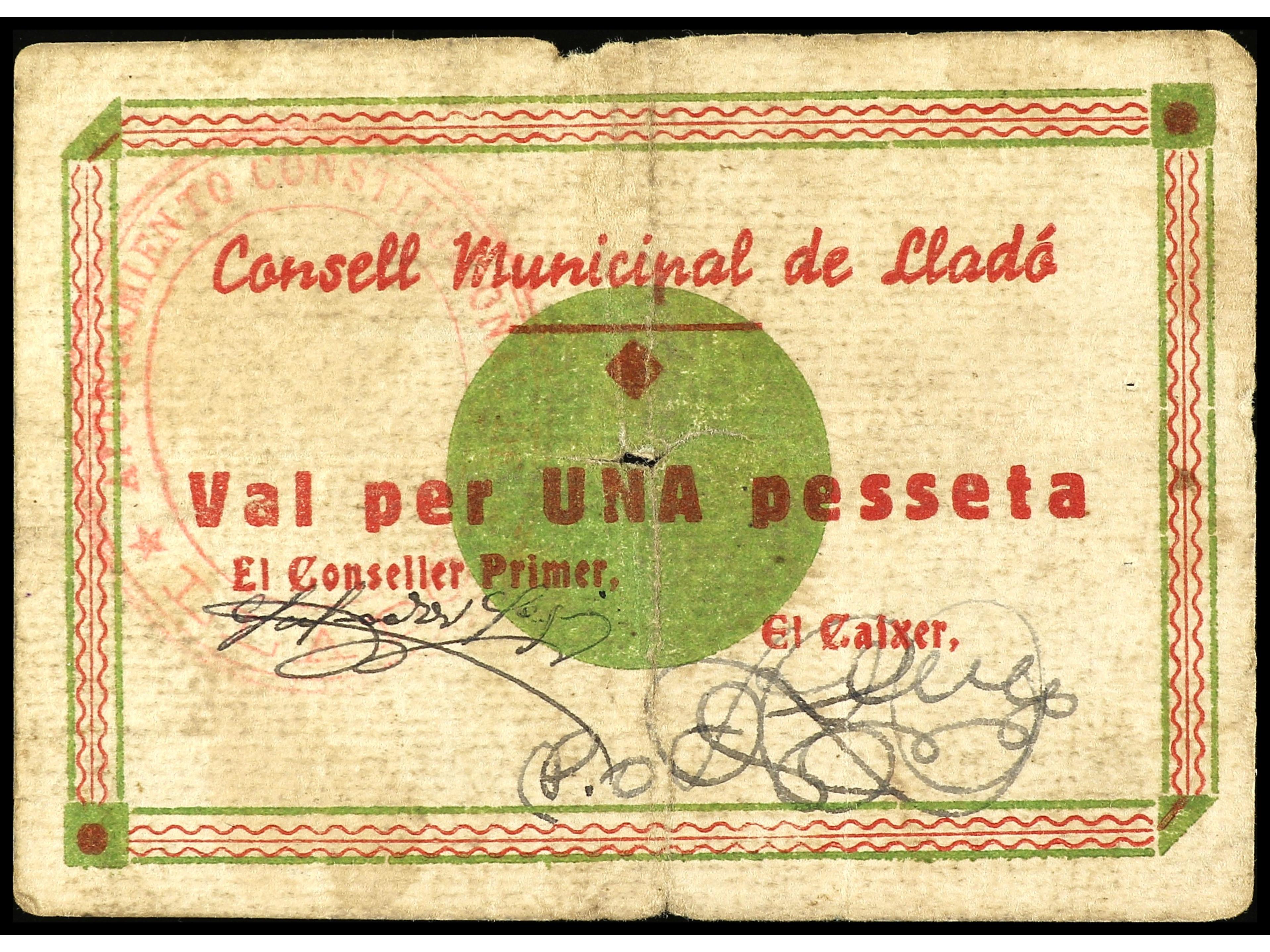 1 Pesseta. Abril 1937. C.M. de LLADÓ. (Roturas). MUY ESCASO. AT-1318. BC+. (Image1) (Image2)