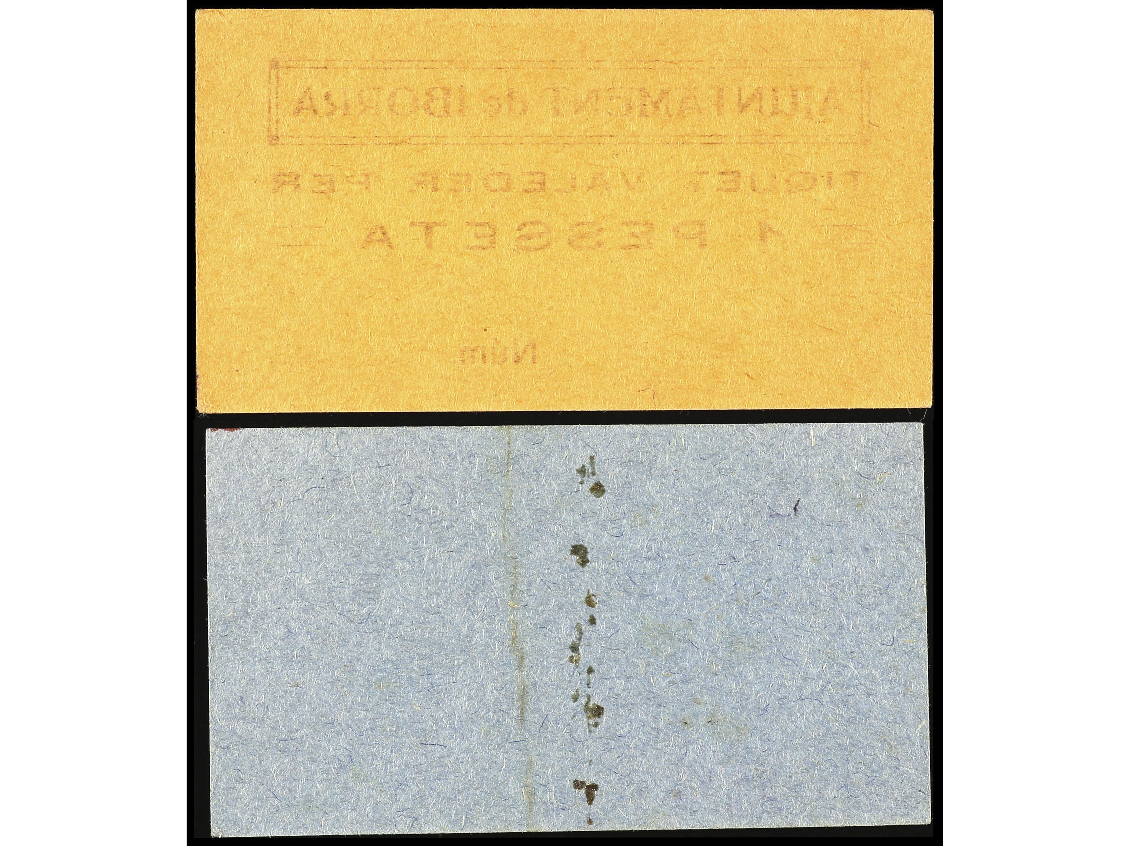 Lote 2 billetes 50 Cèntims y 1 Pesseta. Aj. d´IBORRA. Cartón. RAROS. AT-1271, 1272a. EBC+. (Image1) (Image2)