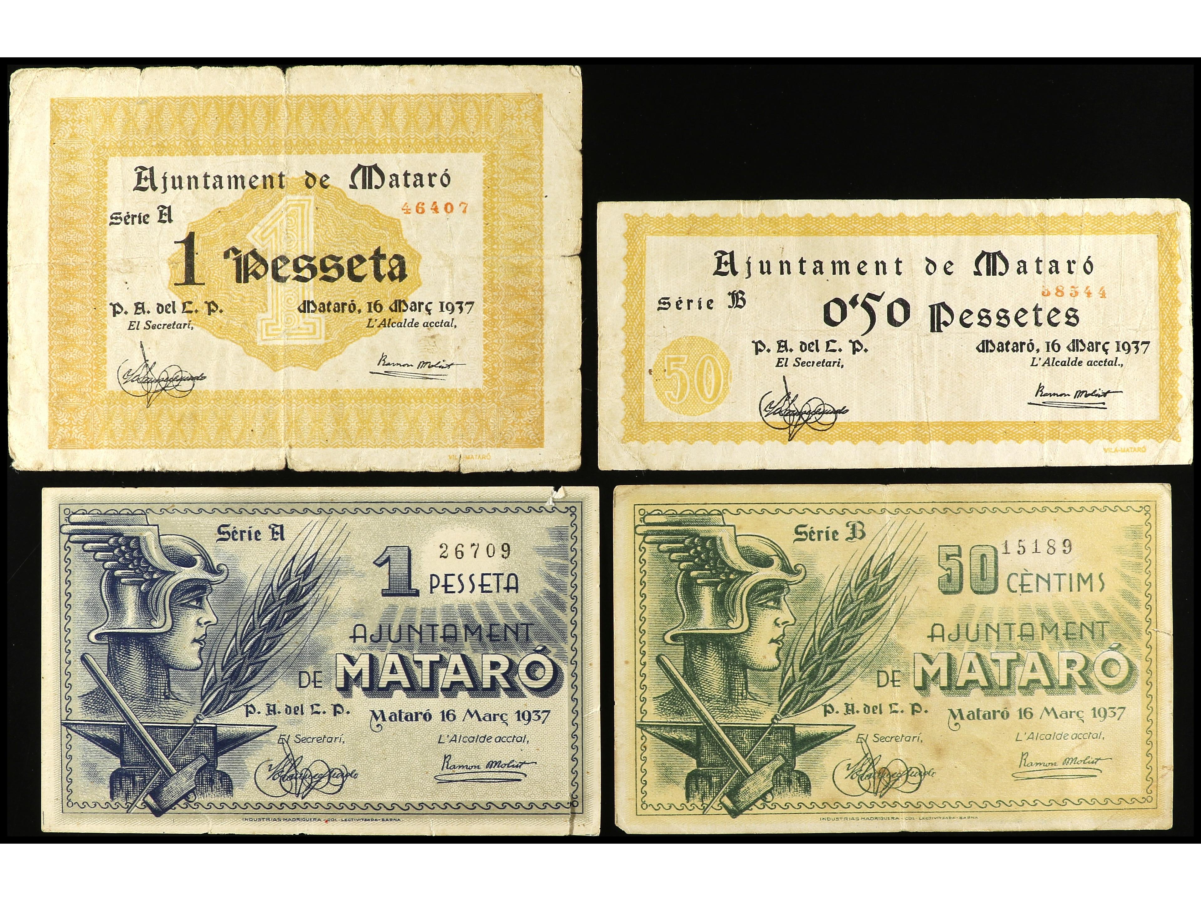 Lote 4 billetes 0,50 pessetes, 50 Cèntims y 1 Pesseta (2). 16 Març 1937. Aj. de MATARÓ. AT-1487, 1488b, 1489, 1490. MBC- a MBC.