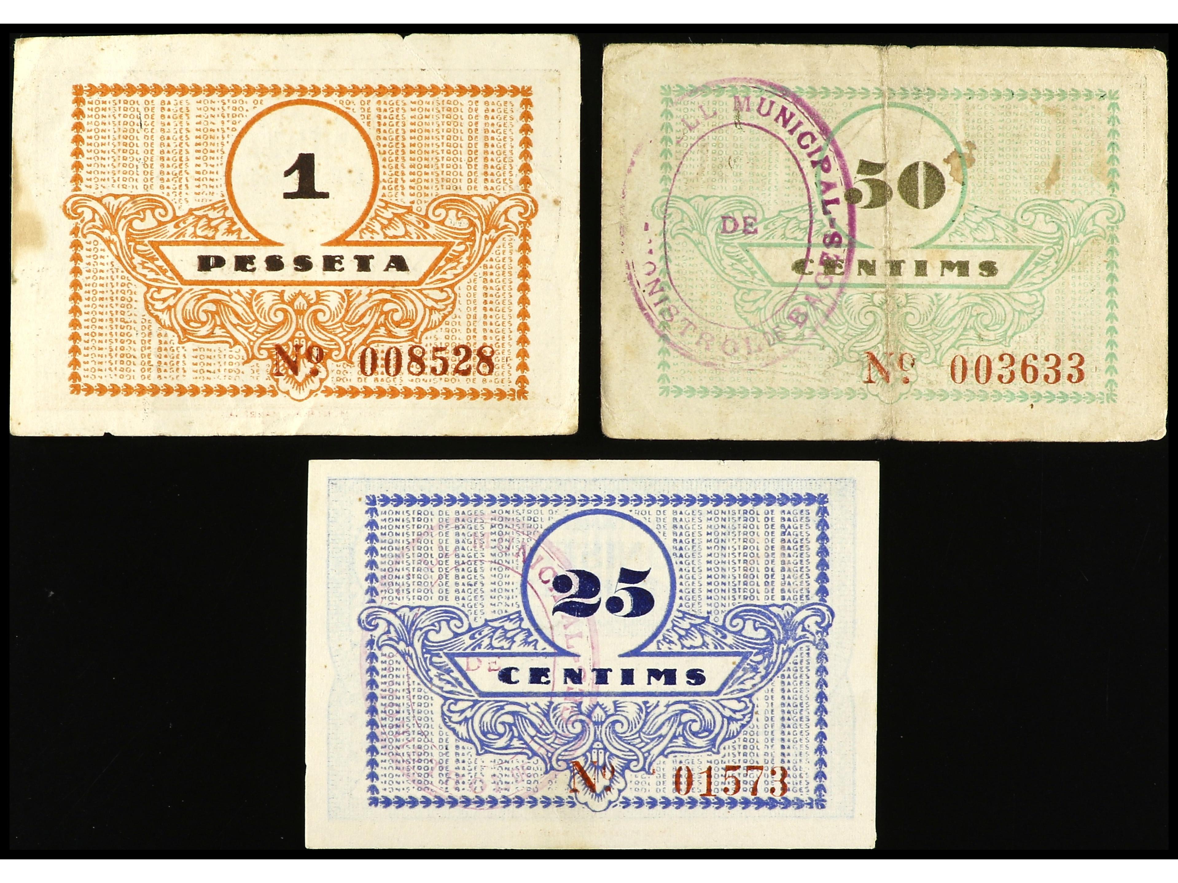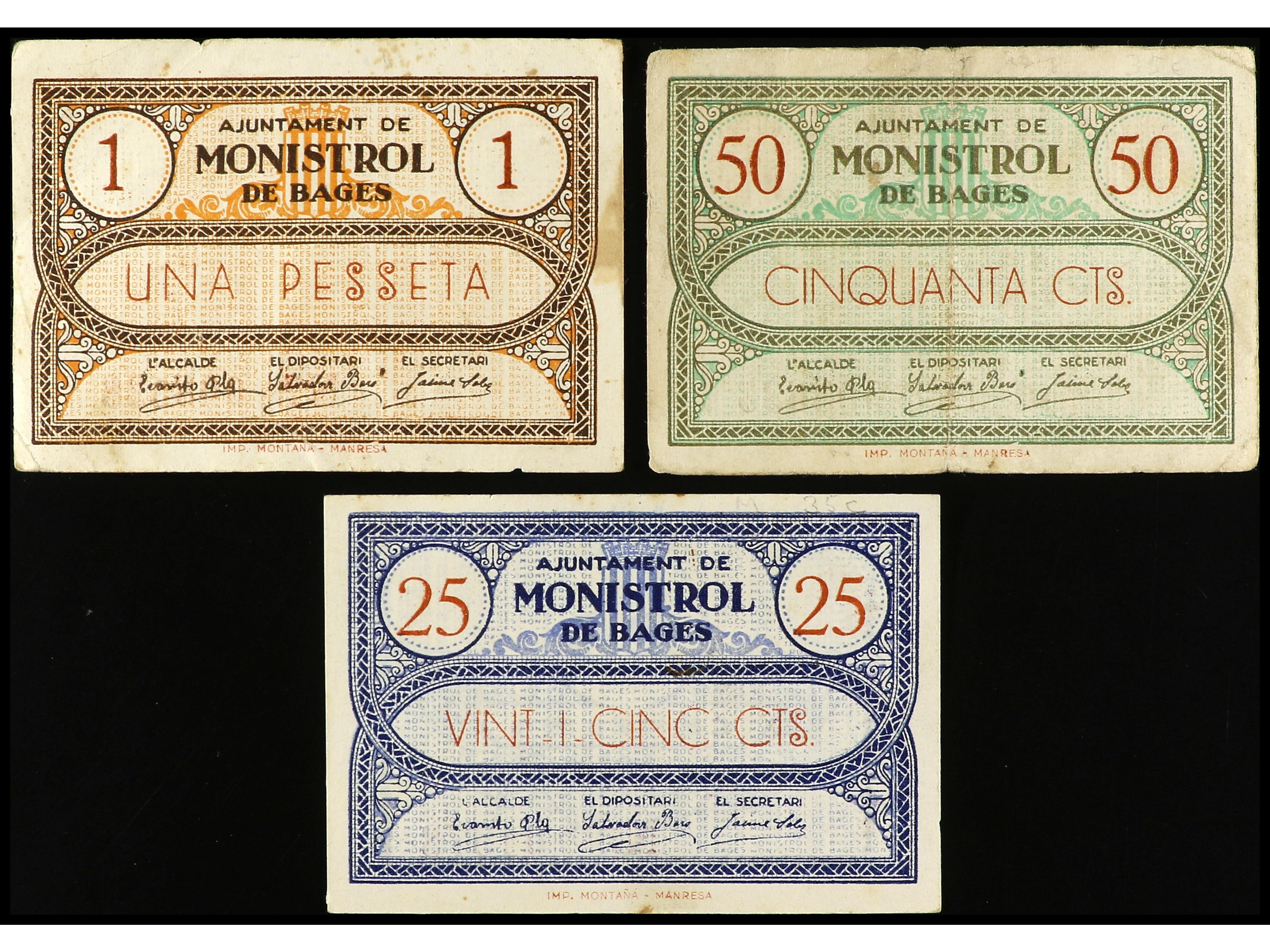 Lote 3 billetes 25, 50 Cèntims y 1 Pesseta. Aj. de MONISTROL DE BAGES. AT-1523, 1524, 1525. MBC a EBC-. (Image1) (Image2)