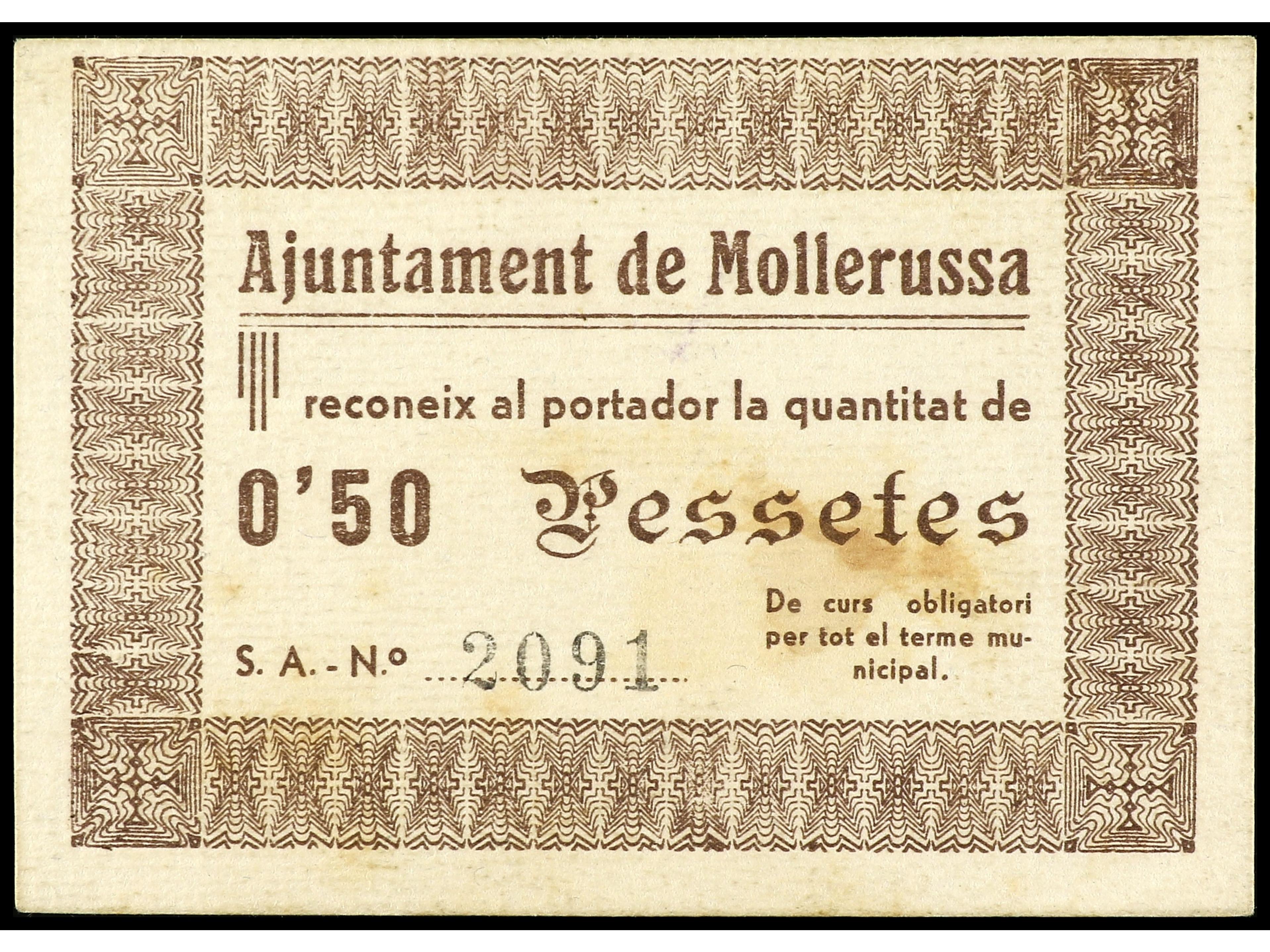 50 Cèntims. Aj. de MOLLERUSSA. Cartón. RARO. AT-1513. EBC-. (Image1) (Image2)