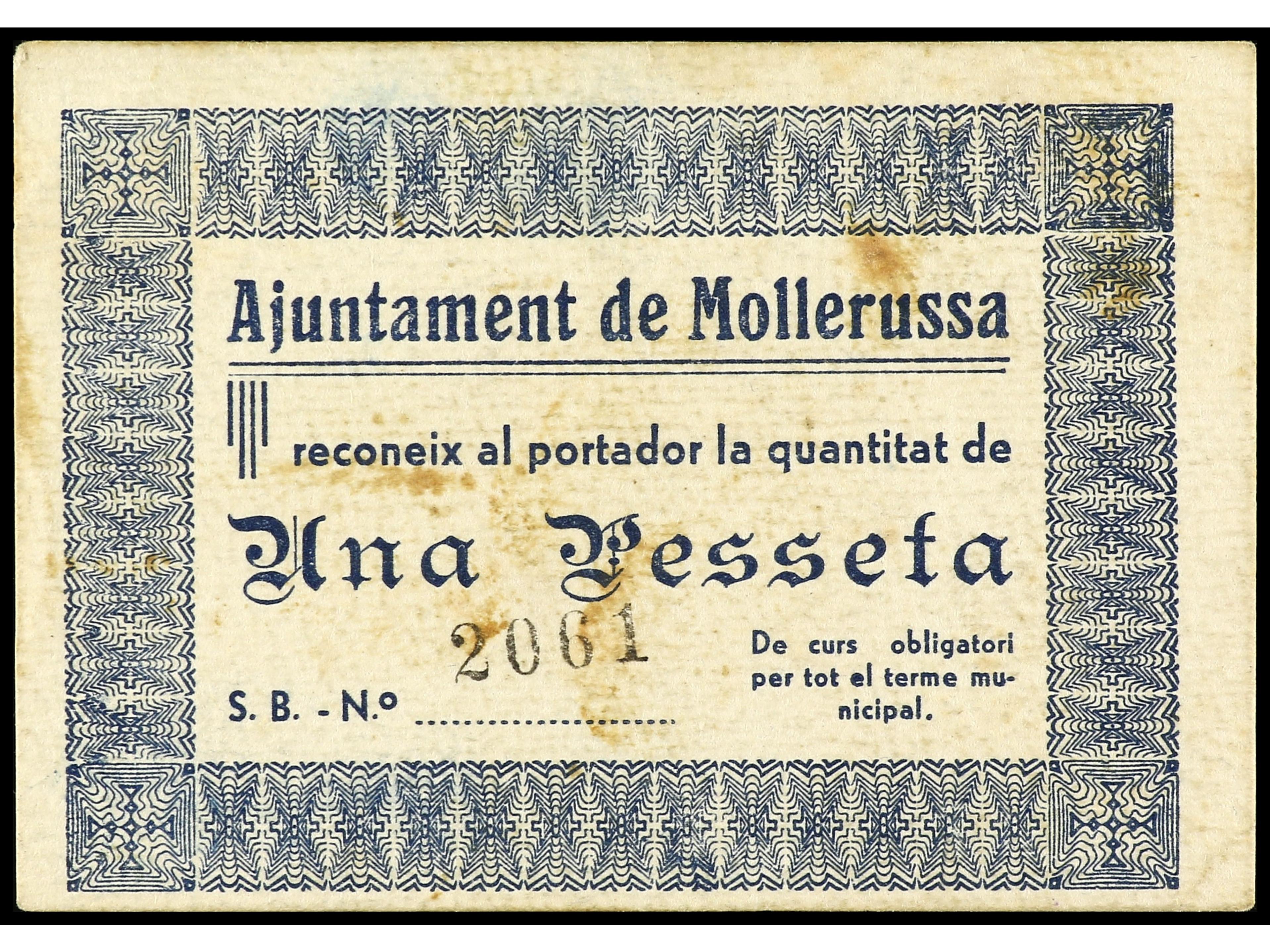 1 Pesseta. Aj. de MOLLERUSSA. Cartón. (Manchitas). RARO. AT-1512. EBC-. (Image1) (Image2)