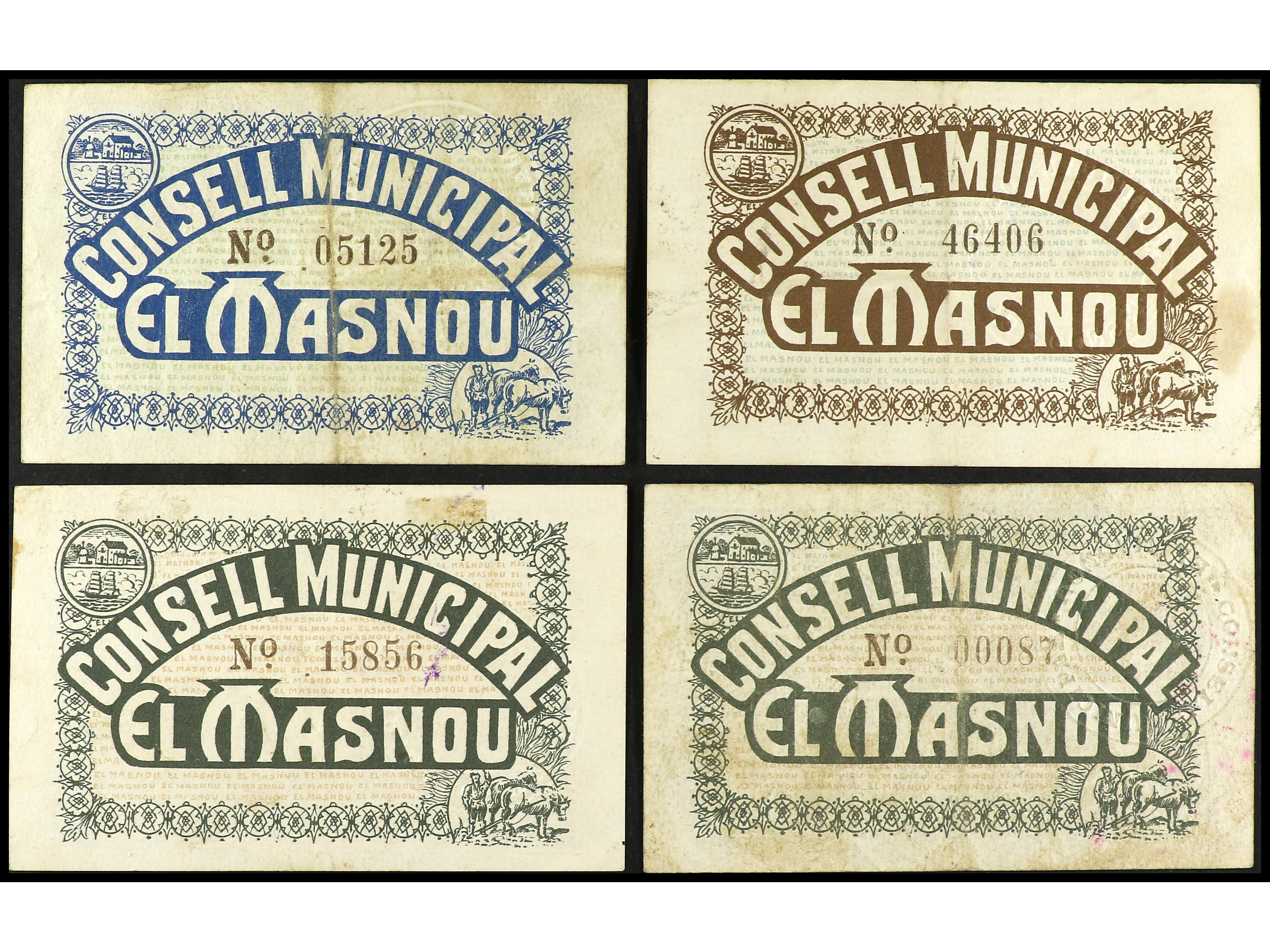 Lote 4 billetes 25 (2), 50 Cèntims y 1 Pesseta. C.M. d´ EL MASNOU. A EXAMINAR. AT-1466b, 1467c, 1468, 1468h. MBC a EBC-.
