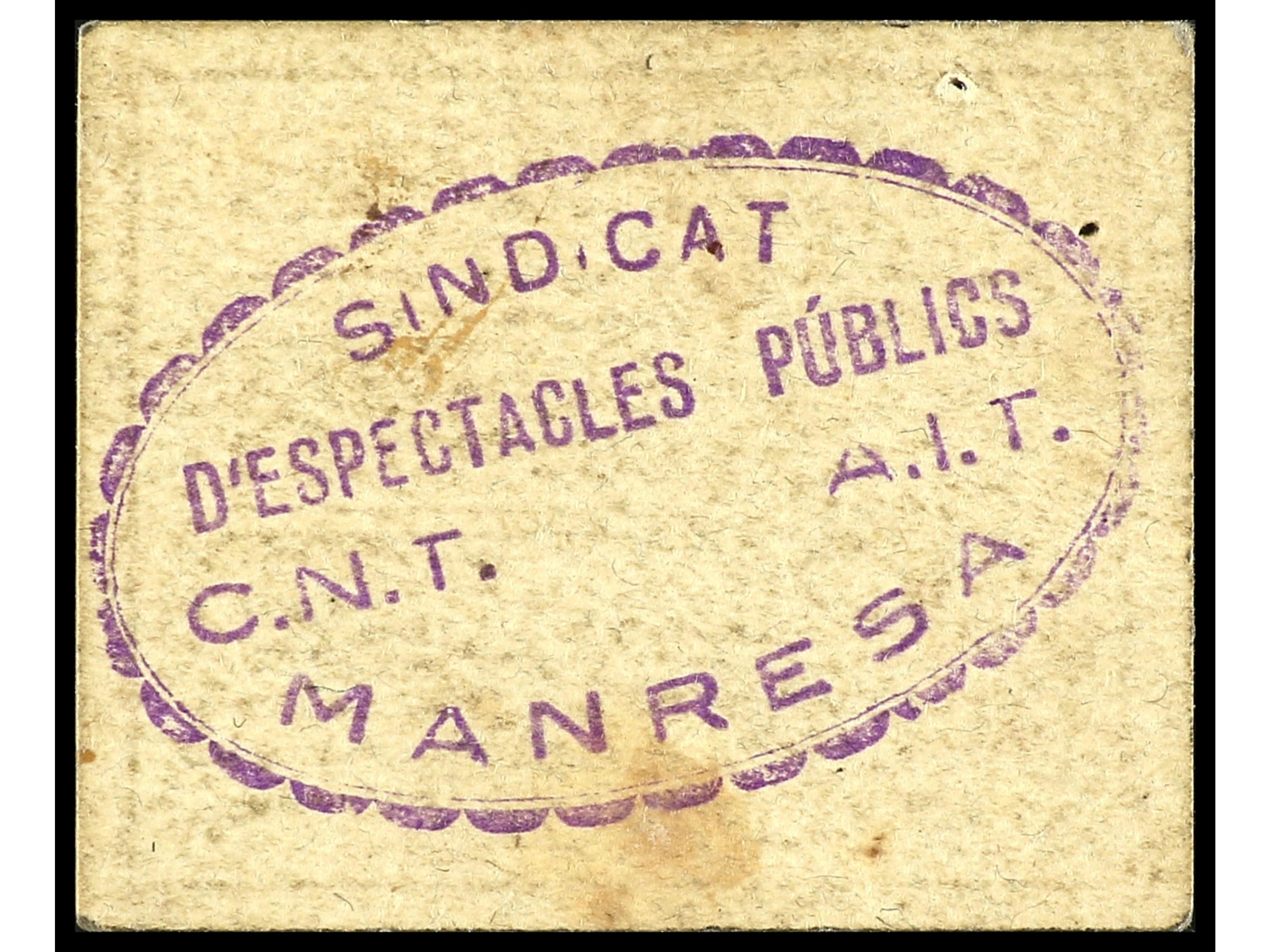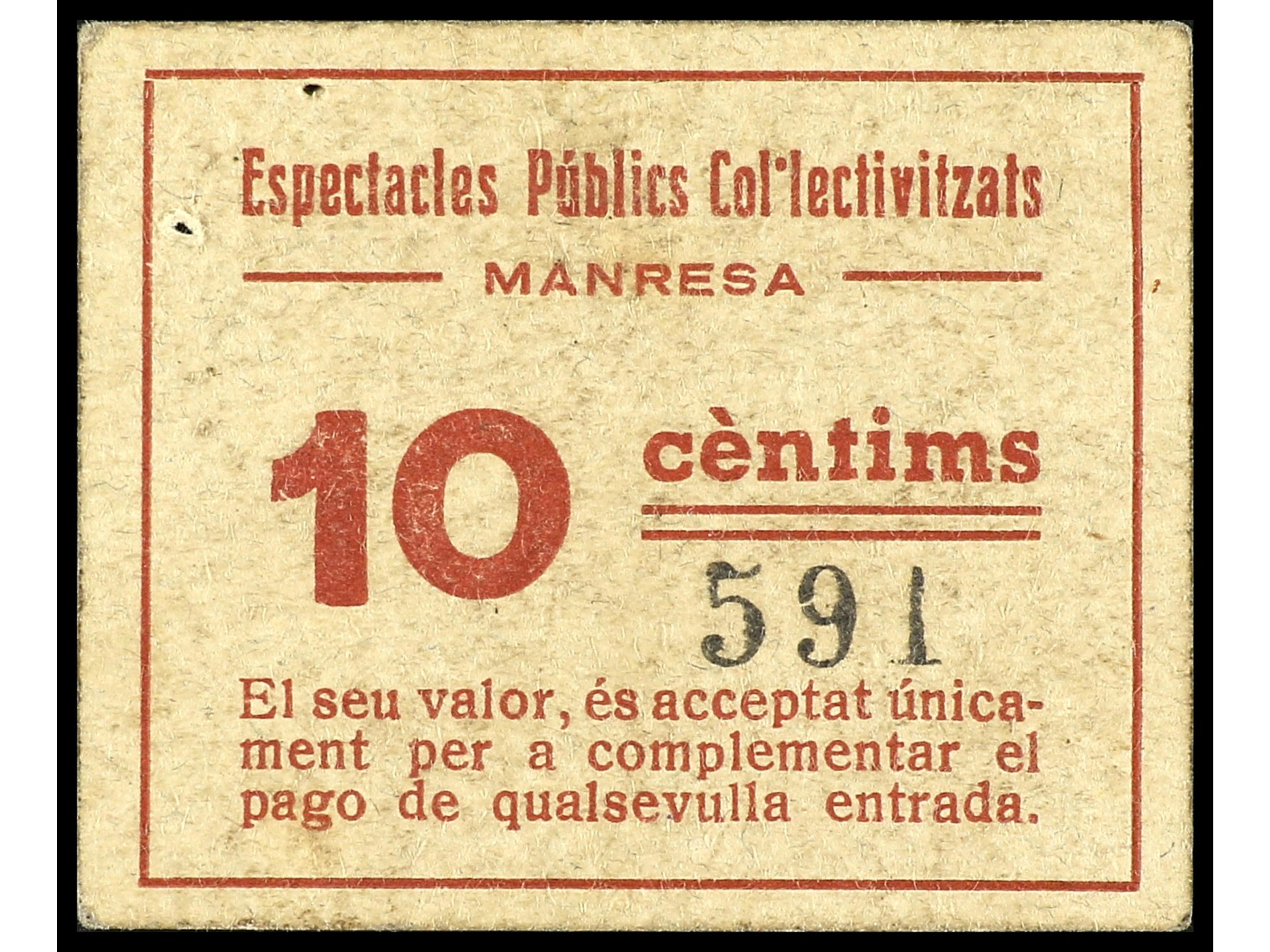 10 Cèntims. ESPECTACLES PÚBLICS COL·LECTIVITZATS DE MANRESA. Cartulina. RARO. L-3163; RGH-8513. EBC. (Image1) (Image2)