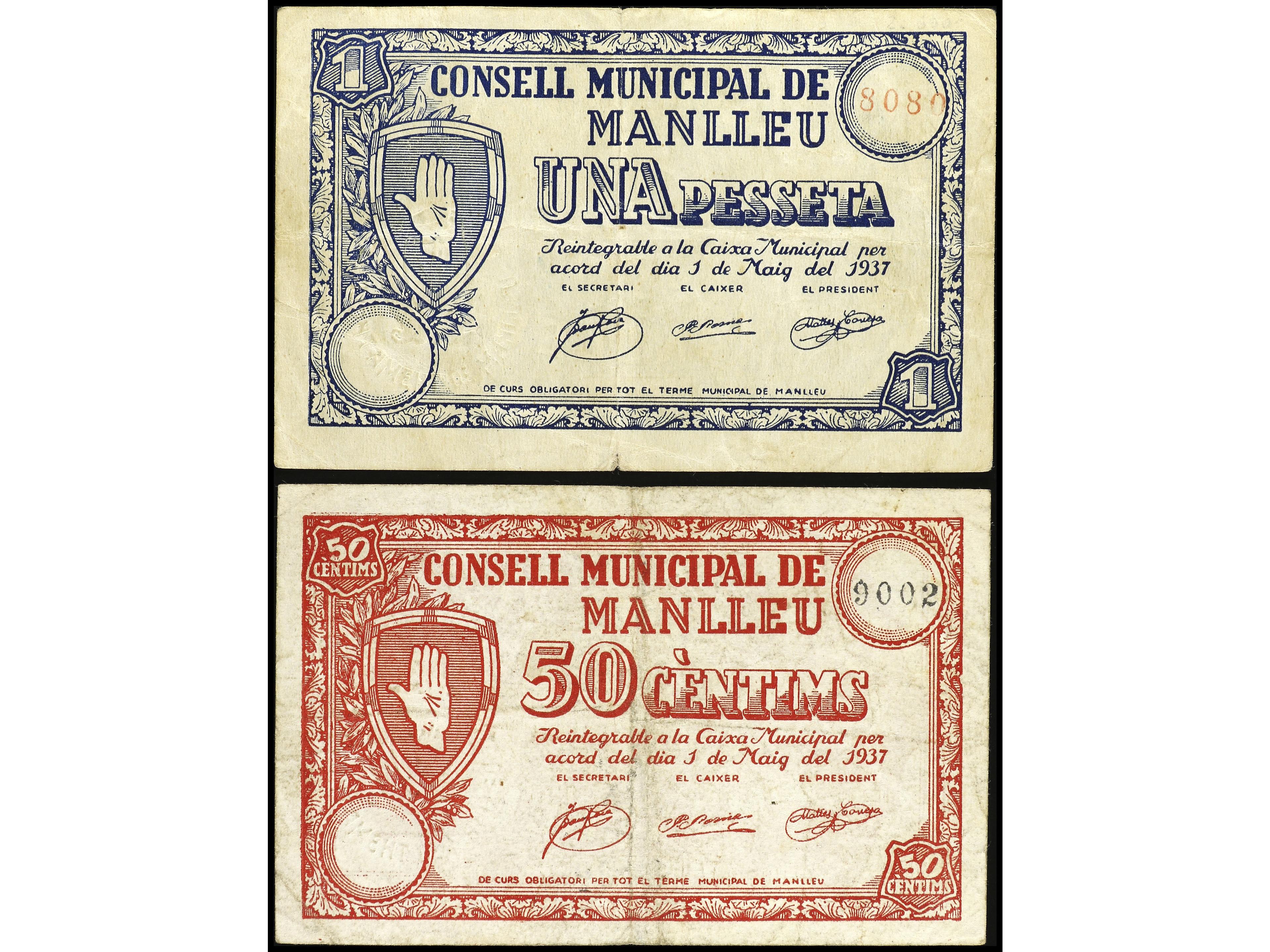 Lote 2 billetes 50 Cèntims y 1 Pesseta. 1 Maig 1937. C.M. de MANLLEU. AT-1418, 1419. MBC. (Image1) (Image2)
