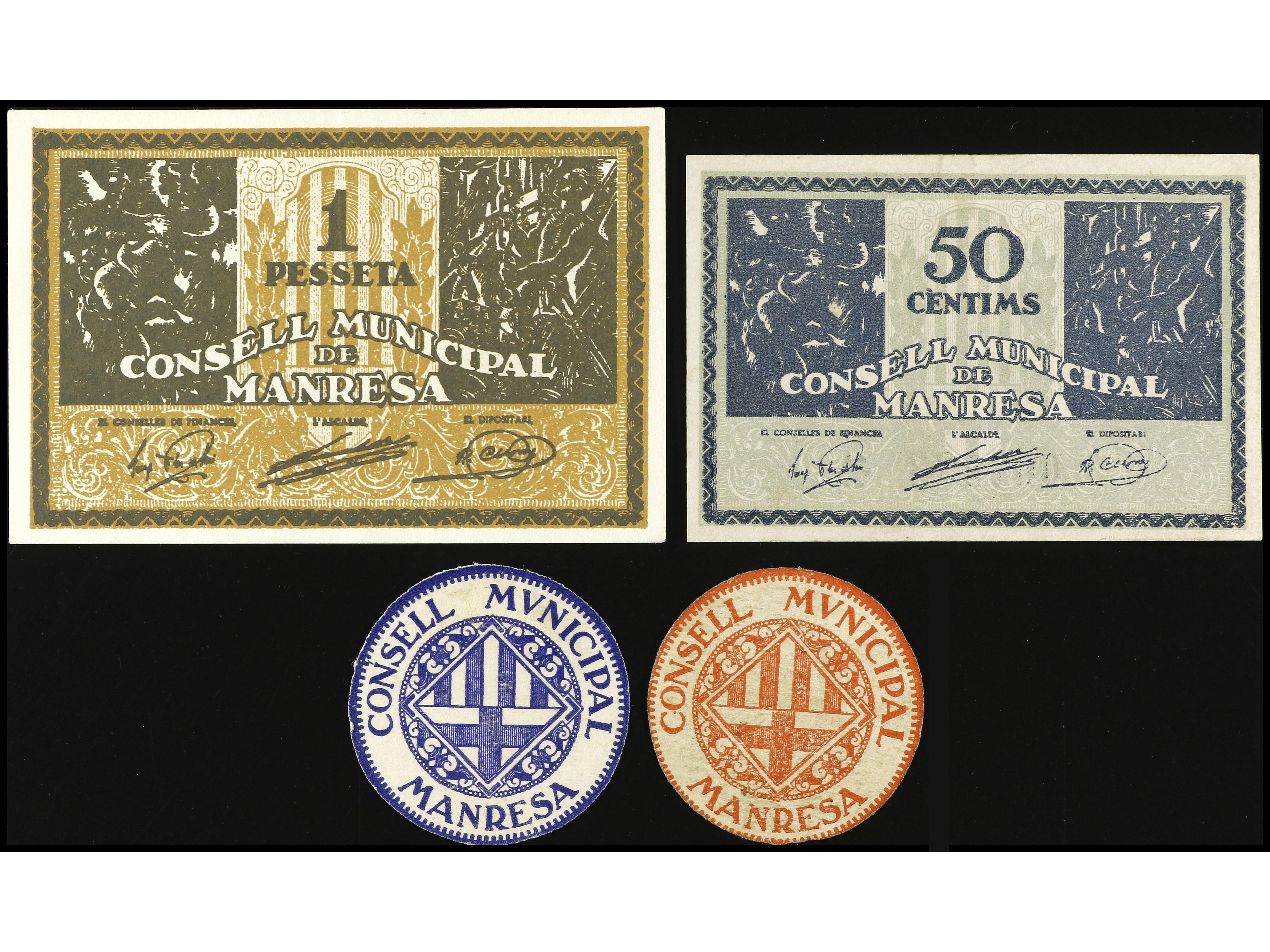 Serie 4 billetes 10, 15, 50 Cèntims, 1 Pesseta. C.M. de MANRESA. AT-1420/1423. EBC- a EBC. (Image1) (Image2)