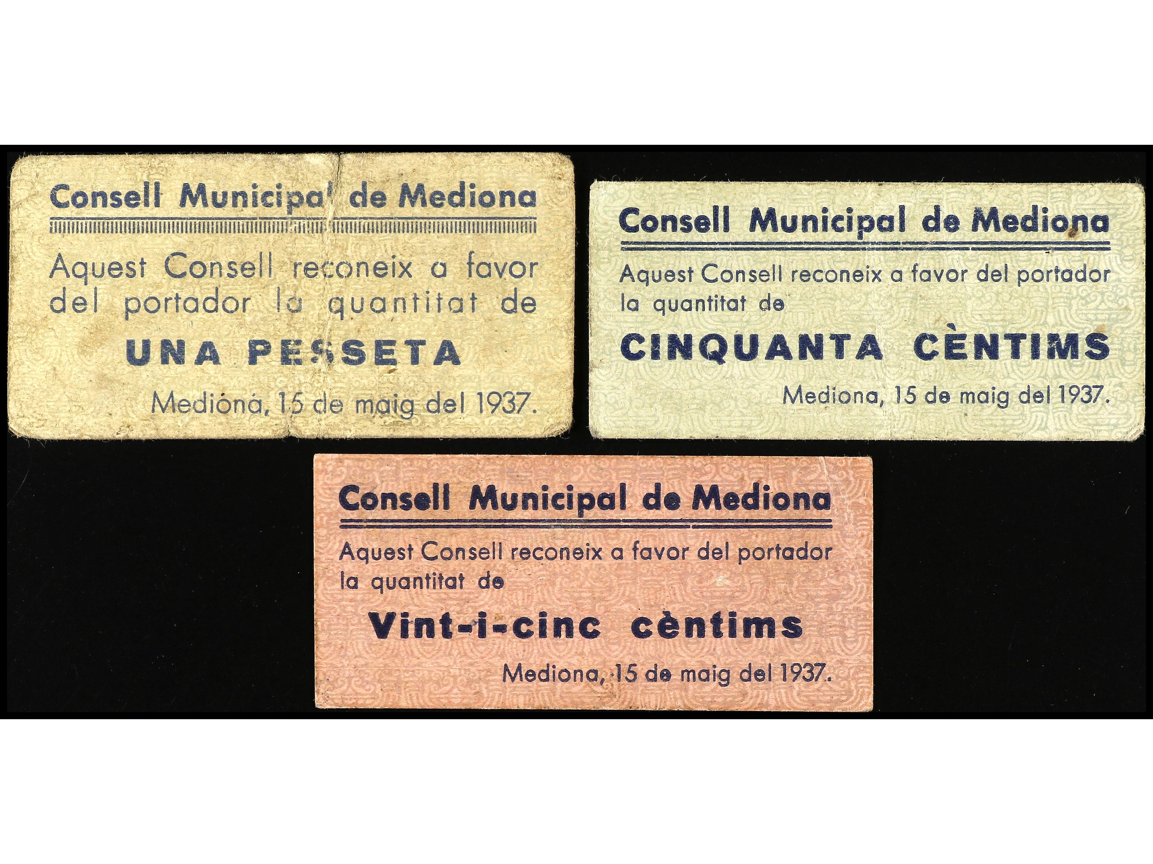 Lote 3 billetes 25 y 50 Cèntims y 1 Pesseta. 15 Maig 1937. C.M. de MEDIONA. RAROS. AT-1491/1493. MBC- a MBC+. (Image1) (Image2)