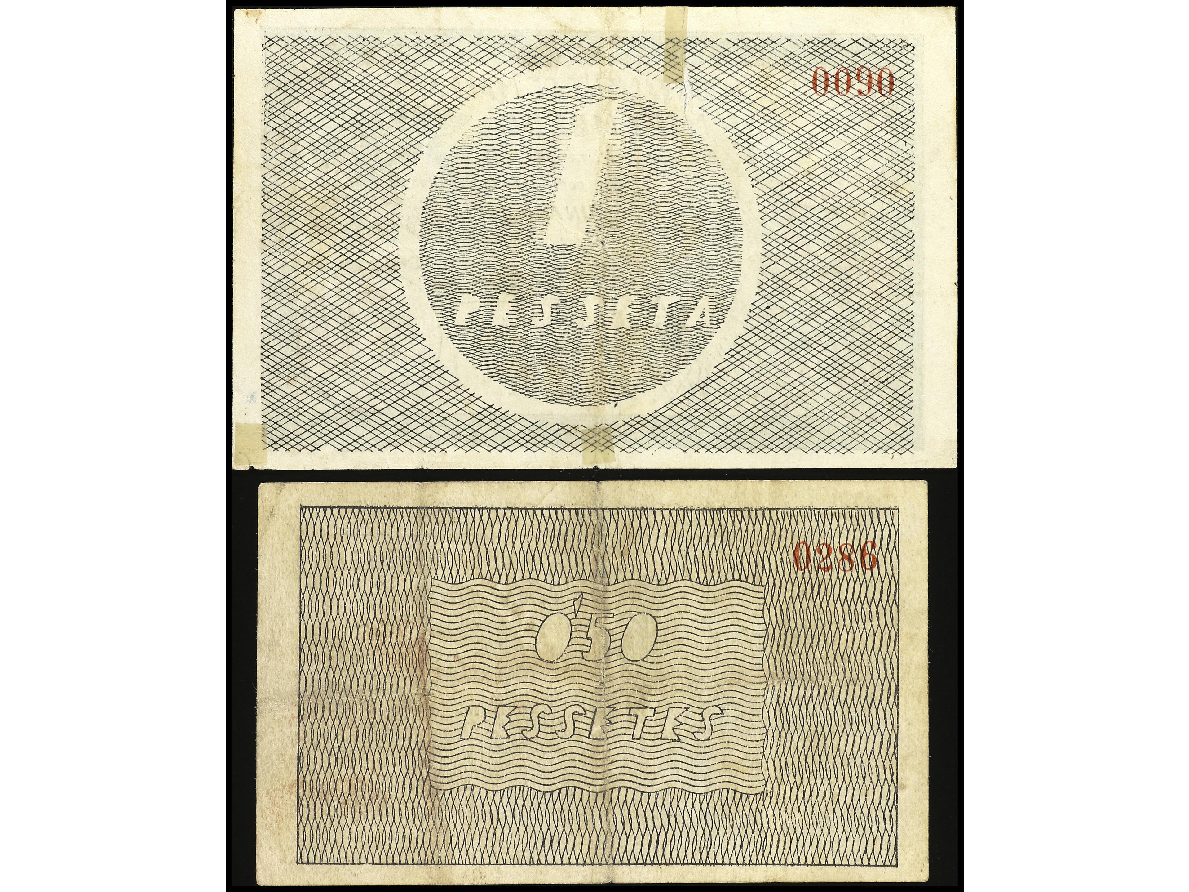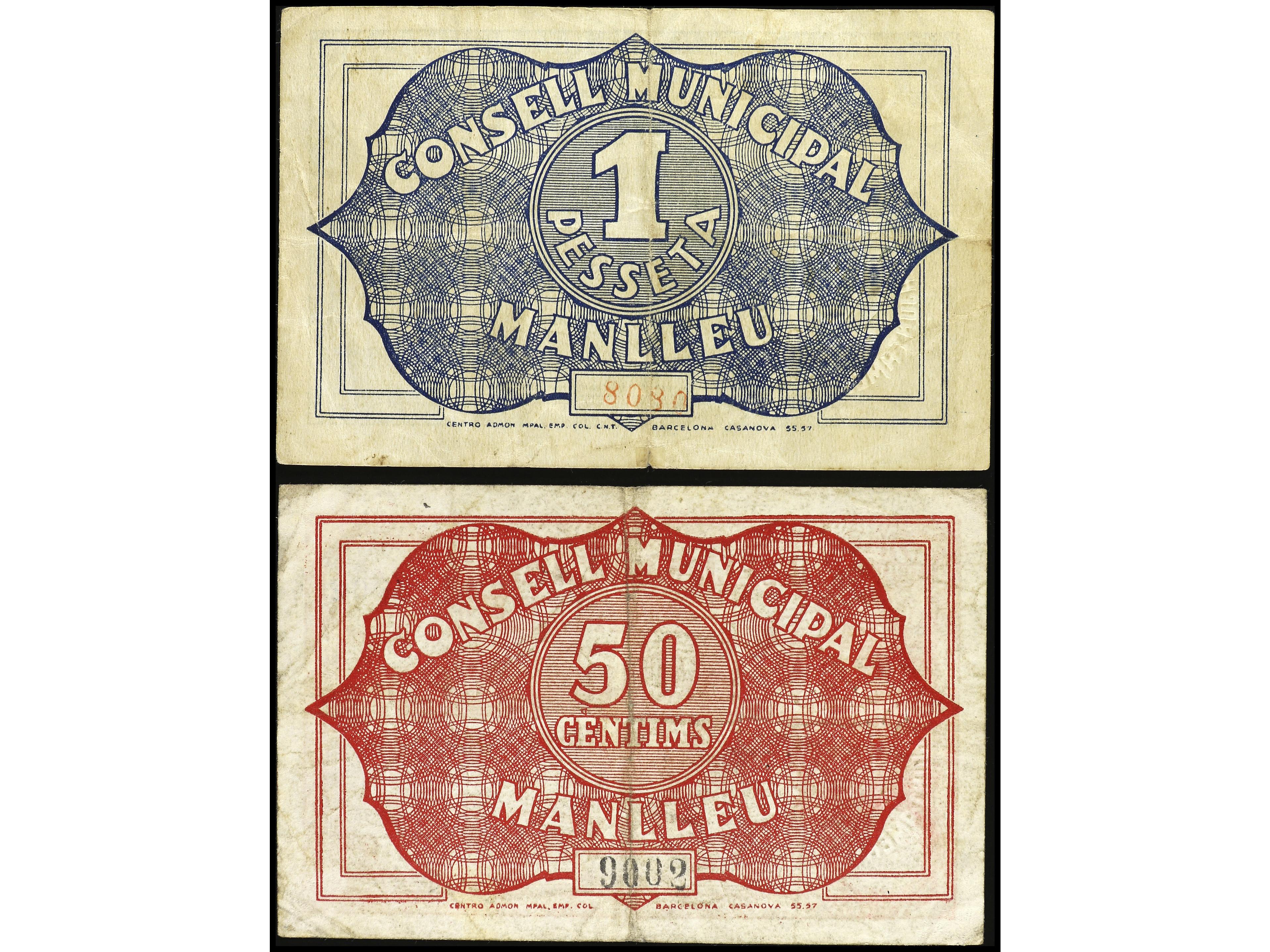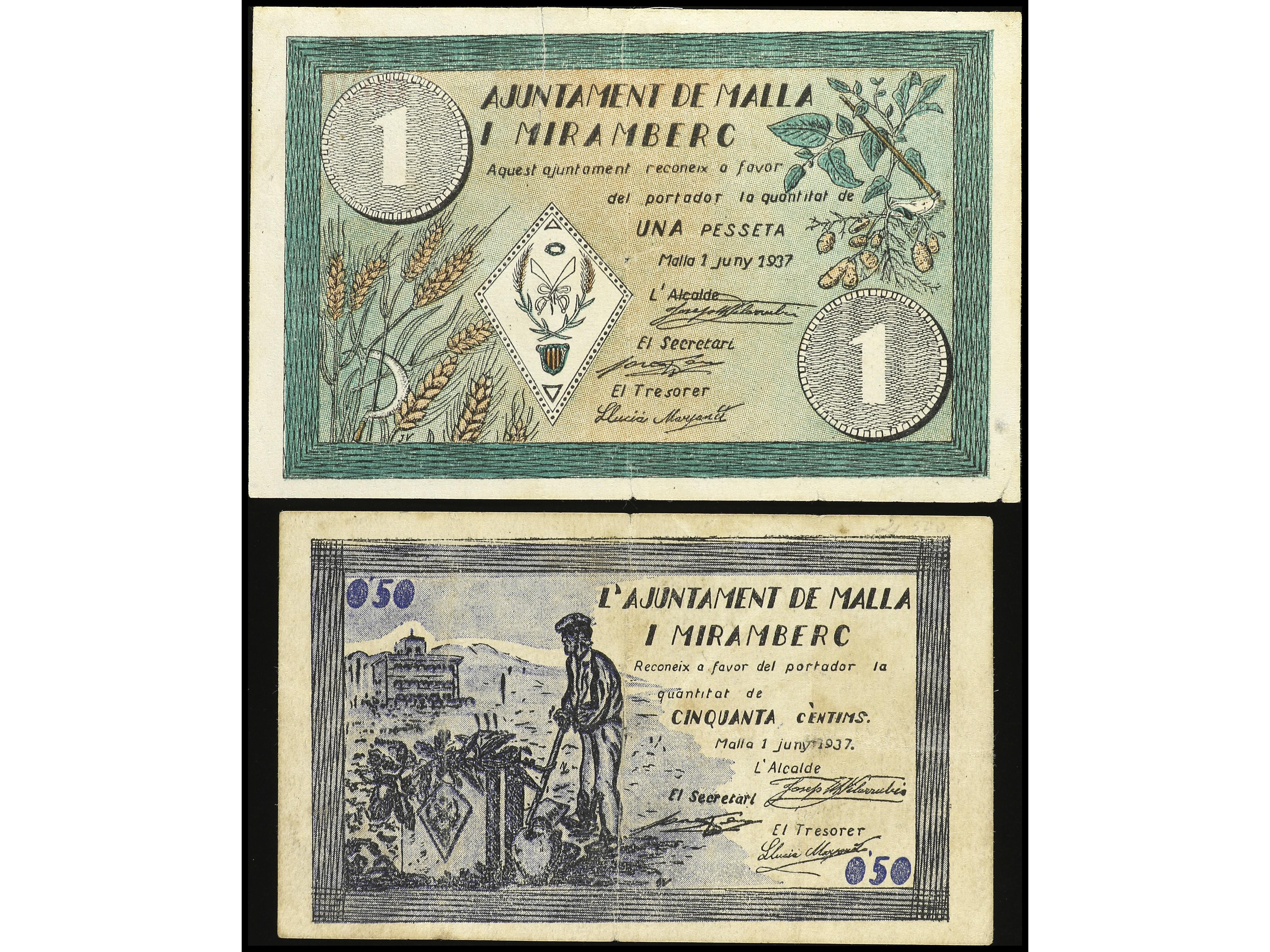 Lote 2 billetes 50 Cèntims y 1 Pesseta. 1 Juny 1937. Aj. de MALLA I MIRAMBERC. AT-1415a/16a. MBC+. (Image1) (Image2)