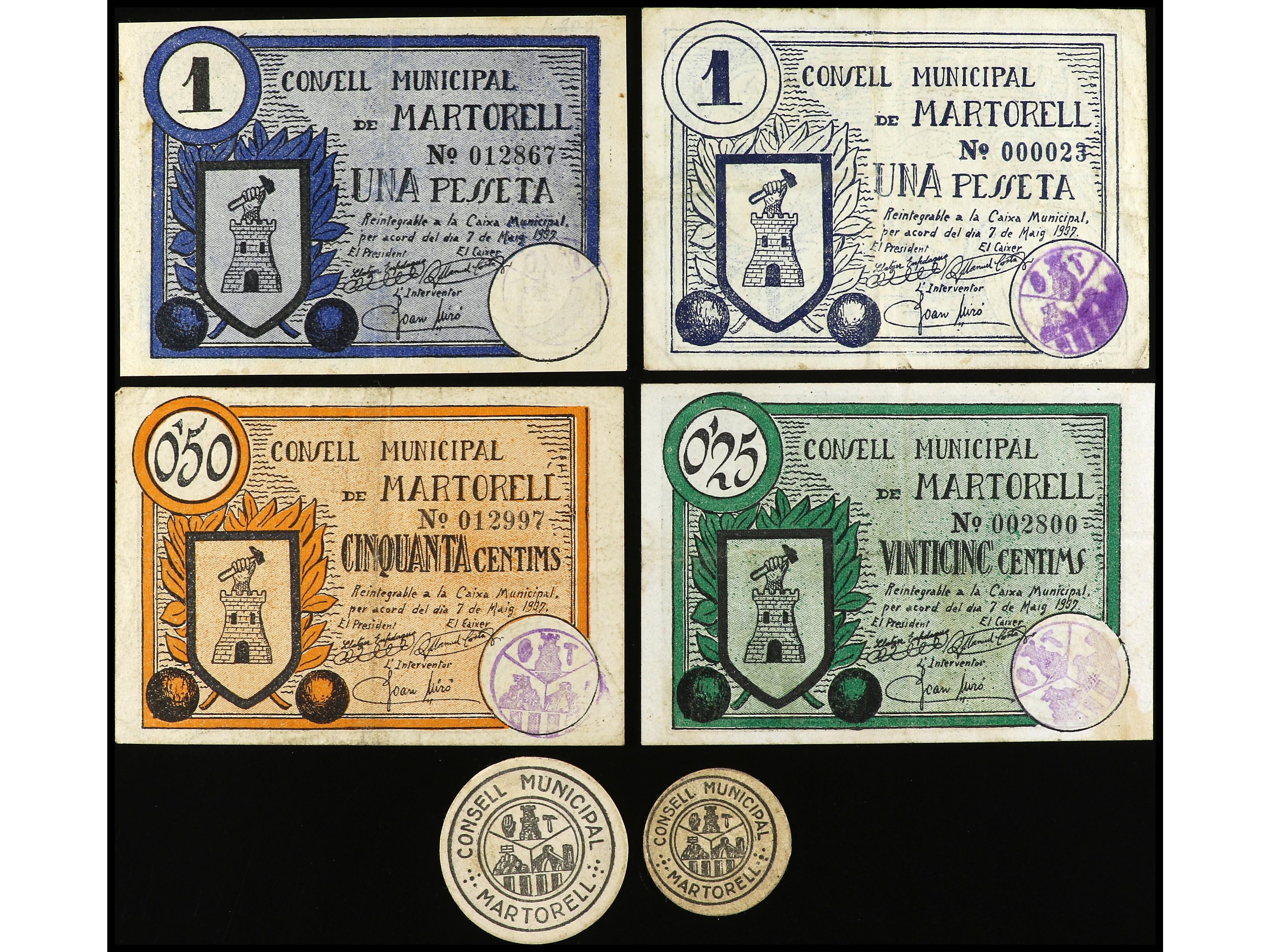 Lote 6 billetes 5, 10, 25 y 50 Cèntims y 1 Pesseta (2). C.M. de MARTORELL. AT-1441, 1443/1445, 1448/49. MBC a MBC+. (Image1)