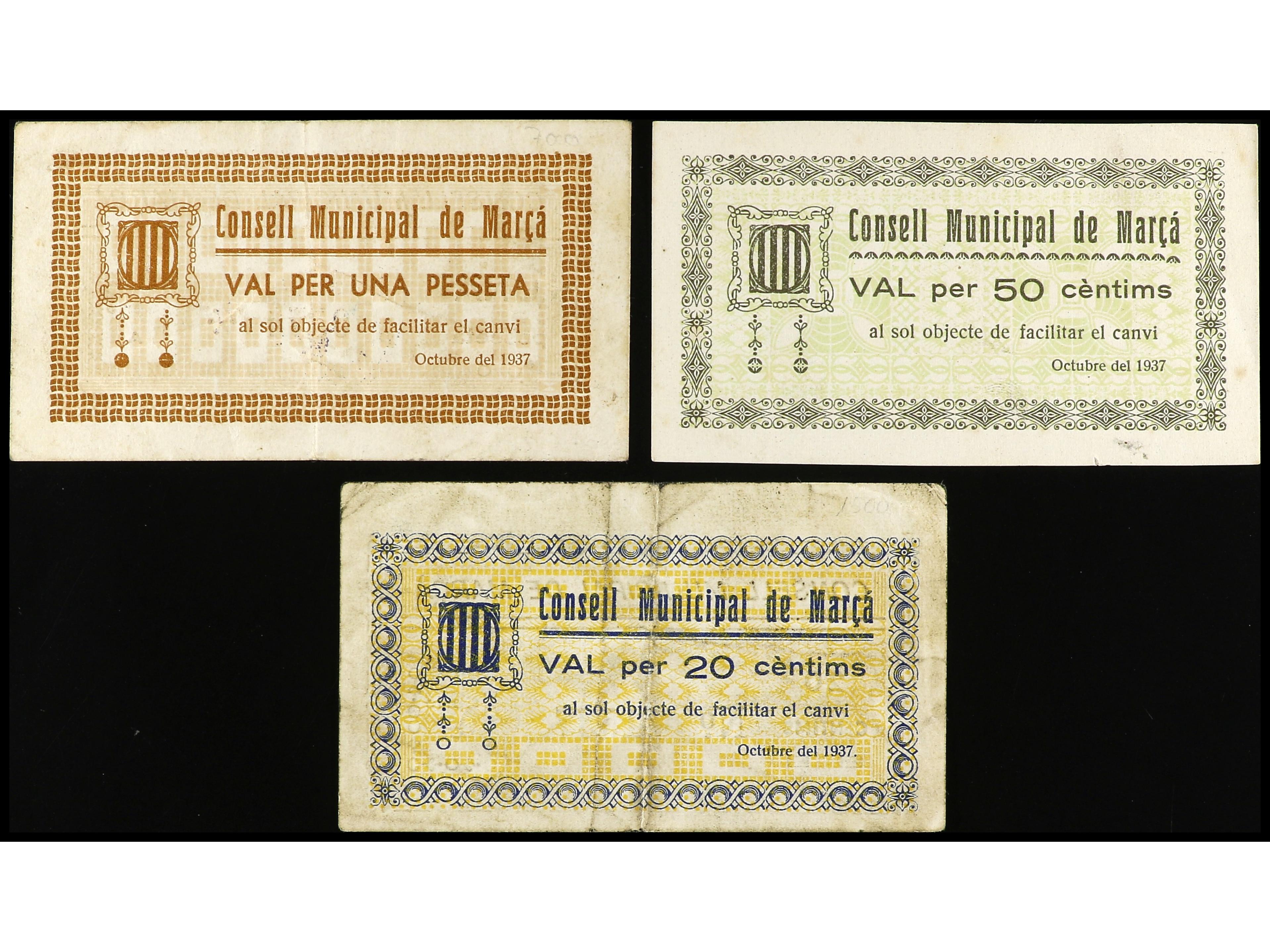 Lote 3 billetes 20, 50 Cèntims y 1 Pesseta. Octubre 1937. C.M. de MARÇA. AT-1430/1432. MBC a EBC-. (Image1) (Image2)