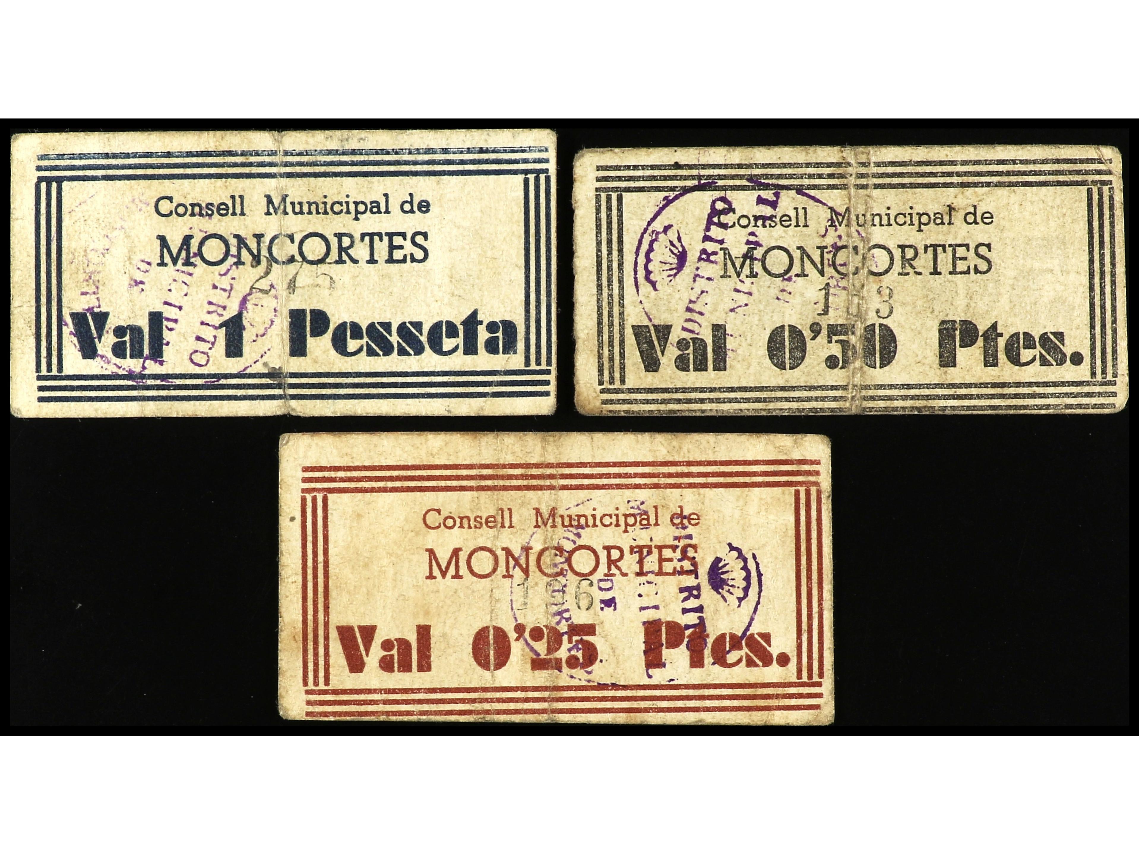 Lote 3 billetes 0,25, 0,50 y 1 Pesseta. C.M. de MONCORTÈS. MUY ESCASOS. AT-1520/22. MBC-. (Image1) (Image2)