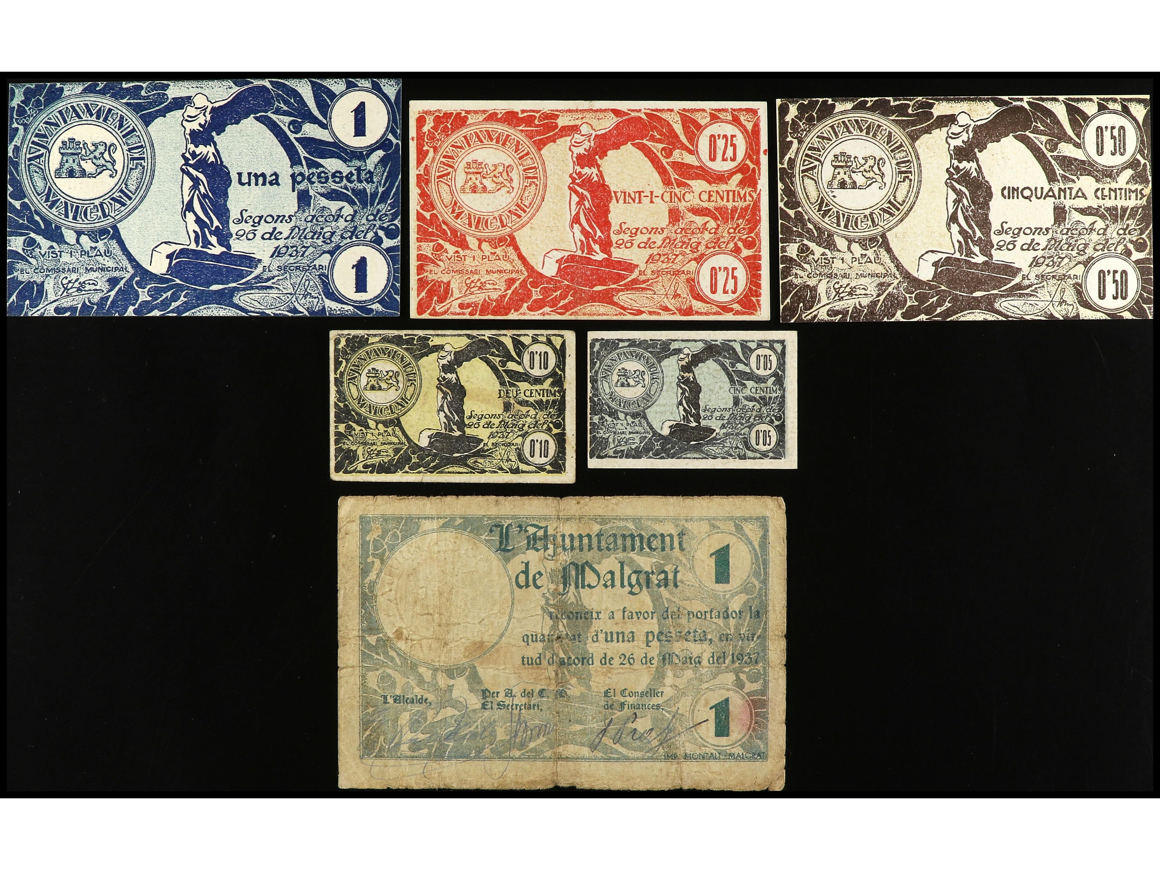 Lote 6 billetes 5, 10, 25, 50 Cèntims y 1 Pesseta (2). Aj. de MALGRAT. AT-1405, 1410/1414. BC+ a EBC. (Image1)