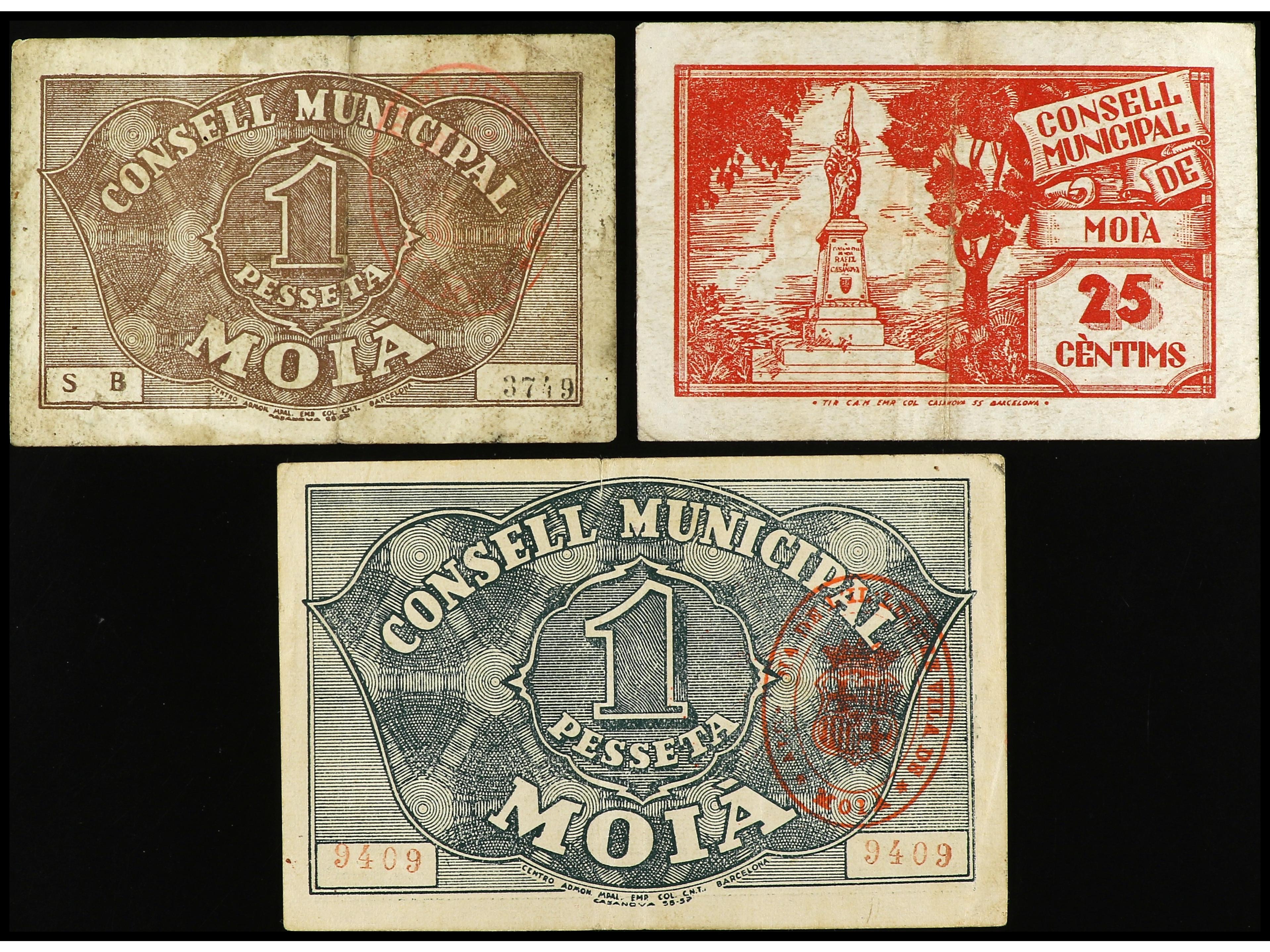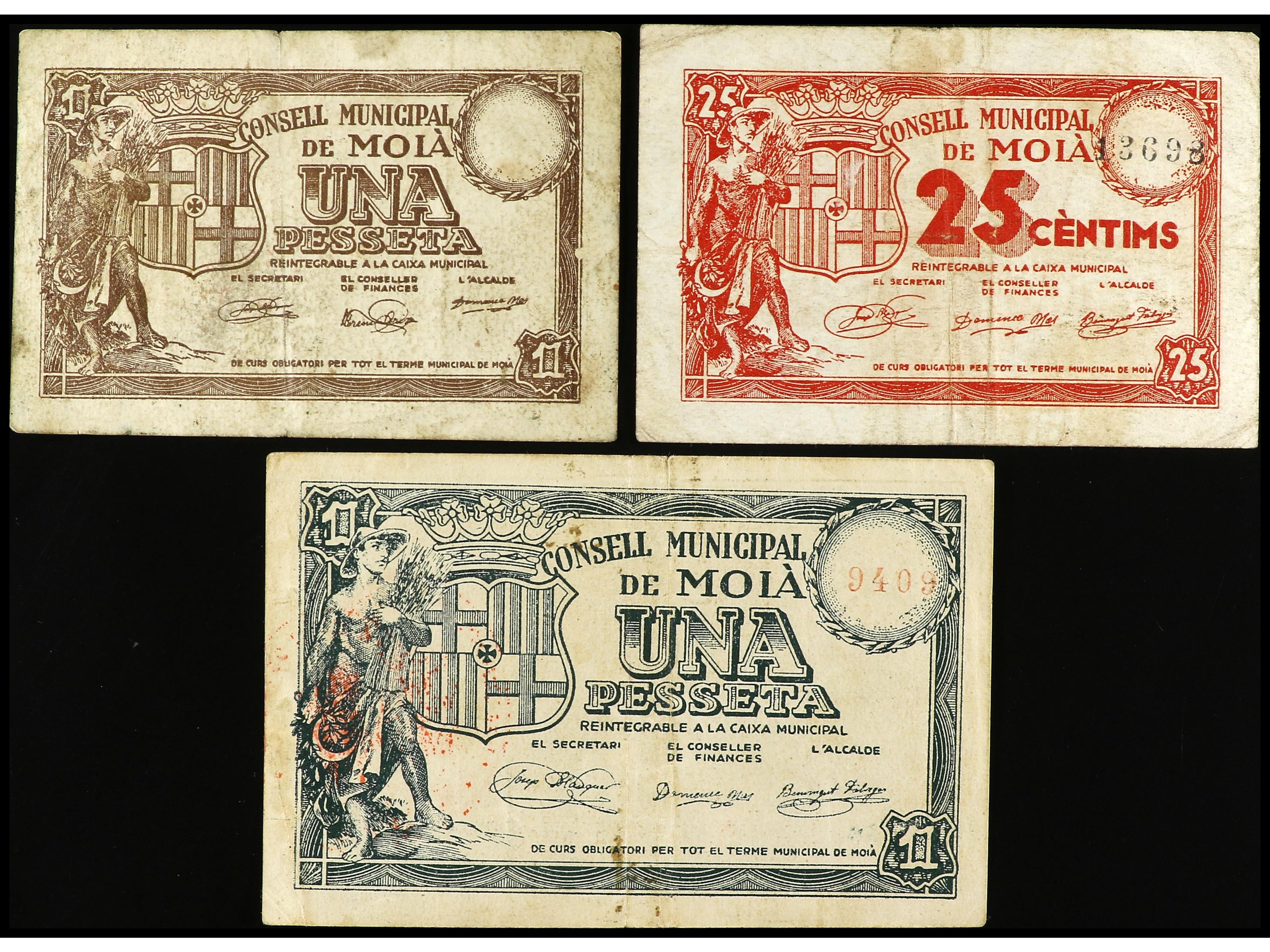 Lote 3 billetes 25 Cèntims y 1 Pesseta (2). C.M. de MOIÀ. AT-1504, 1505, 1506. MBC a MBC+. (Image1) (Image2)
