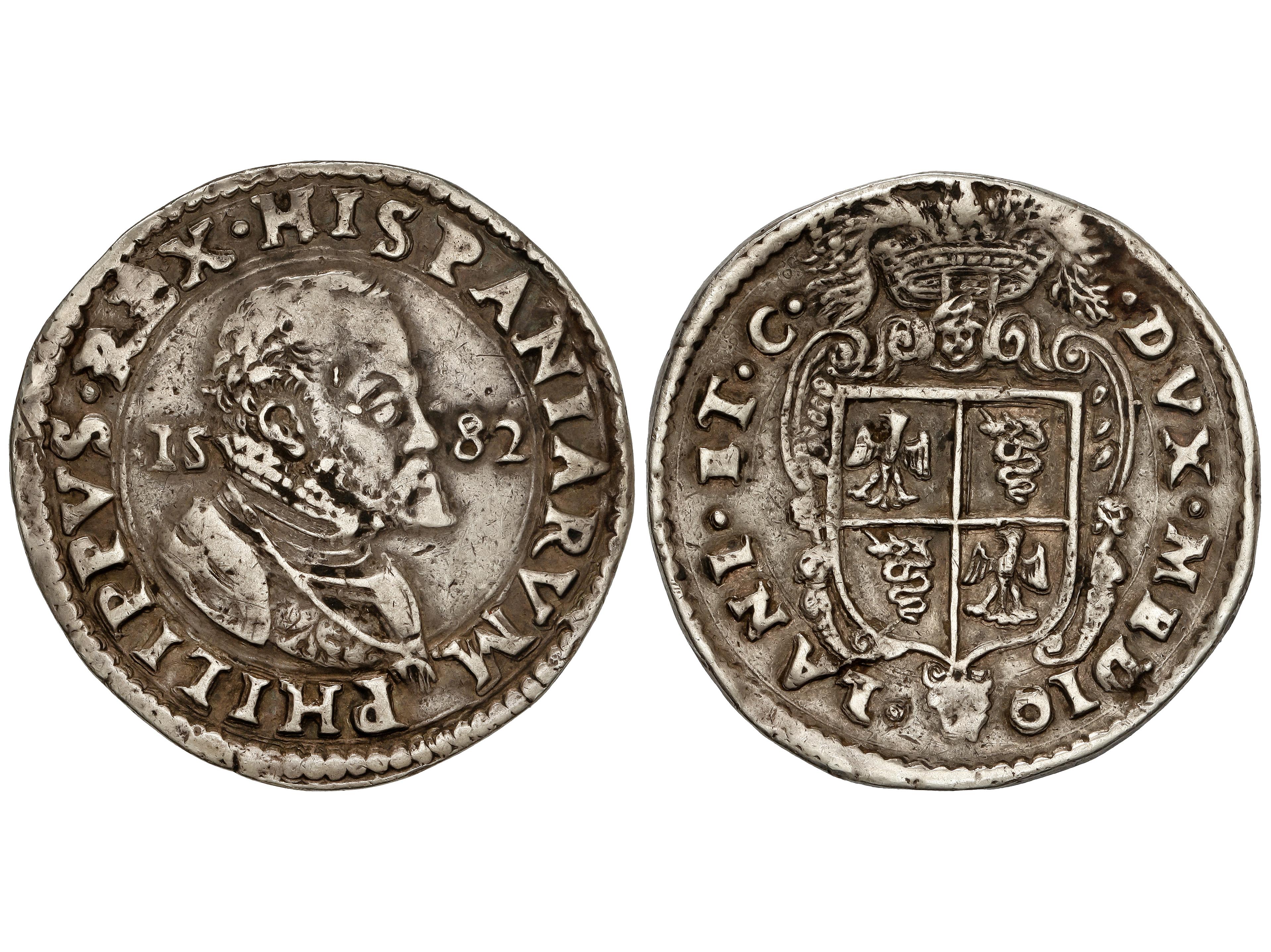 209 imageDucatón. 1582. MILÁN. 31,57 grs. AR. RARA ASÍ. MIR-308/7 sim.; Tauler-485; Vti-50. MBC+. (Image1)