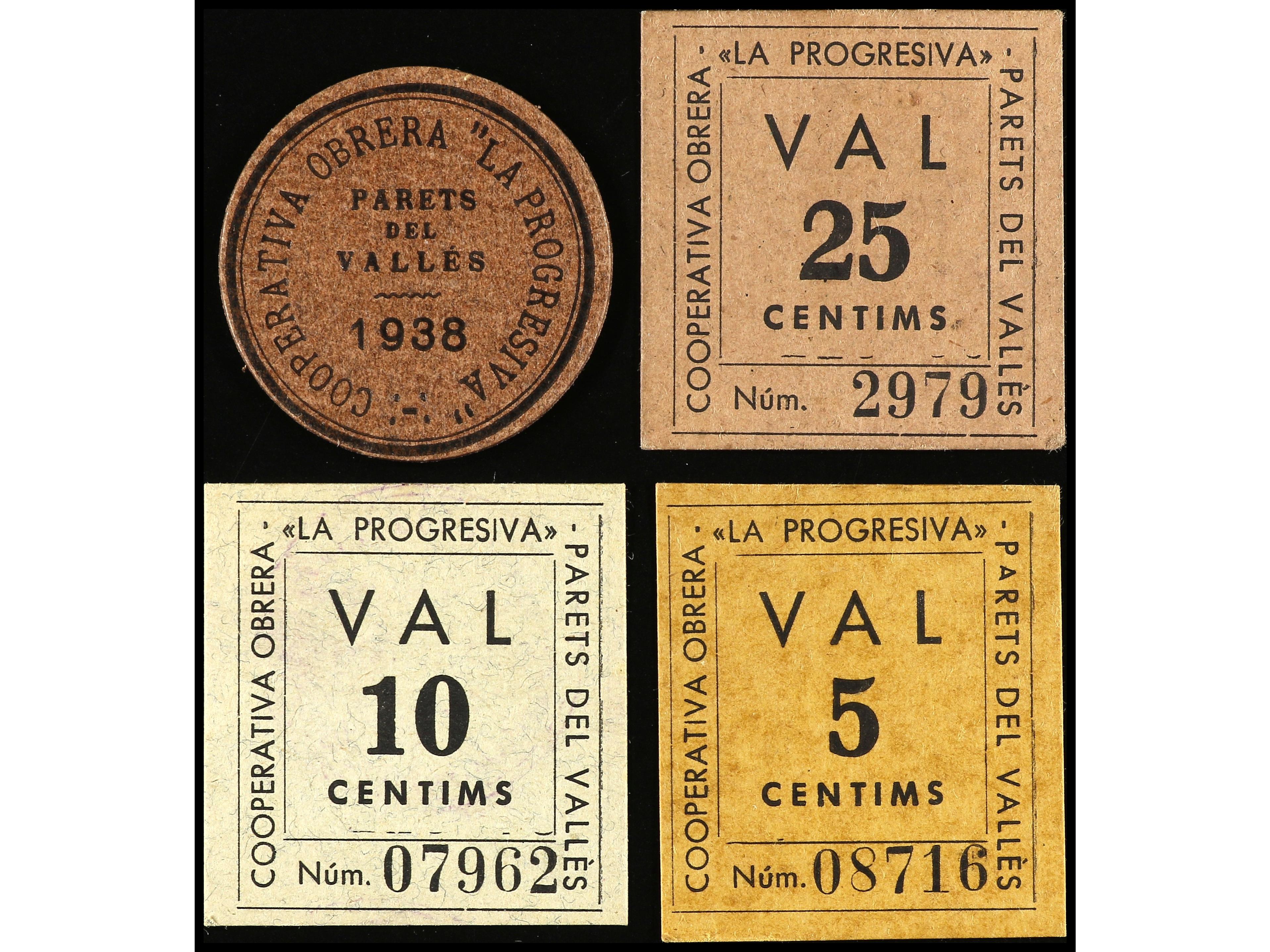 Lote 4 billetes 5 (2), 10 y 25 Cèntims. COOPERATIVA OBRERA LA PROGRESIVA. PARETS DEL VALLÈS. 4 cartones, todos los de la cooperativa. ESCASOS. T-2063/2066. EBC- a EBC+. (Image1) (Image2)