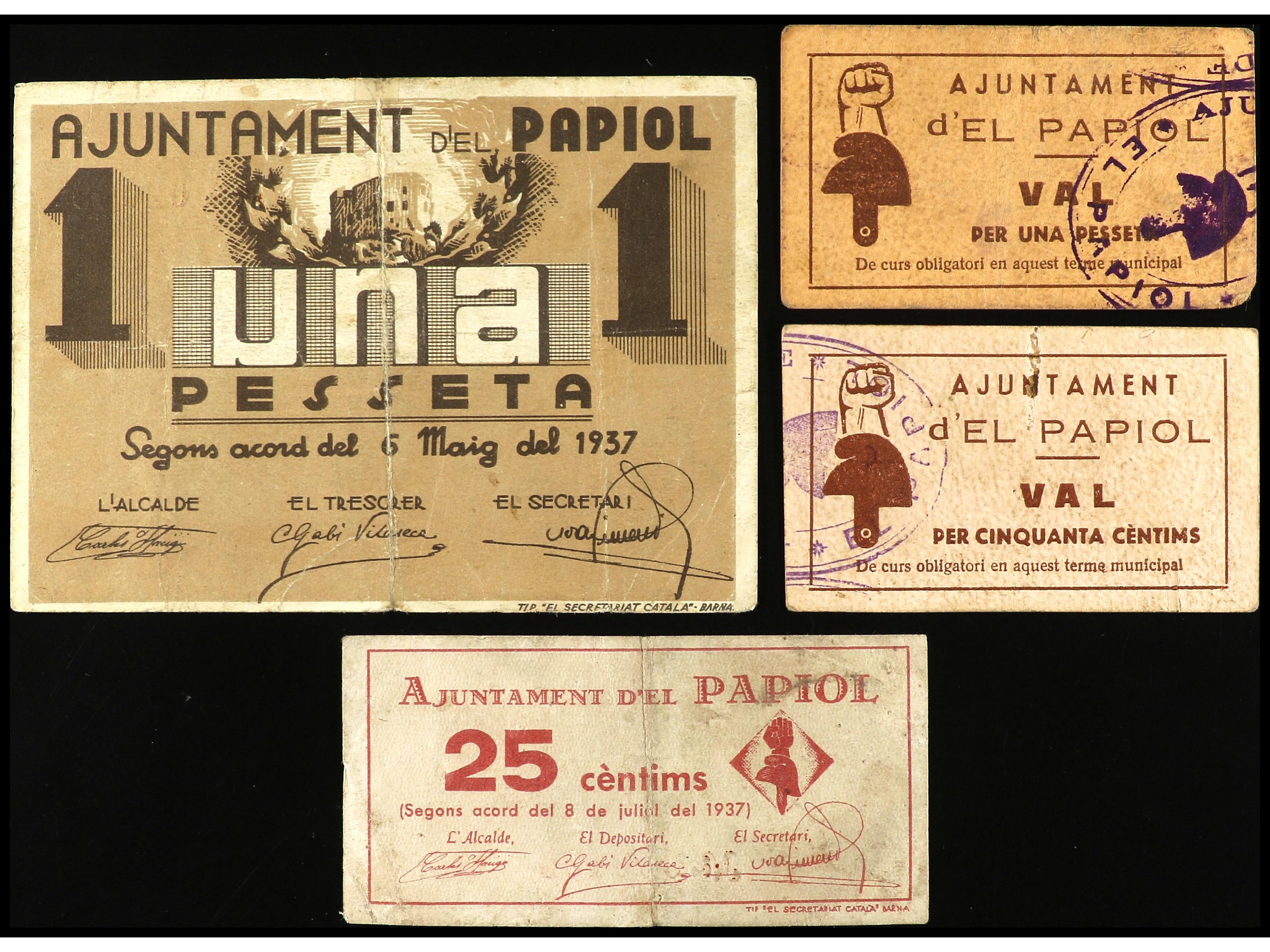 Lote 4 billetes 25, 50 Cèntims y 1 Pesseta (2). Sin Fecha y 6 Maig 1937. Aj. d´EL PAPIOL. 50 Cts Serie E, 1 Pta Serie D. RAROS. AT-1777d, 1778 c, 1779, 1780. MBC- a MBC+. (Image1)
