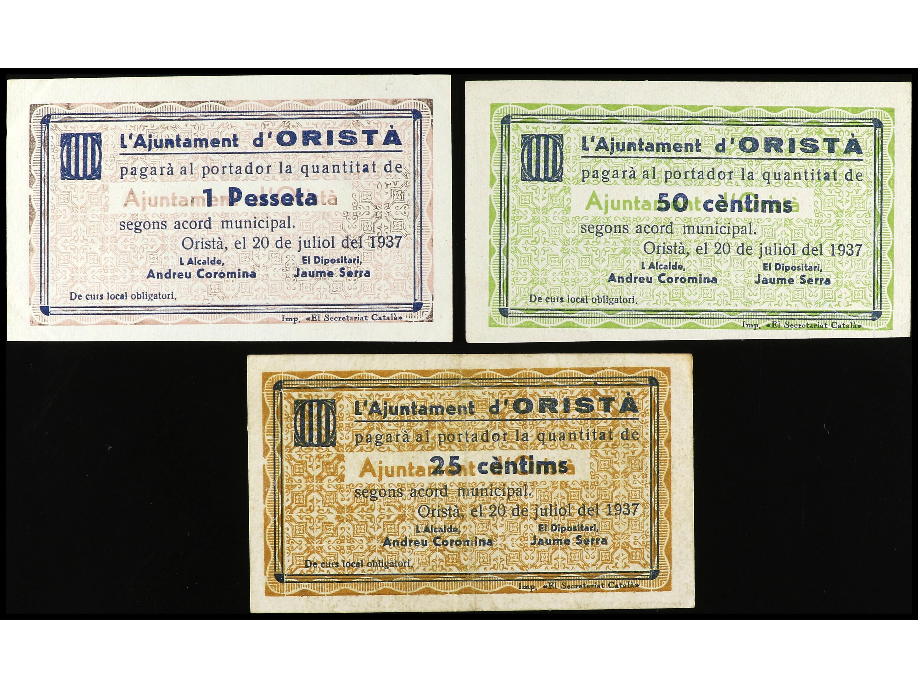 Lote 3 billetes 25, 50 Cèntims y 1 Pesseta. 20 Juliol 1937. Aj. d´ ORISTÀ. AT-1719, 1720, 1721. MBC+ a EBC. (Image1) (Image2)