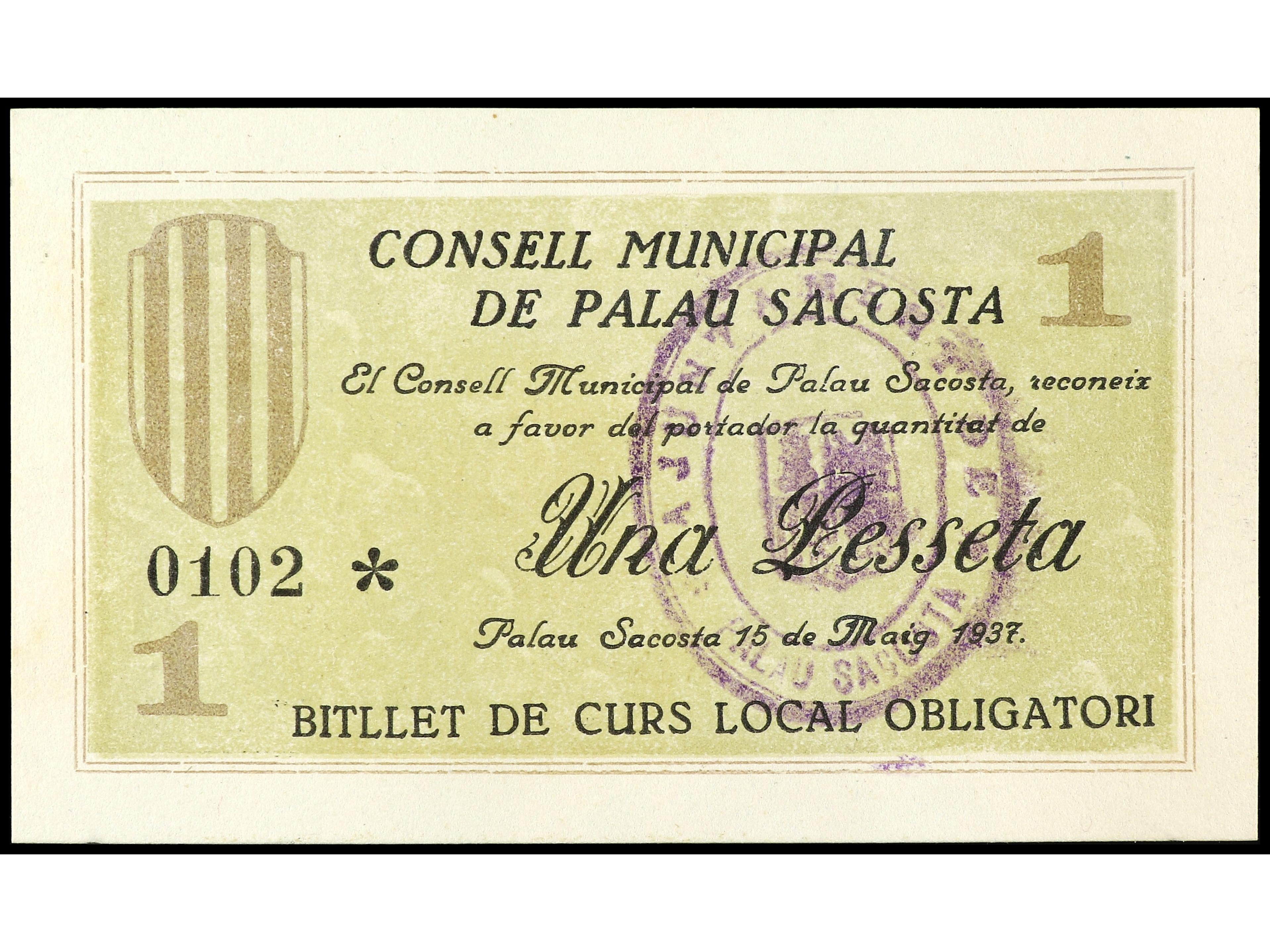 1 Pesseta. 15 Maig 1937. C.M. de PALAU SACOSTA. AT-1760. SC-. (Image1) (Image2)