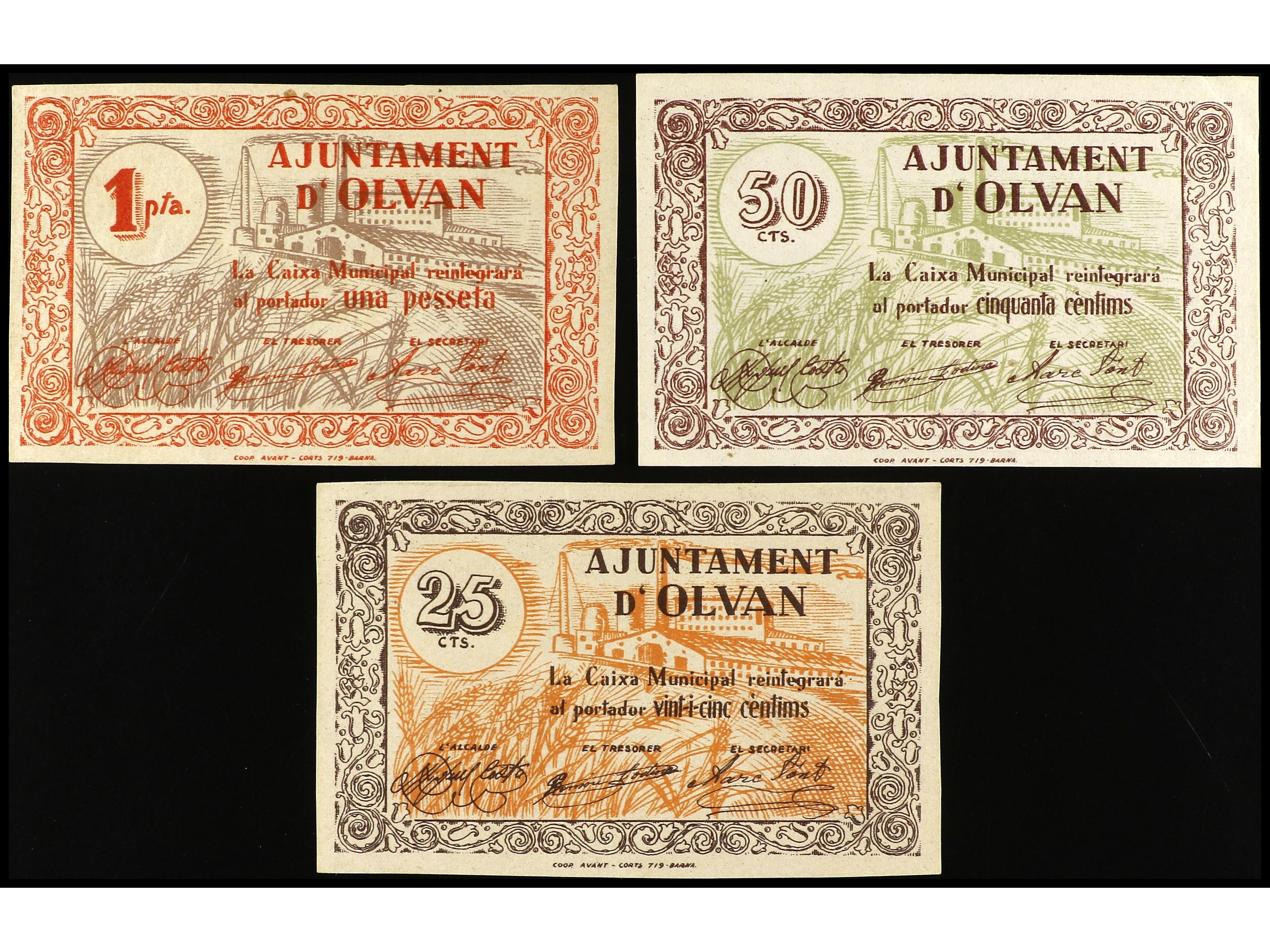 Lote 3 billetes 25, 50 Cèntims y 1 Pesseta. Aj. d´ OLVAN. AT-1704b, 1705b, 1706b. EBC-. (Image1) (Image2)