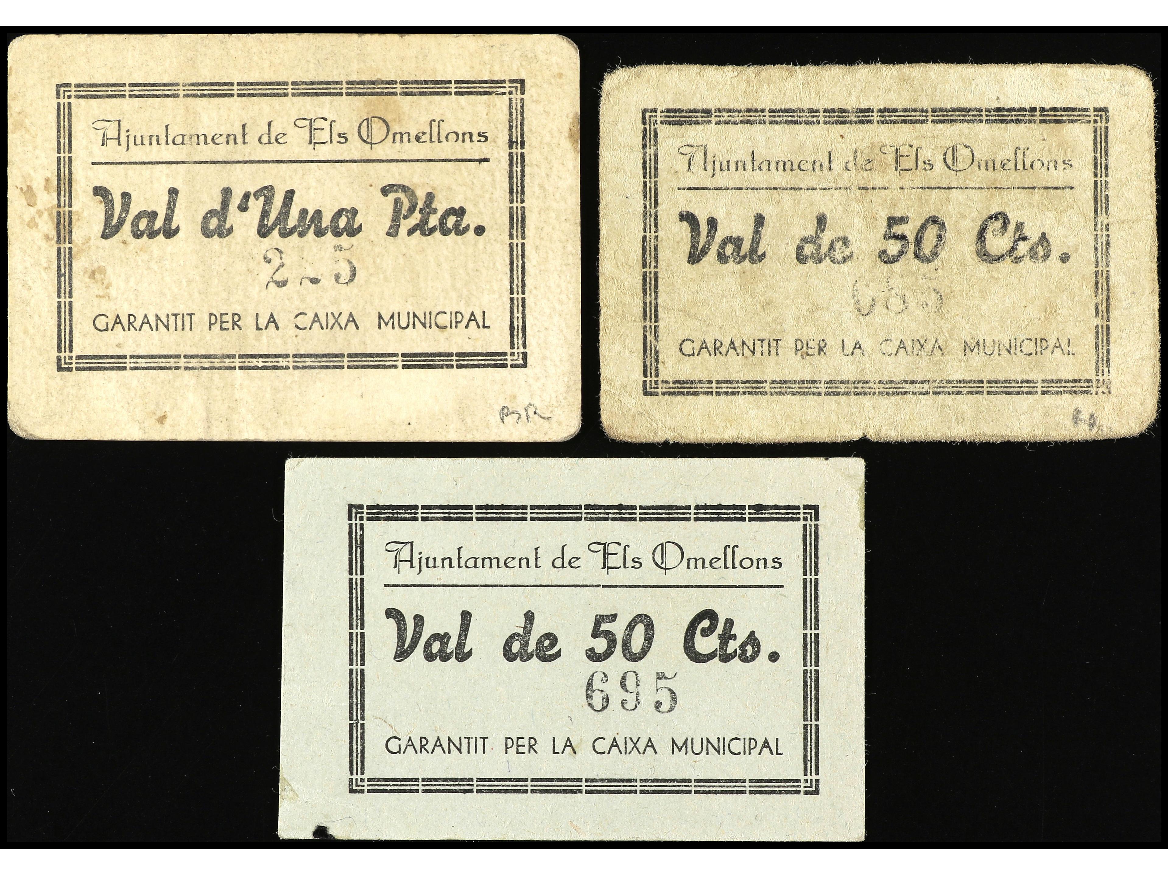 Lote 3 billetes 50 Cèntims (2) y 1 Pesseta. Aj. d´ ELS OMELLONS. RAROS. AT-1707/09. MBC- a MBC+. (Image1) (Image2)