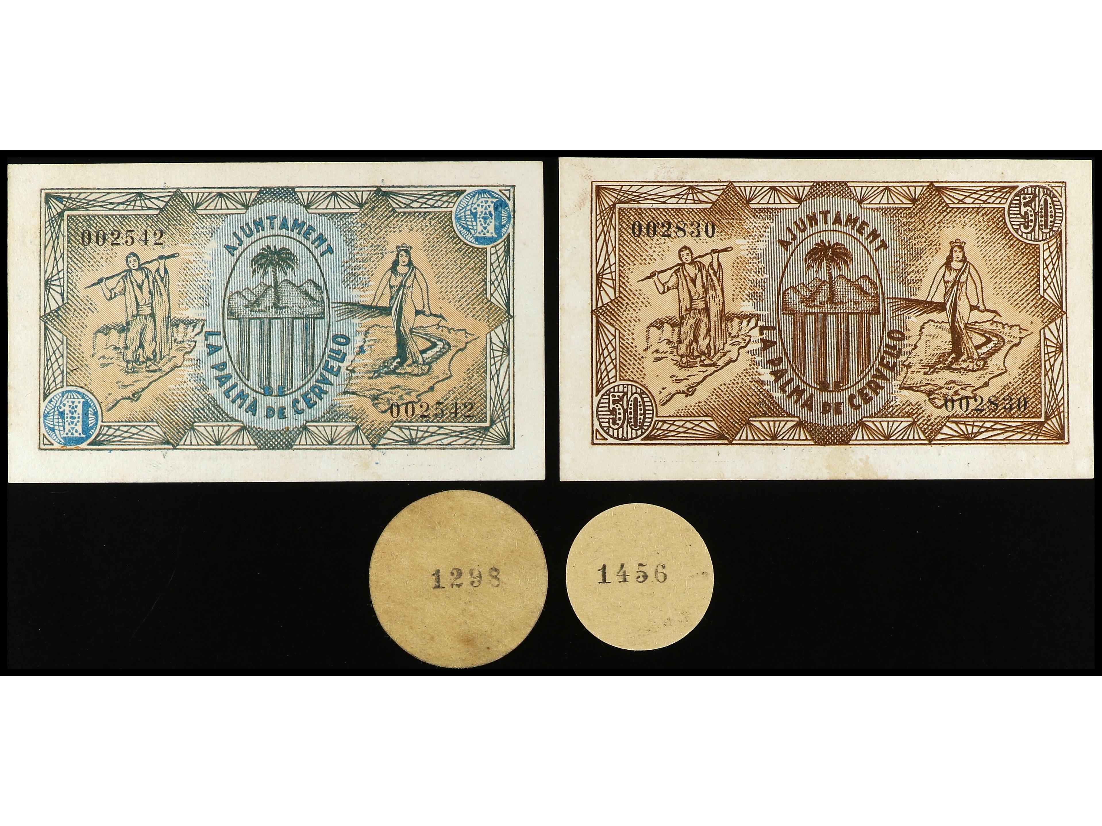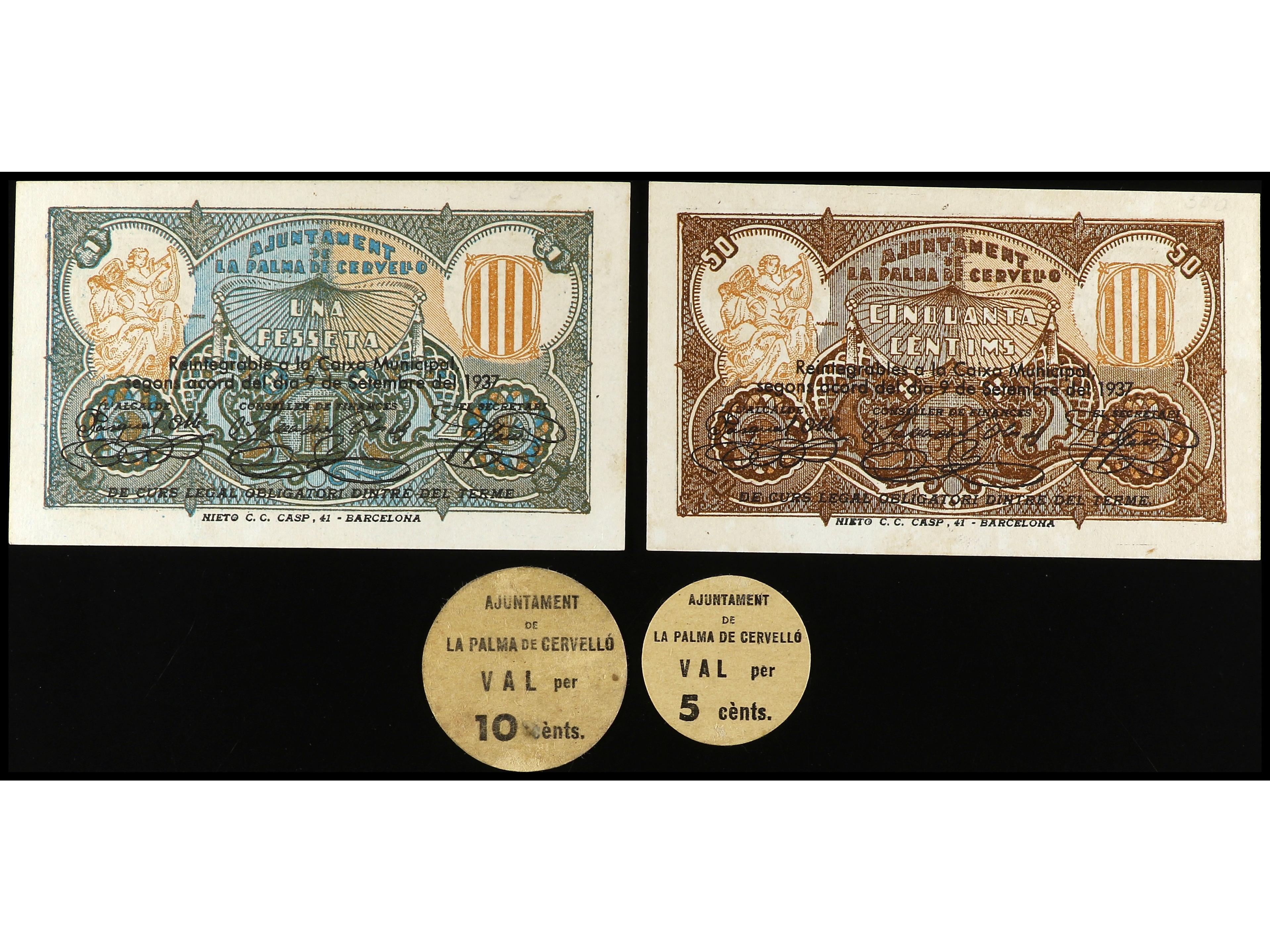 Lote 4 billetes 5, 10, 50 Cèntims y 1 Pesseta. Aj. de LA PALMA DE CERVELLÓ. AT-1771/74. MBC+ a EBC. (Image1) (Image2)