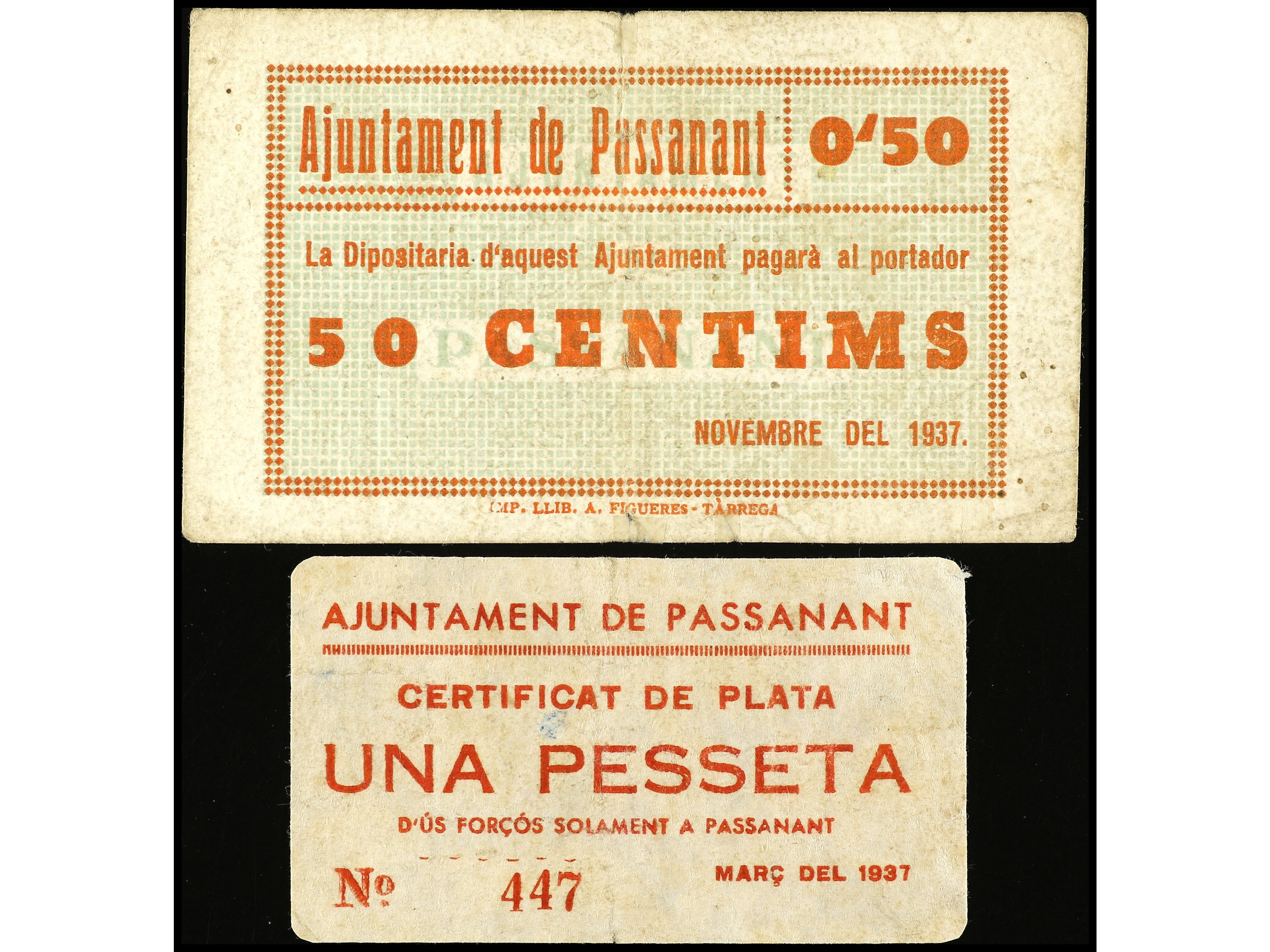 Lote 2 billetes 50 Cèntims y 1 Pesseta. Març y Novembre 1937. Aj. de PASSANANT. MUY ESCASOS. AT-1783b, 1786b. MBC- a MBC.