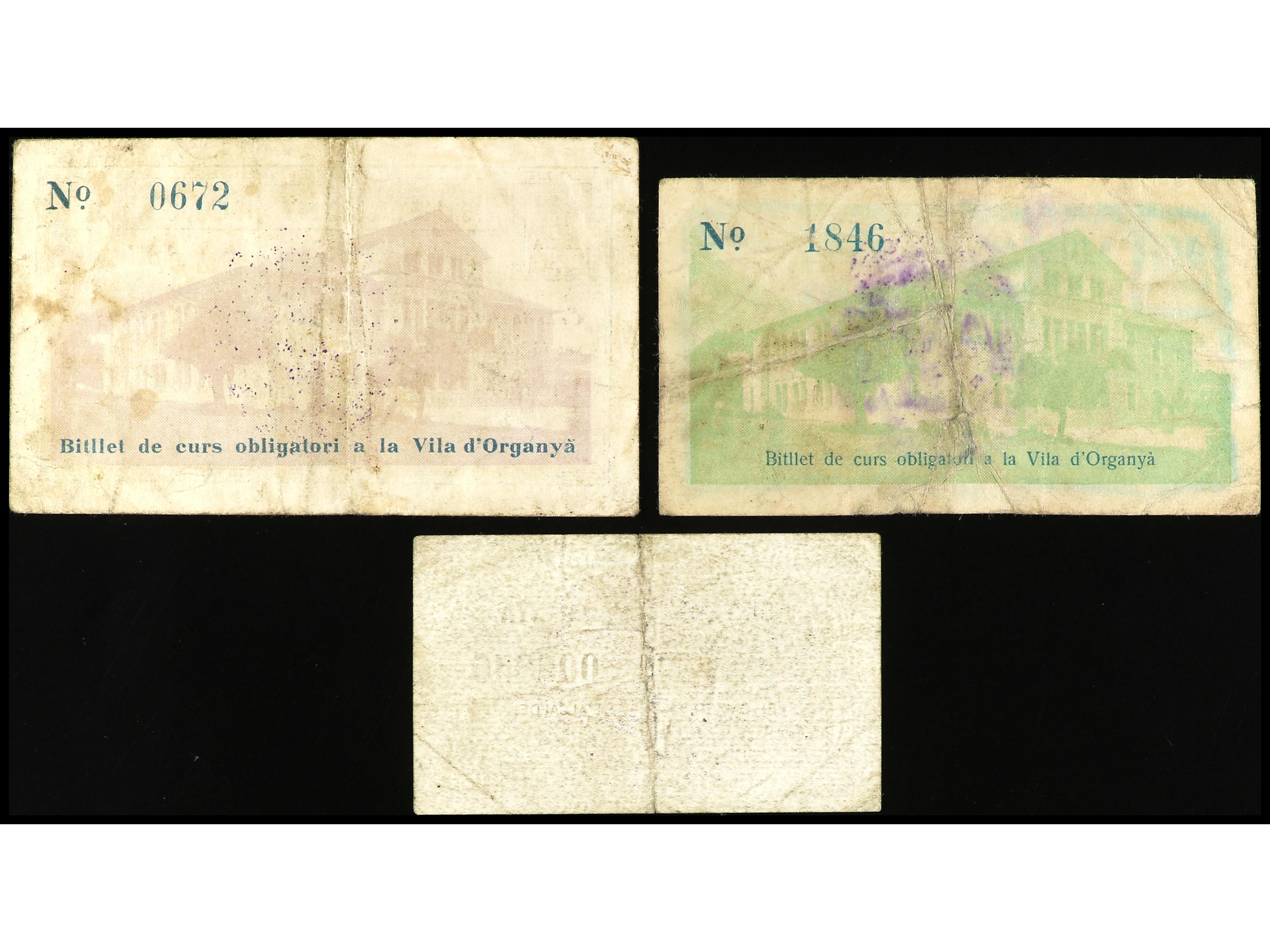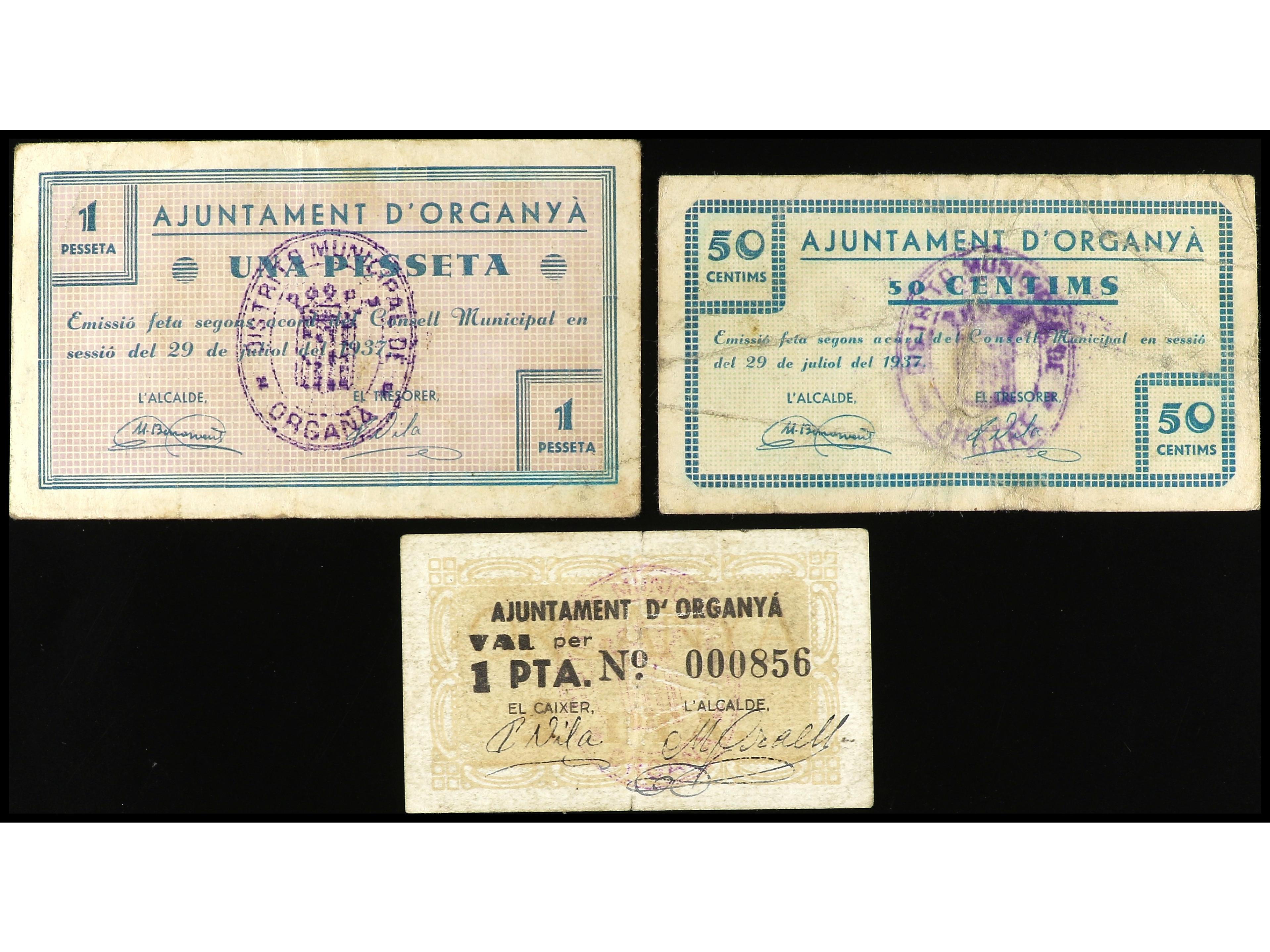 Lote 3 billetes 50 Cèntims y 1 Pesseta. Aj. d´ ORGANYÀ. MUY ESCASOS. AT-1714, 1716, 1717. MBC. (Image1) (Image2)