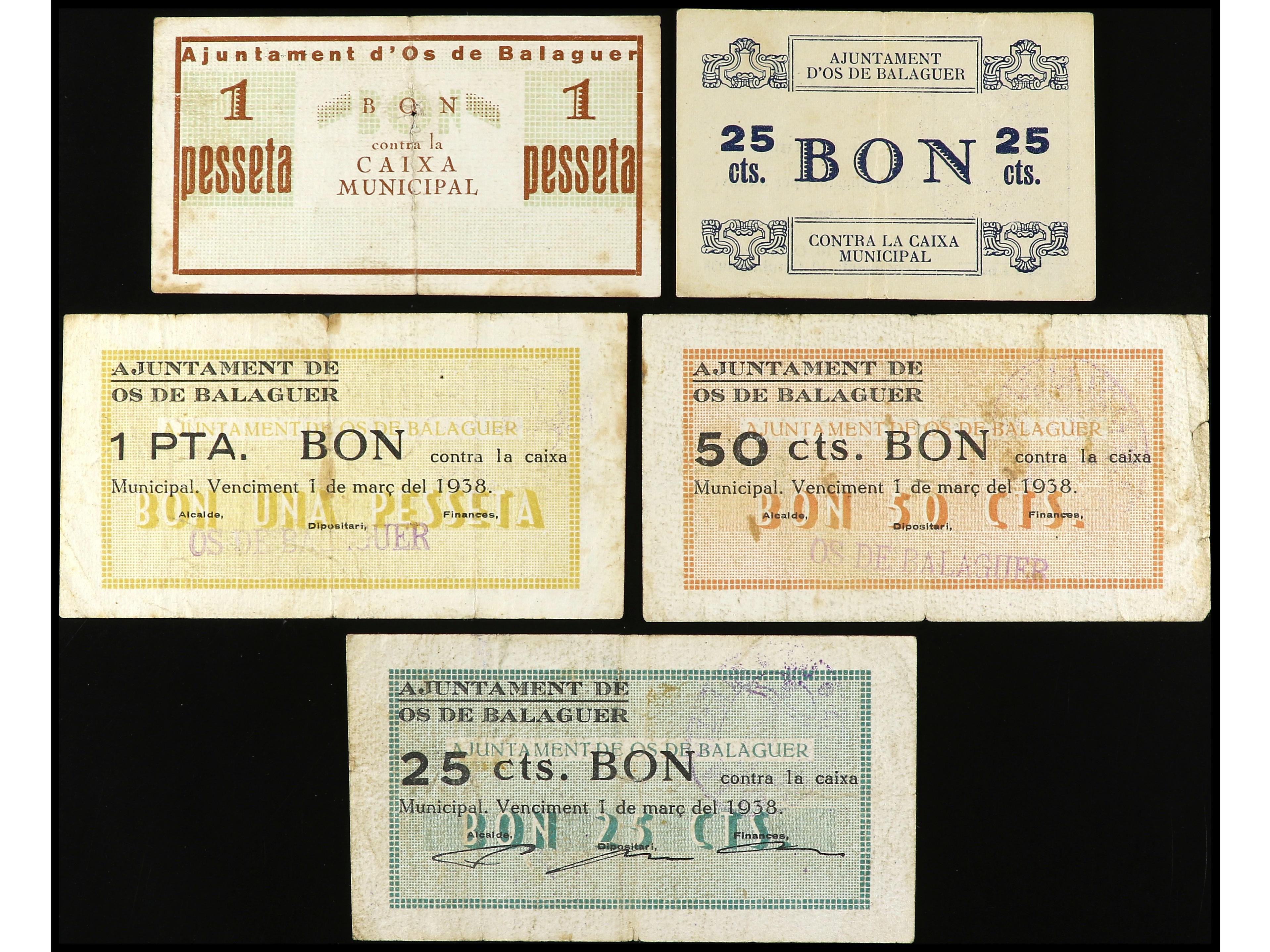 Lote 5 billetes 25 (2) y 50 Cèntims y 1 Pesseta (2). Aj. d´ OS DE BALAGUER. AT-1722/1724, 1725/1726. MBC- a MBC+. (Image1)