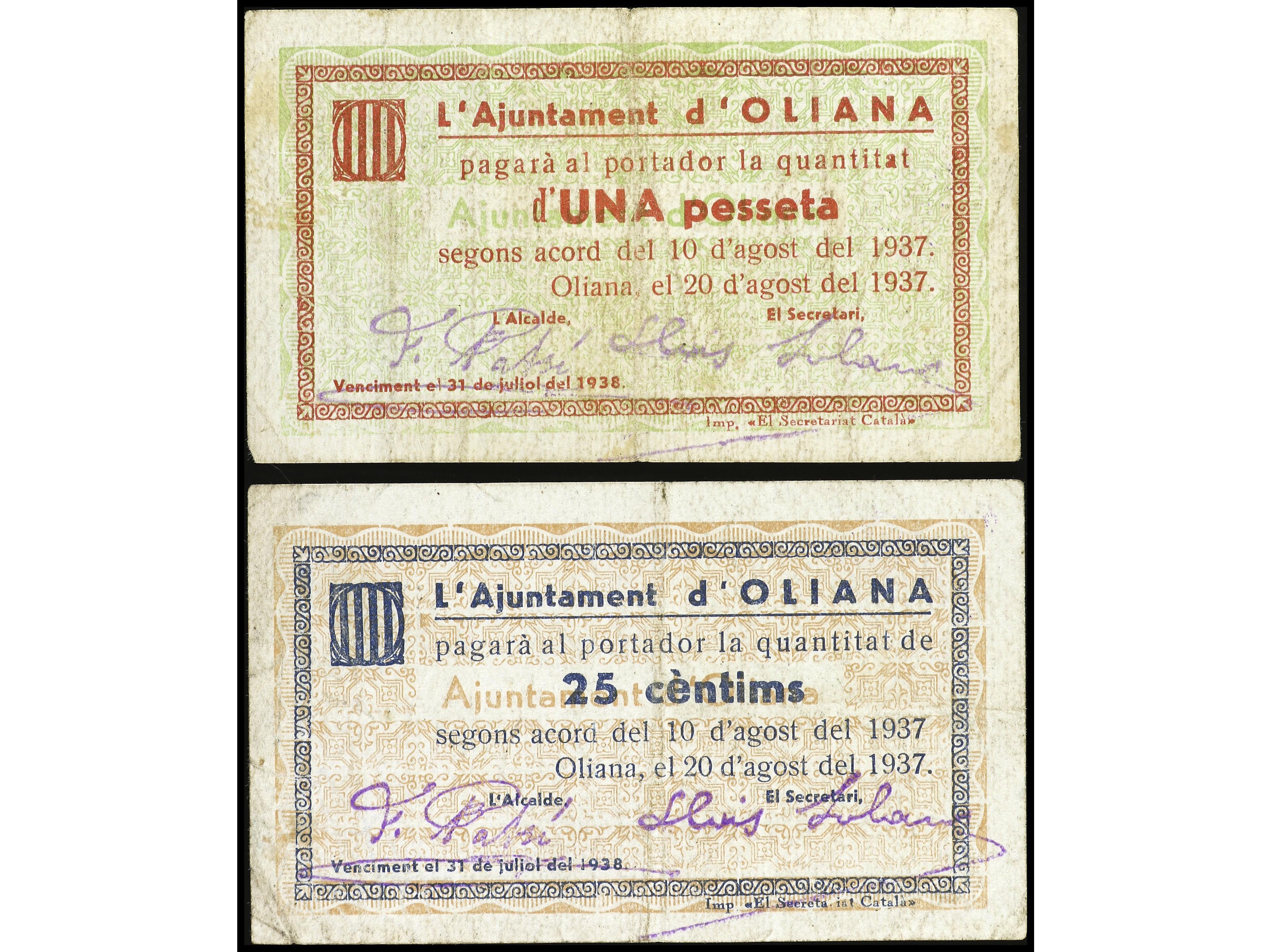 Lote 2 billetes 25 Cèntims y 1 Pesseta. 10 Agost 1937. Aj. d´OLIANA. (Sucios). AT-1688, 1690. MBC. (Image1) (Image2)