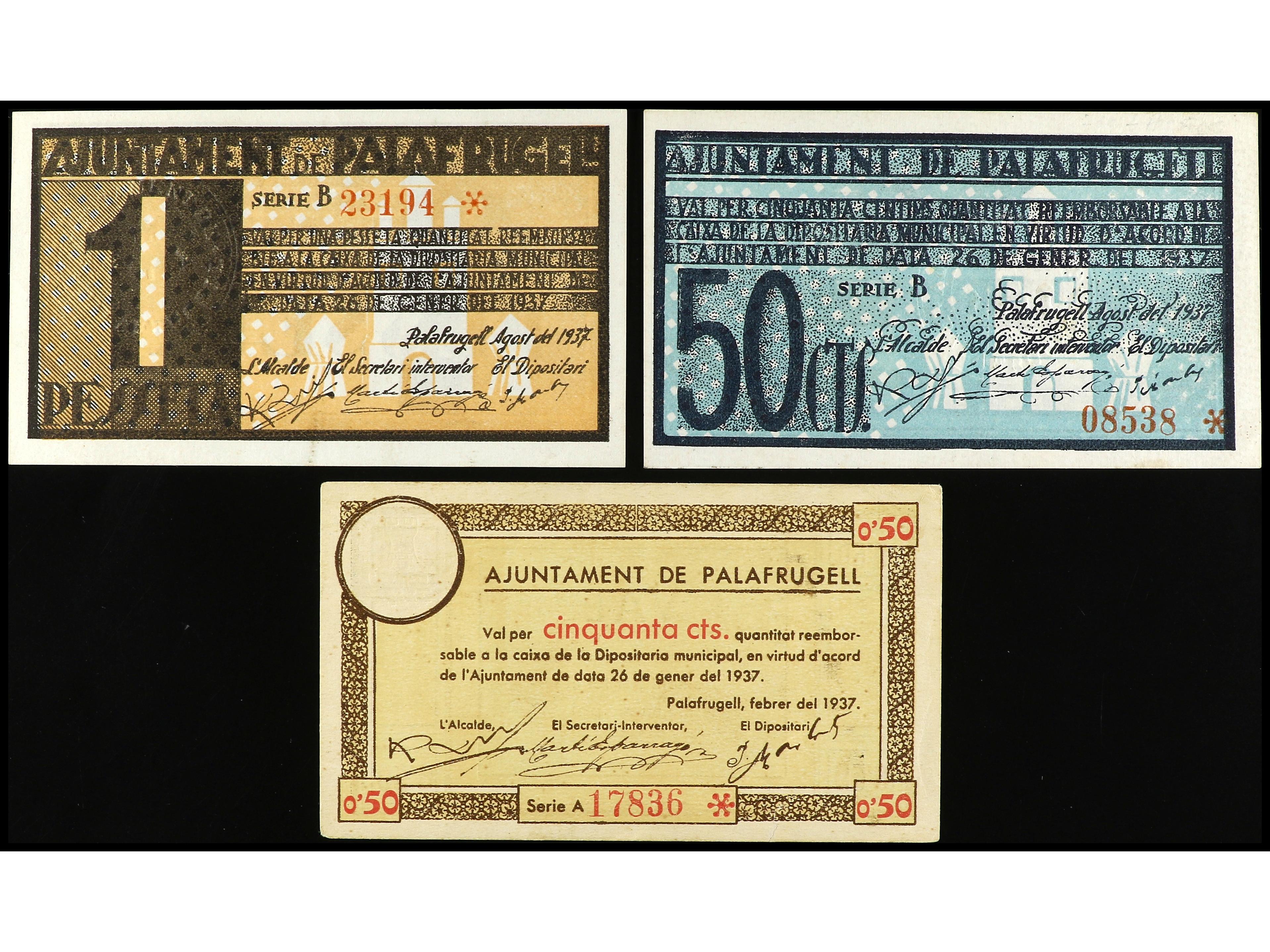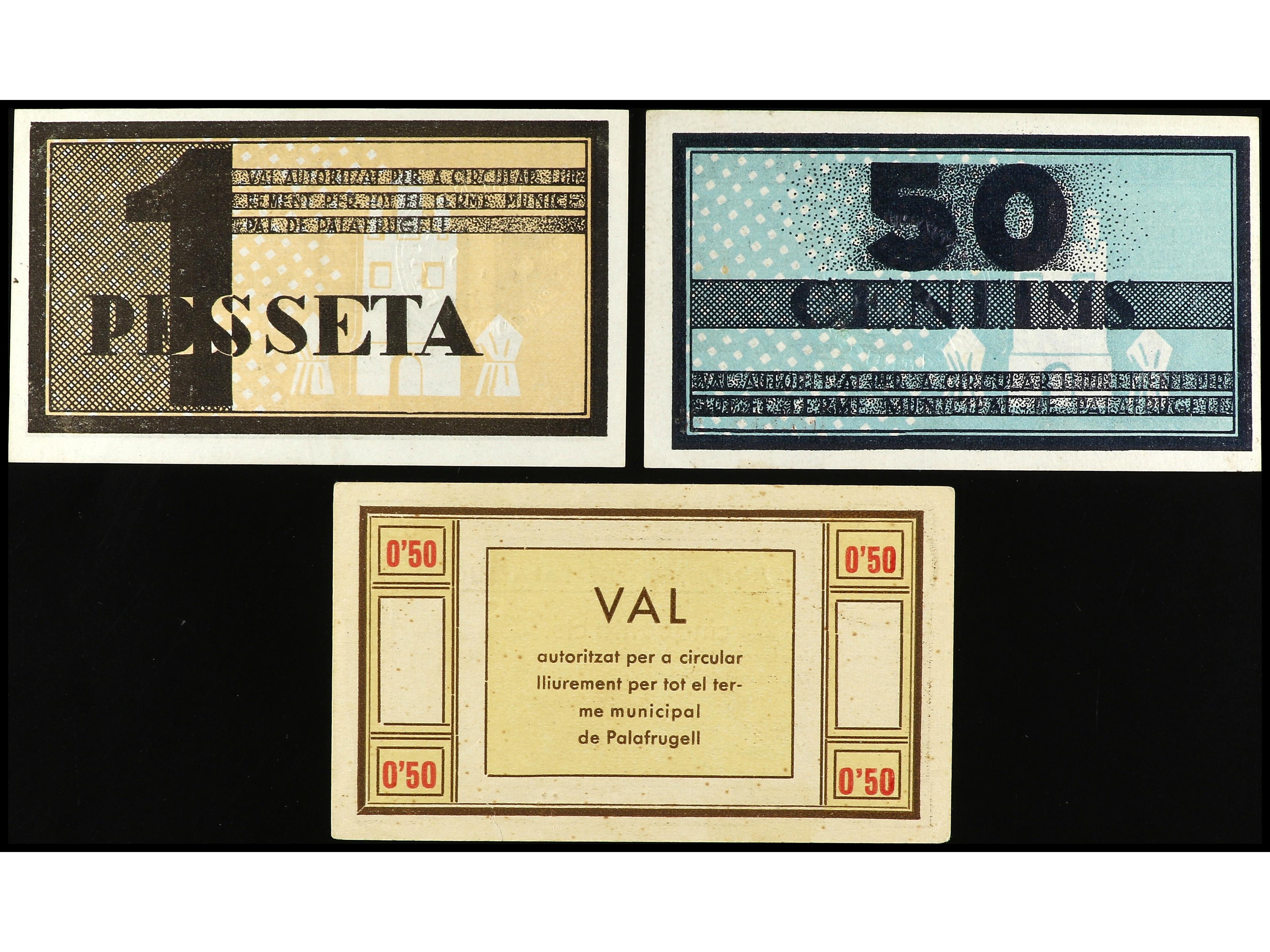 Lote 3 billetes 50 (2) Cèntims y 1 Pesseta. Febrer y Agost de 1937. Aj. de PALAFRUGELL. AT-1741, 1742 y 1743. EBC- a EBC.
