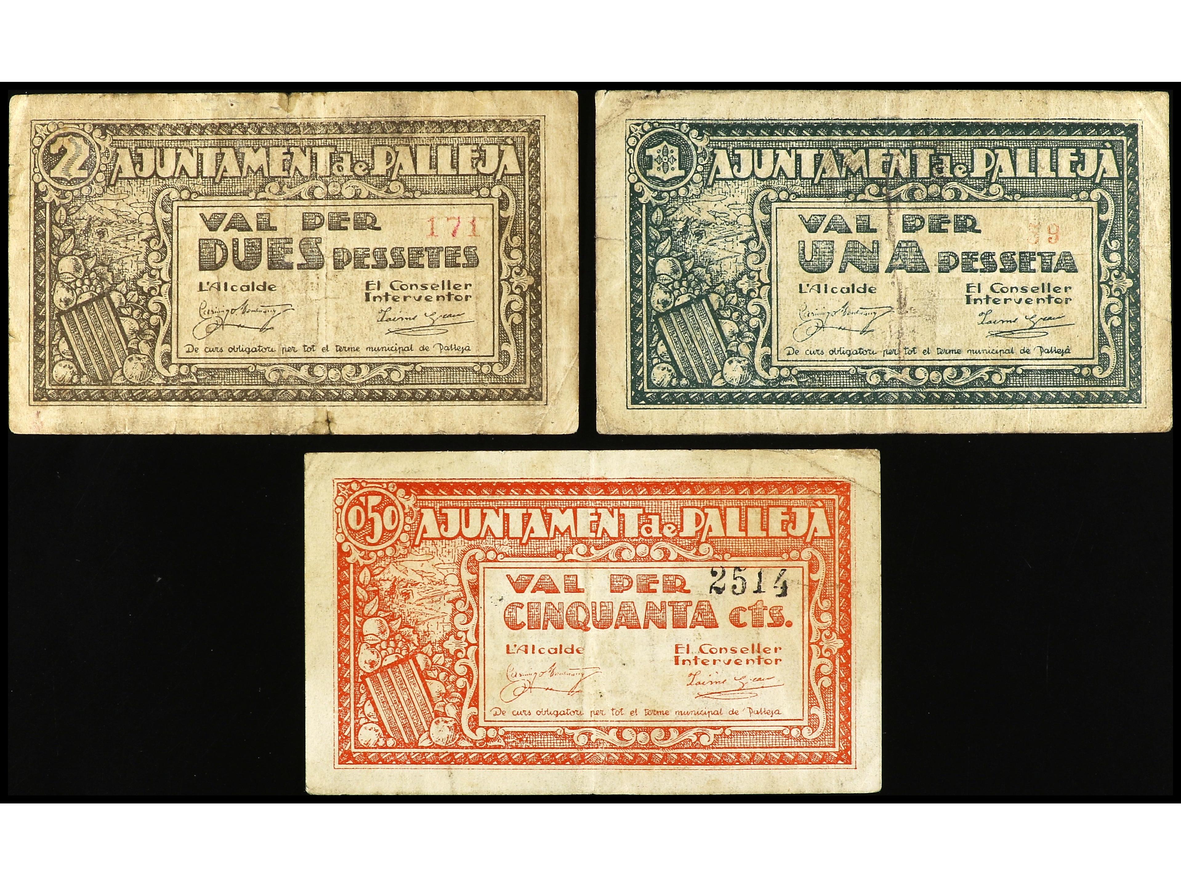 Lote 3 billetes 50 Cèntims 1 y 2 Pessetes. Aj. de PALLEJÀ. AT-1768/70. MBC- a MBC. (Image1) (Image2)