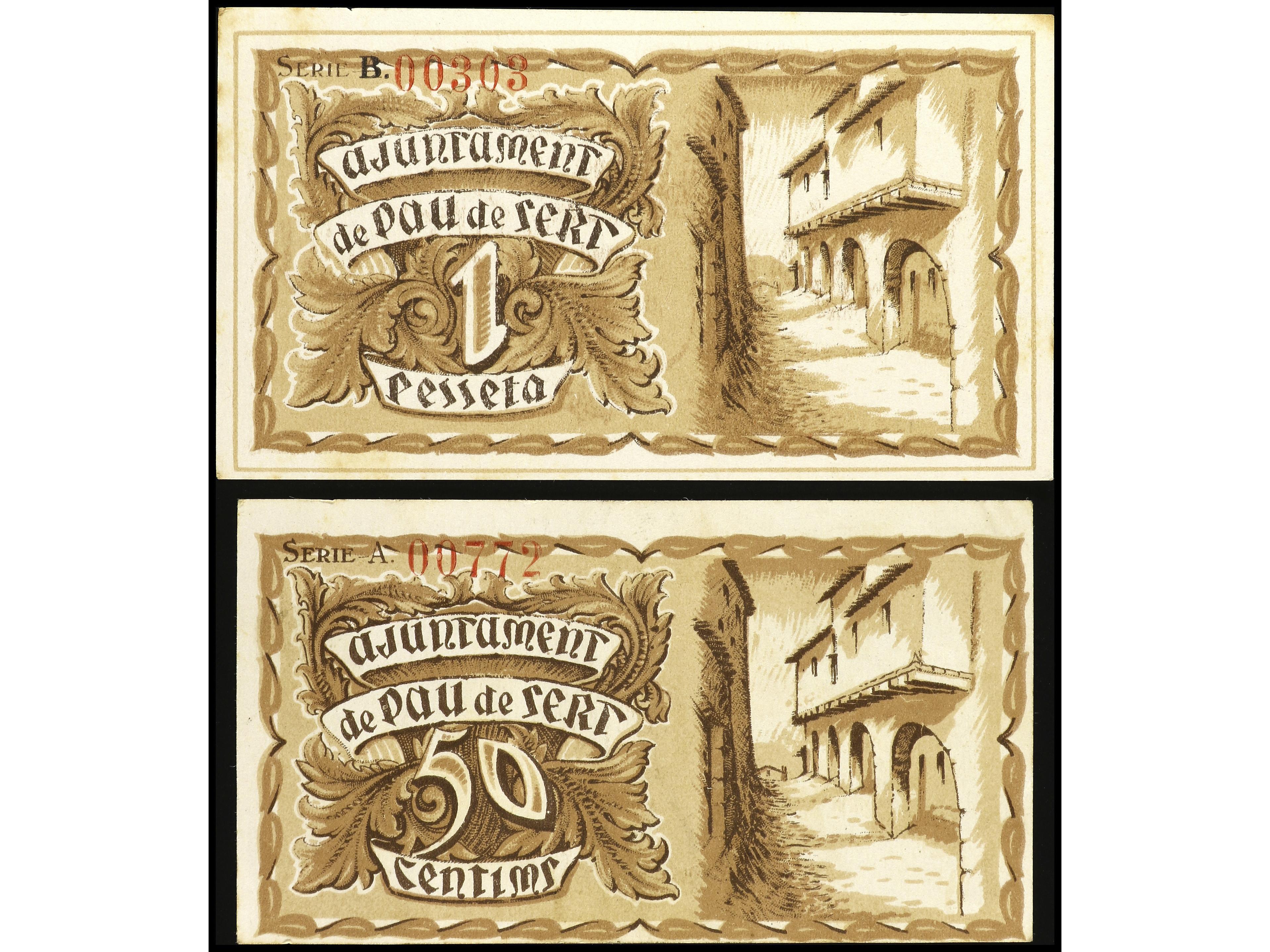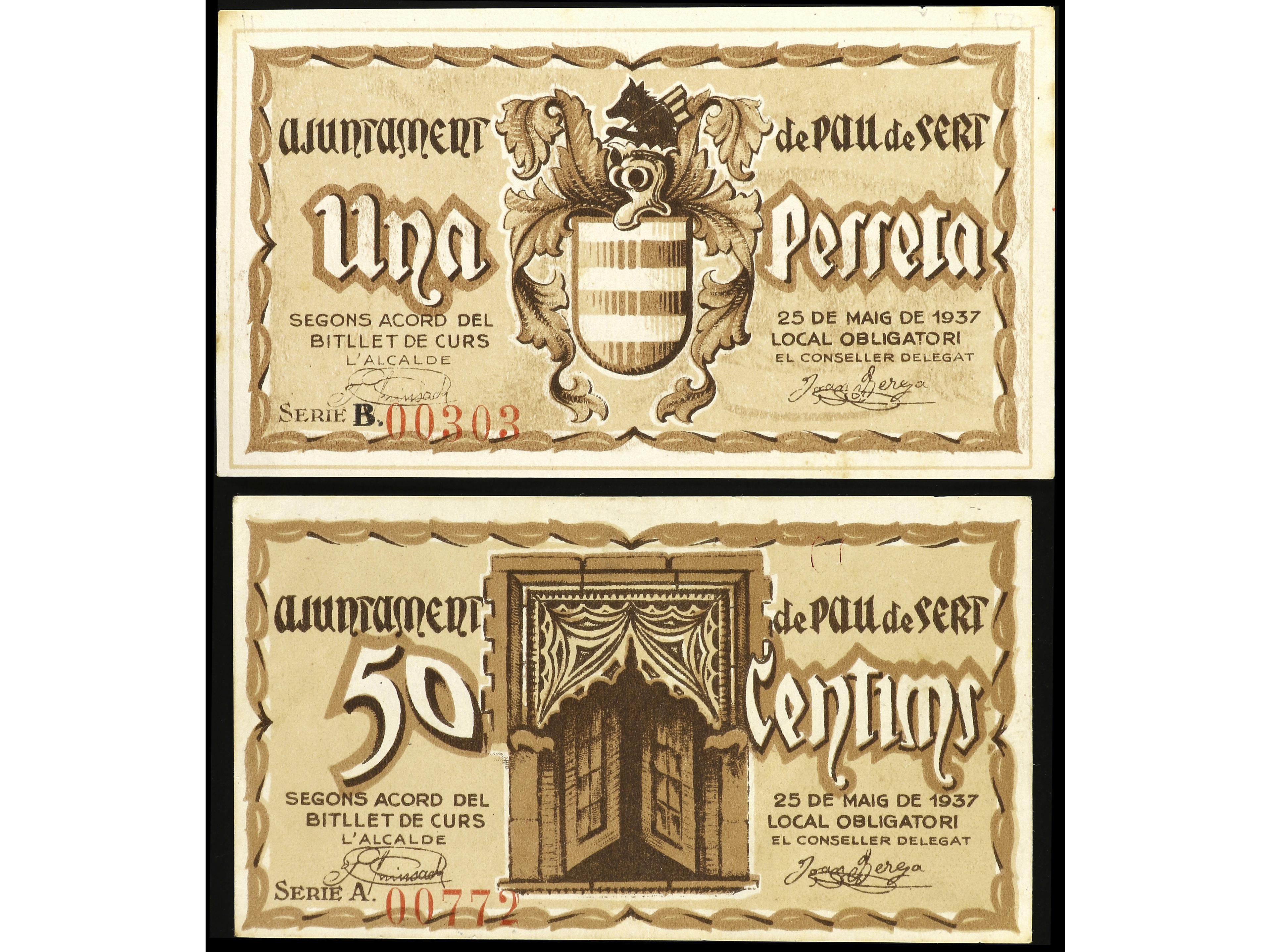Lote 2 billetes 50 Cèntims y 1 Pesseta. 25 Maig 1937. Aj. de PAU DE SERT. AT-1791/1792. EBC- a EBC. (Image1) (Image2)