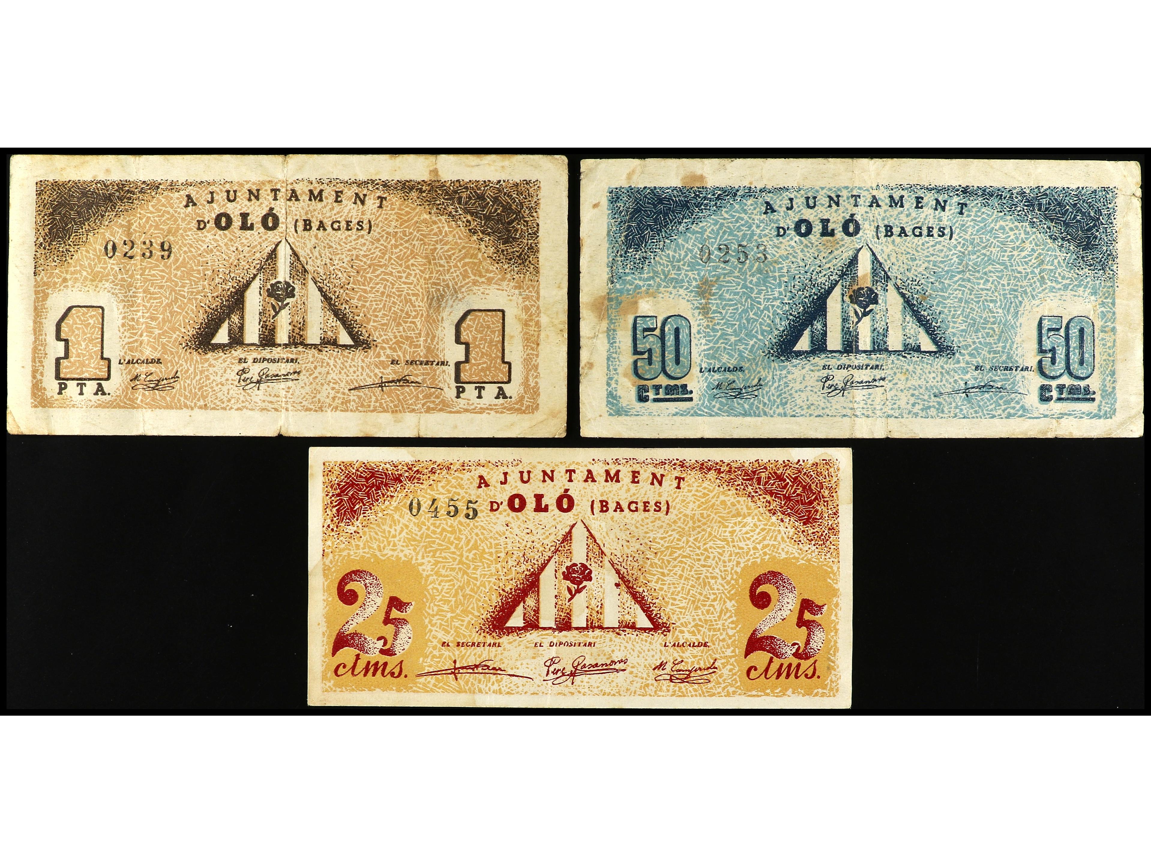 Lote 3 billetes 25, 50 Cèntims y 1 Pesseta. Aj. d´ OLÓ. AT-1691/1693. BC+ a MBC. (Image1) (Image2)