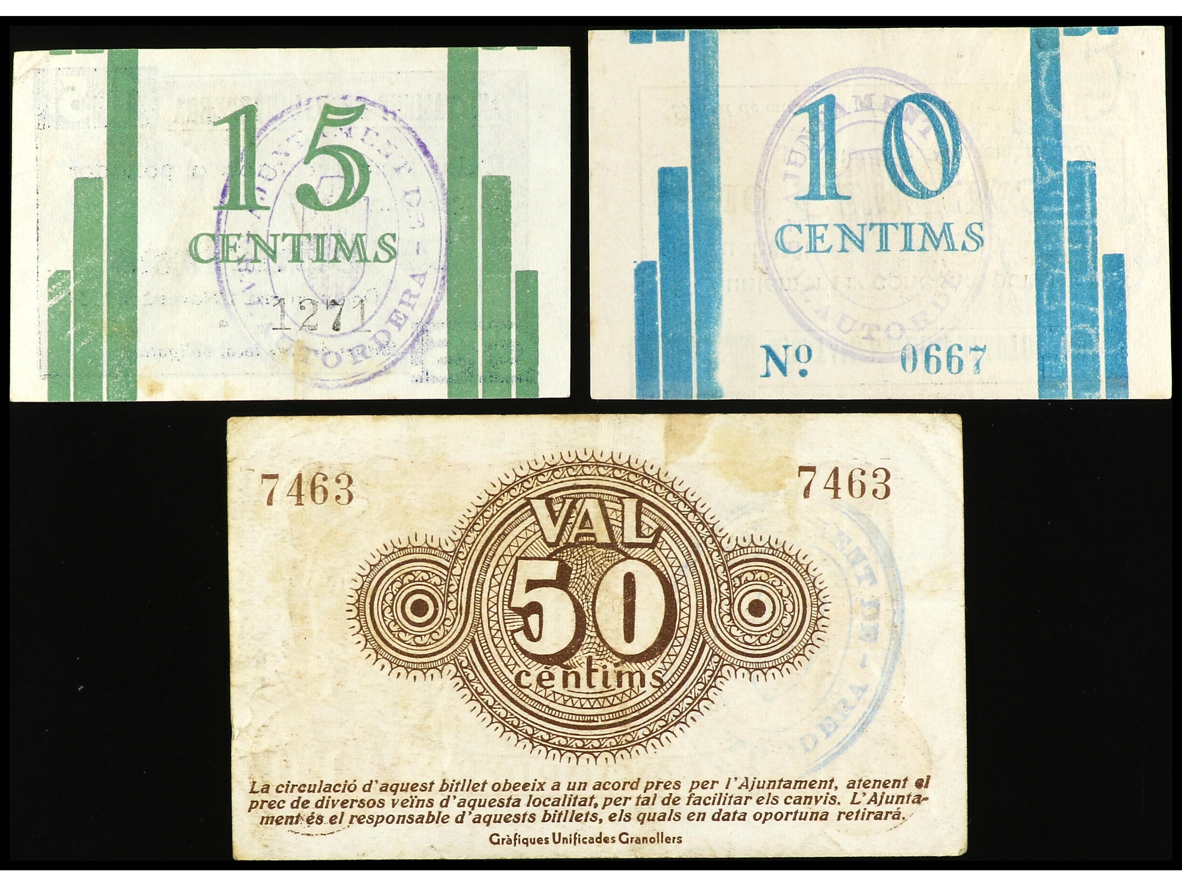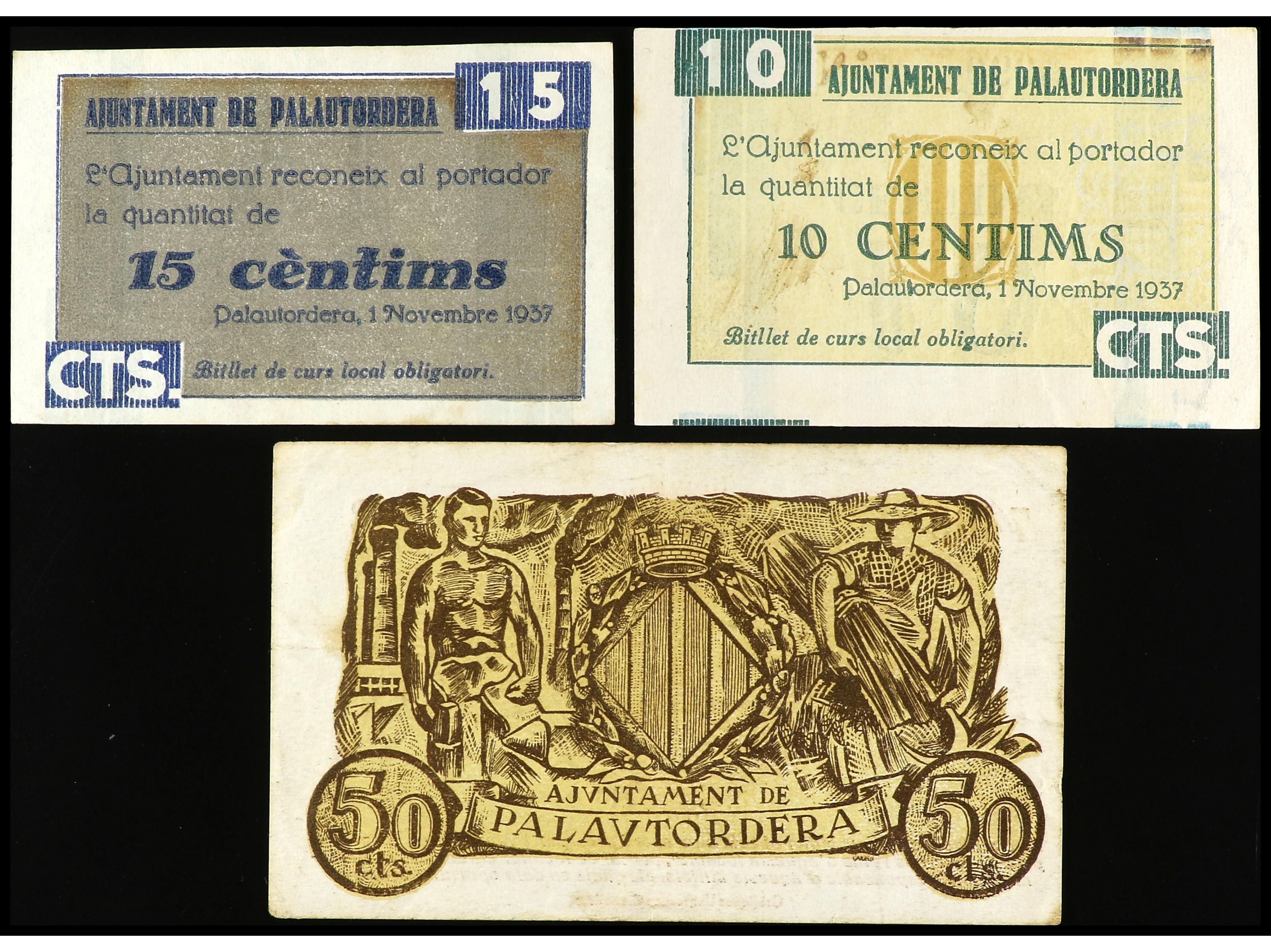 Lote 3 billetes 10, 15 y 50 Cèntims. Aj. de PALAUTORDERA. AT-1765/ 67. MBC a MBC+. (Image1) (Image2)