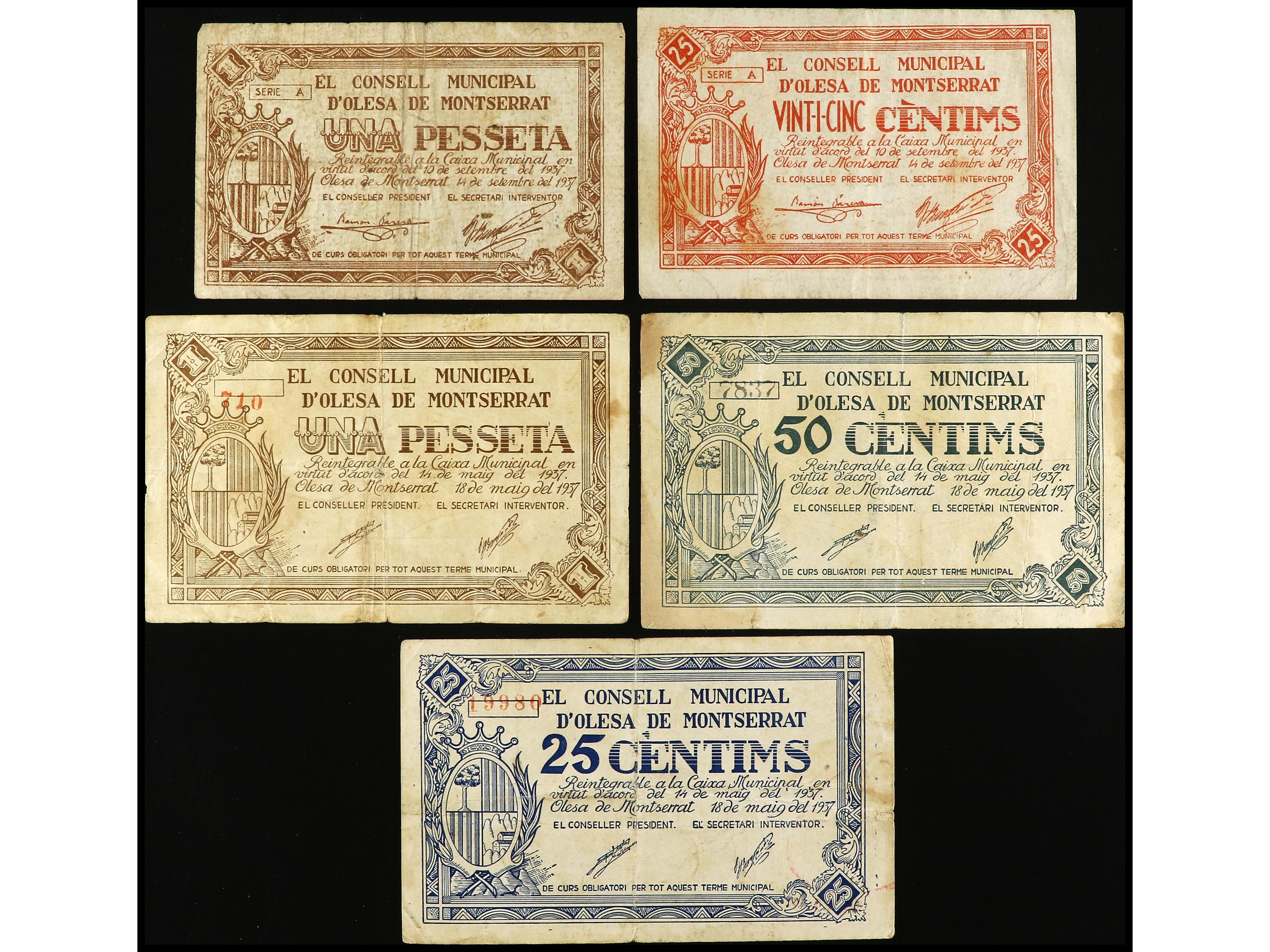 Lote 5 billetes 25 (2), 50 Cèntims y 1 Pesseta (2). Maig y Setembre 1937. C.M. d´ OLESA DE MONTSERRAT. AT-1678/82. MBC.
