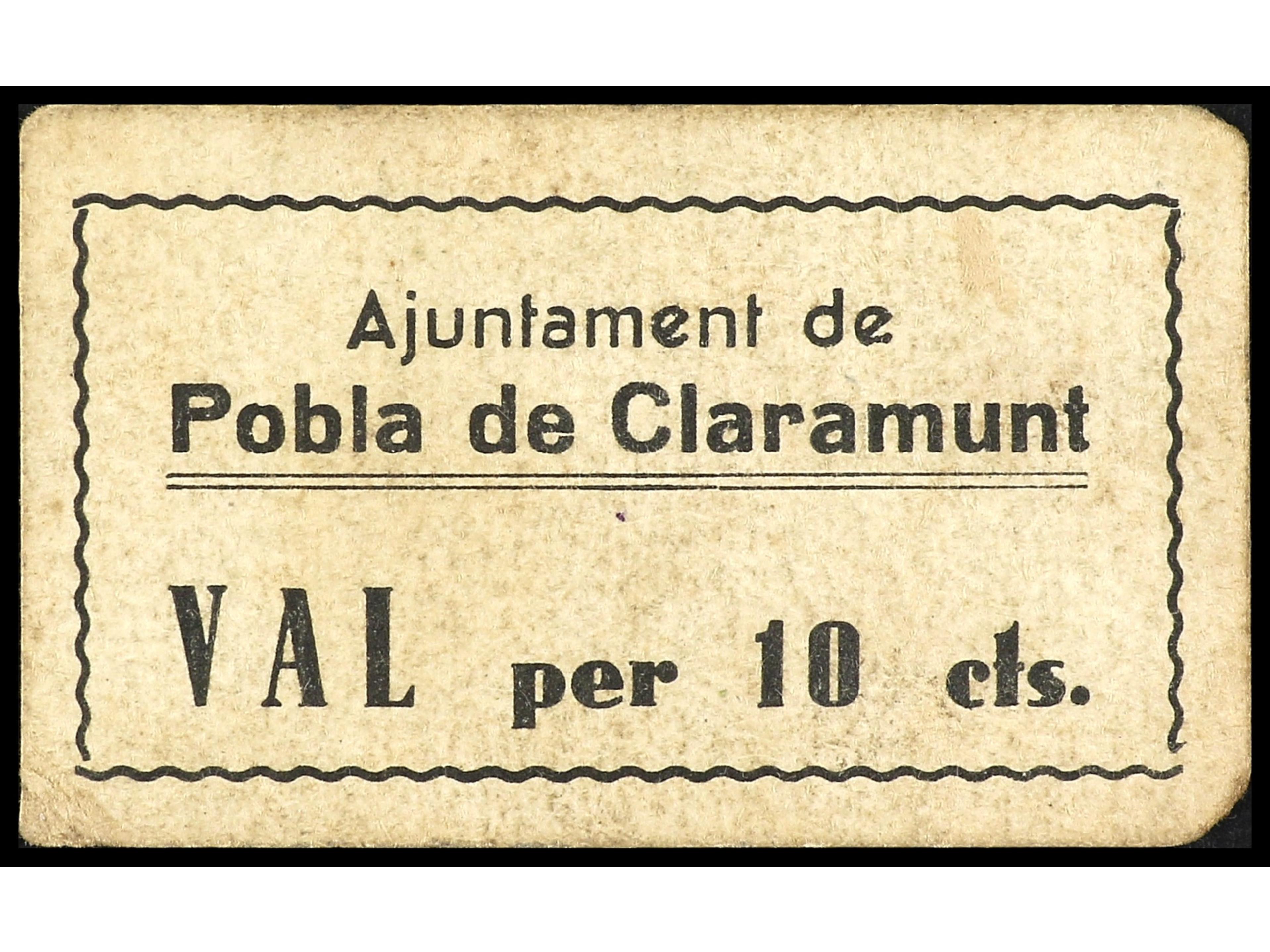 10 Cèntims. Aj. de POBLA DE CLARAMUNT. Cartón. (Alguna leve manchita). MUY ESCASO. AT-1899. EBC-. (Image1) (Image2)