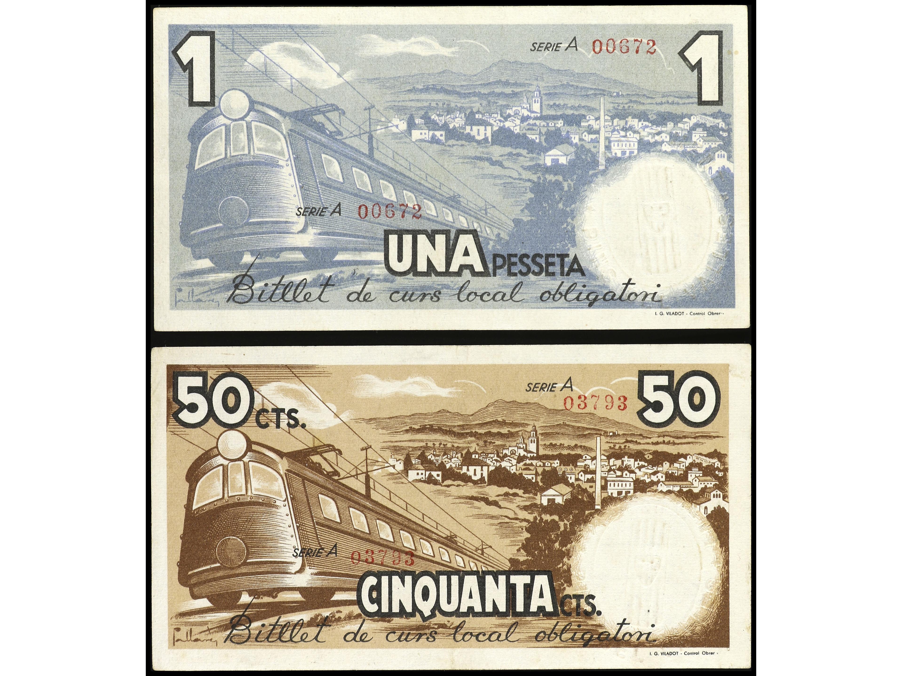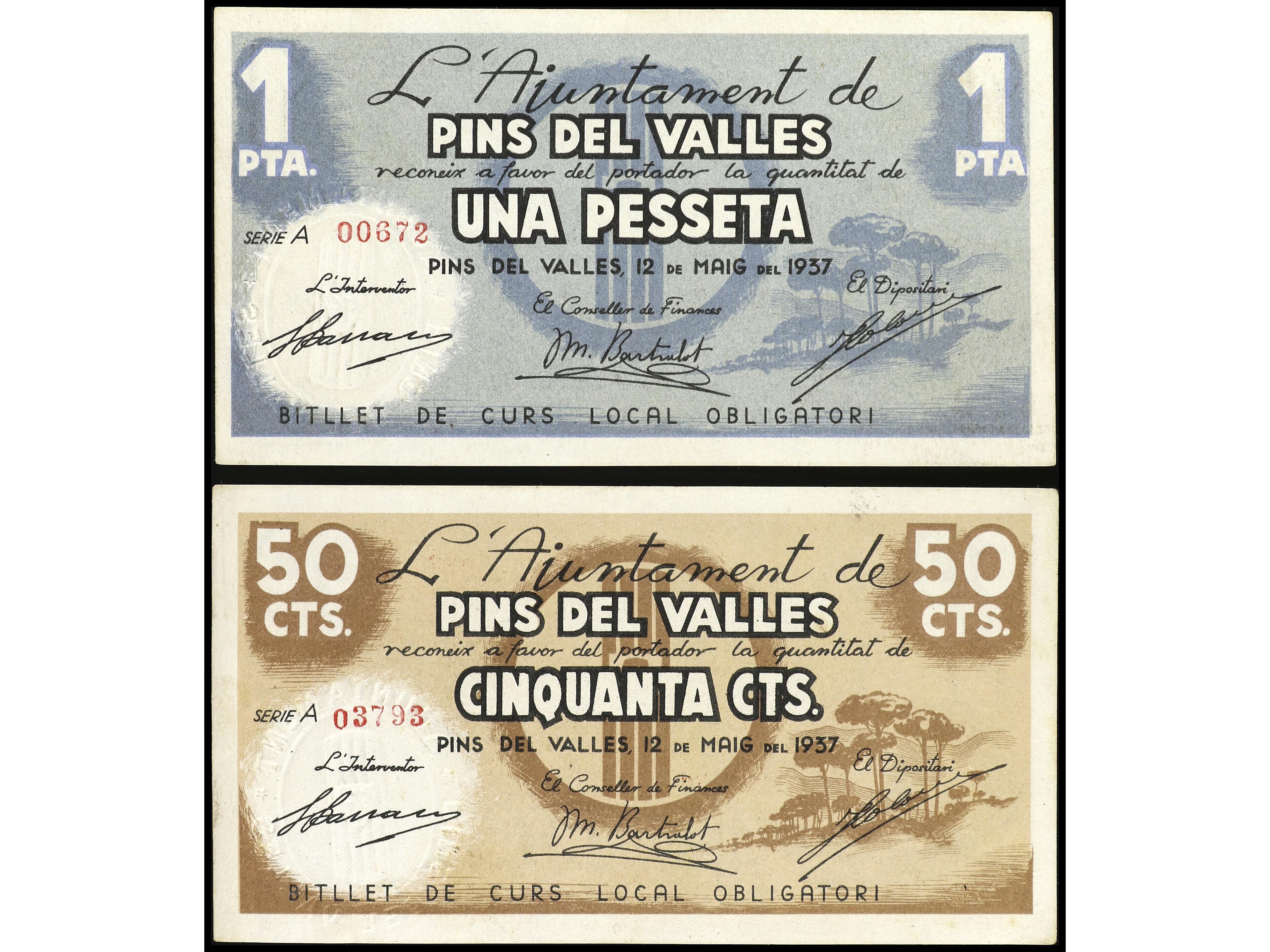 Lote 2 billetes 50 Cèntims y 1 Pesseta. 12 Maig 1937. Aj. de PINS DEL VALLÈS. AT-1843/44. MBC+ a EBC-. (Image1) (Image2)